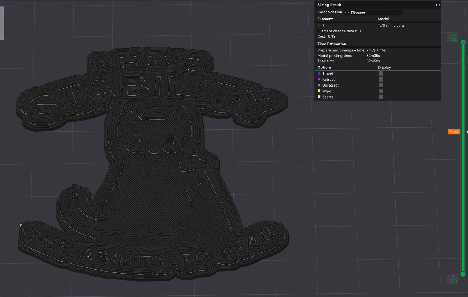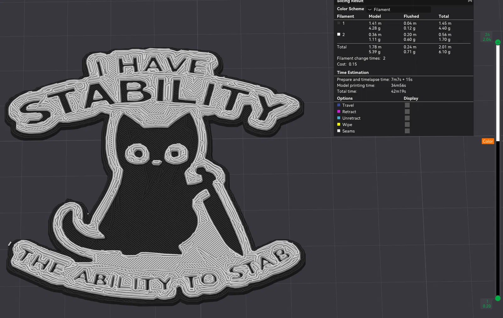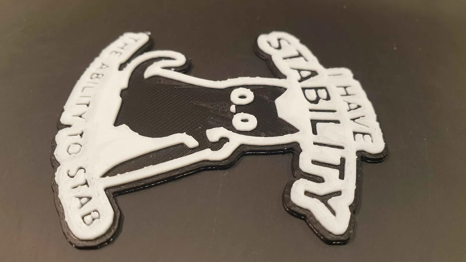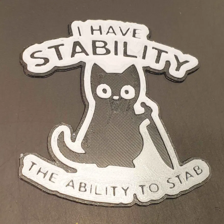 Ảnh 2D được extrude và remesh của một con mèo cầm dao với dòng chữ "i have Stability - the ability to stab" để in 2 màu