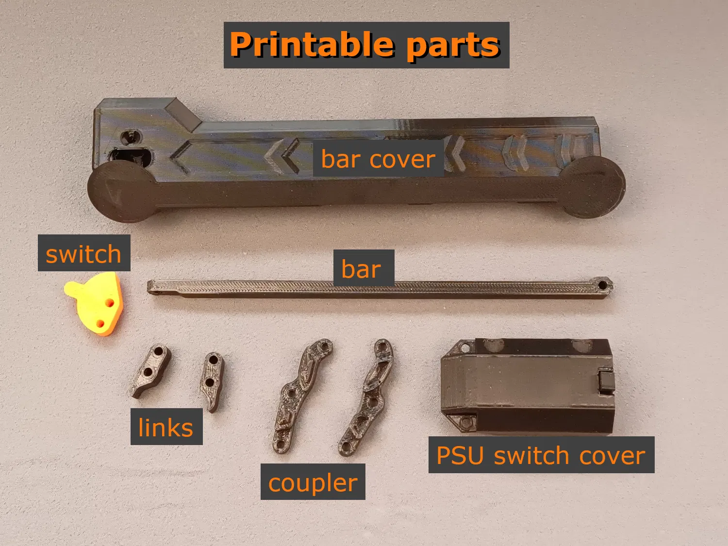 Tuy nhiên, hãy đặc biệt chú ý đến bộ phận "bar cover". Điều cần thiết là các đầu của nó không bị bong lên khỏi khay in trong quá trình in, nếu không hình dạng có thể bị biến dạng. Nhưng đừng lo, tôi cũng đã bao gồm một phiên bản của bộ phận này với các miếng dán hỗ trợ thêm trong tệp. Tôi khuyên anh em nên sử dụng phiên bản này để in. (xem thêm video)