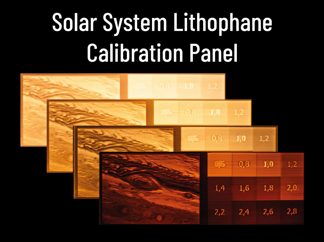Hai mẫu được cung cấp ở đây là những bản in thử nghiệm đơn giản để xem ảnh lithophane của bạn sẽ ra sao với một loại sợi nhựa (filament) và nguồn sáng cụ thể. Tất cả các Đèn thuộc Bộ sưu tập Đèn Hành tinh Lithophane đều sử dụng độ dày tường tối đa là 0.6mm và độ dày tối đa là 2.8mm. Phần bên phải của tấm hiệu chuẩn (có trong cả phiên bản độc lập và phiên bản Sao Mộc) hiển thị các độ dày này với các bước tăng 0.2mm. Phần bên trái tùy chọn (phiên bản Sao Mộc) hiển thị một phần nhỏ của đèn Sao Mộc.