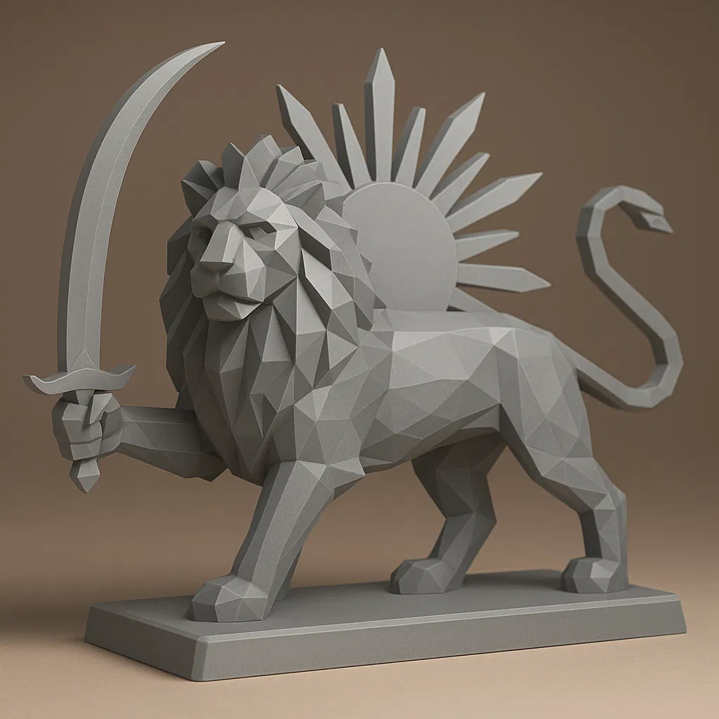 Mẫu in 3D low-poly Sư Tử và Mặt Trời, biểu tượng Ba Tư cổ đại từng xuất hiện trên quốc kỳ Iran. Với thanh kiếm và mặt trời cách điệu, đây là điểm nhấn trang trí độc đáo, dễ in và tùy chỉnh.