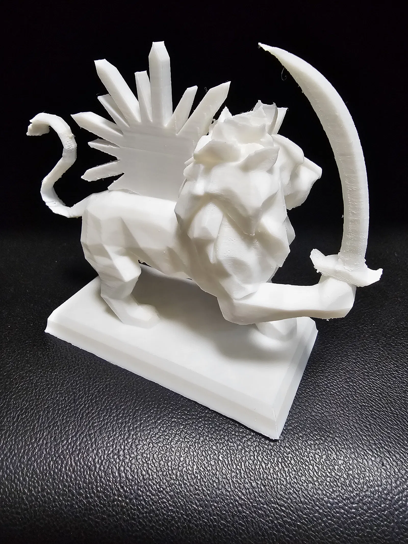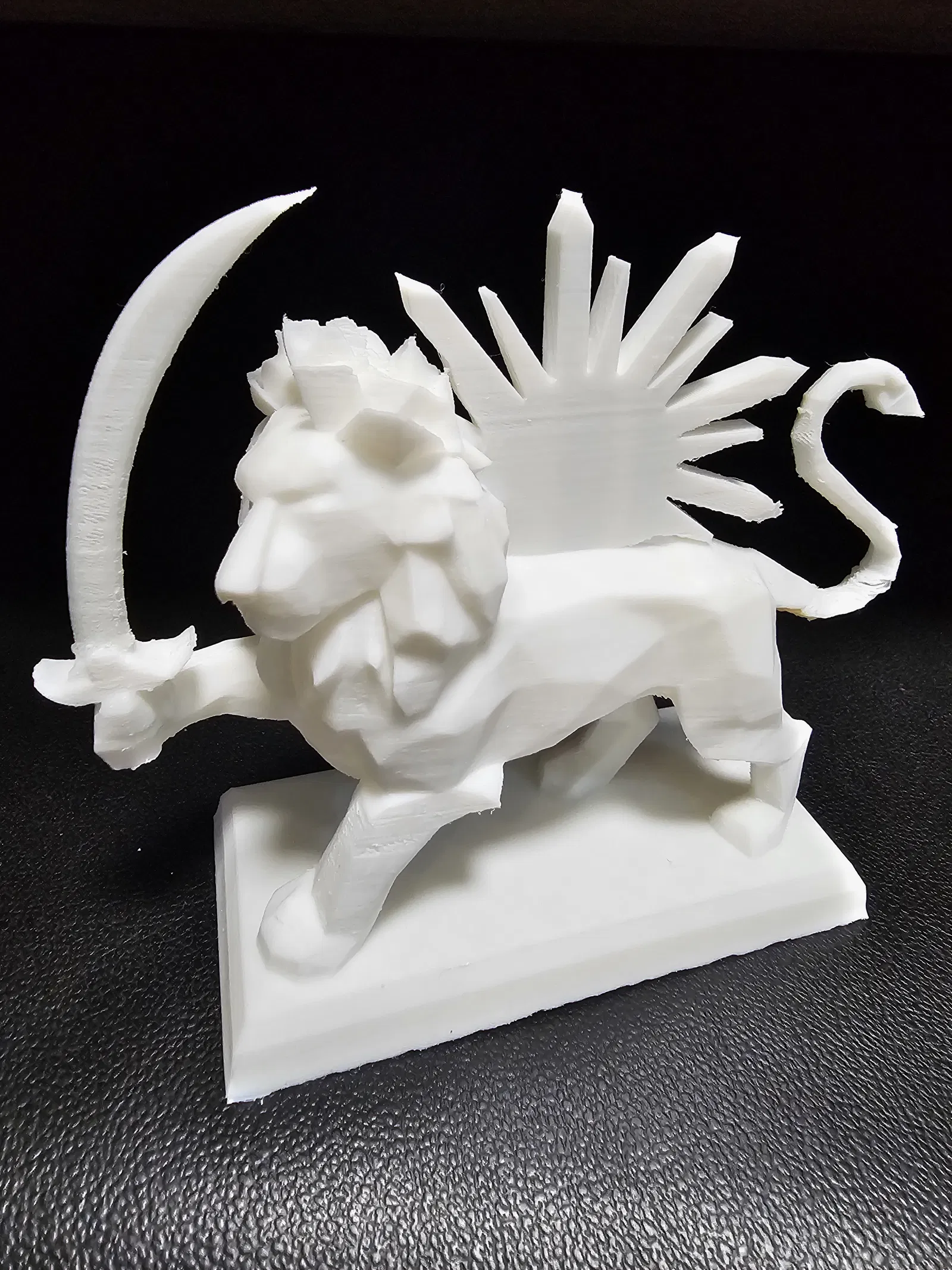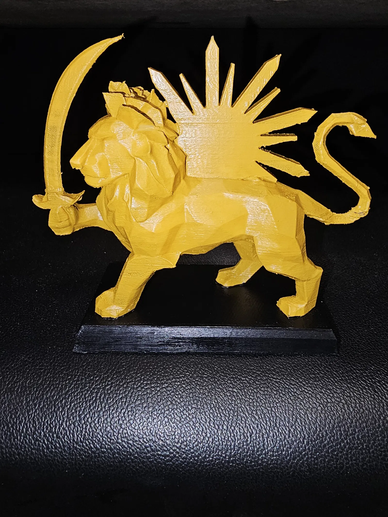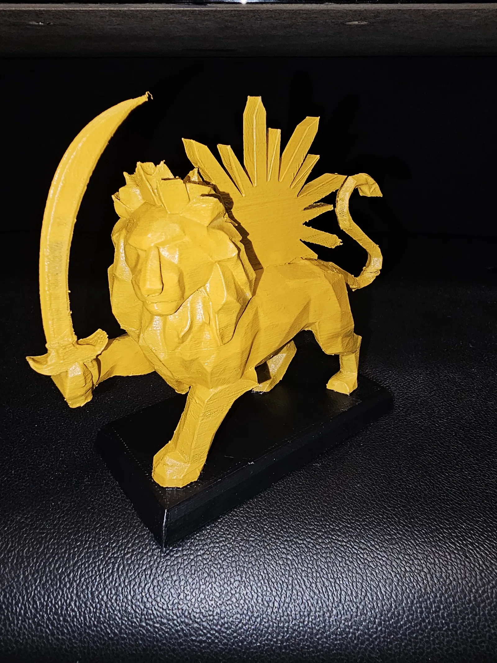 Đây là mẫu in 3D theo phong cách low-poly của Sư Tử và Mặt Trời, một biểu tượng Ba Tư cổ đại từng xuất hiện trên quốc kỳ Iran. Sư tử cầm một thanh kiếm, với một mặt trời cách điệu phía sau – một phiên bản hình học hiện đại của một biểu tượng văn hóa cổ điển.