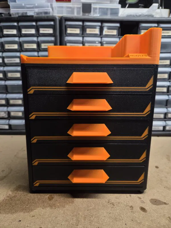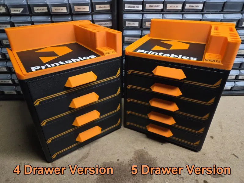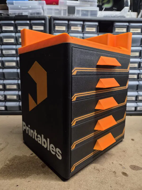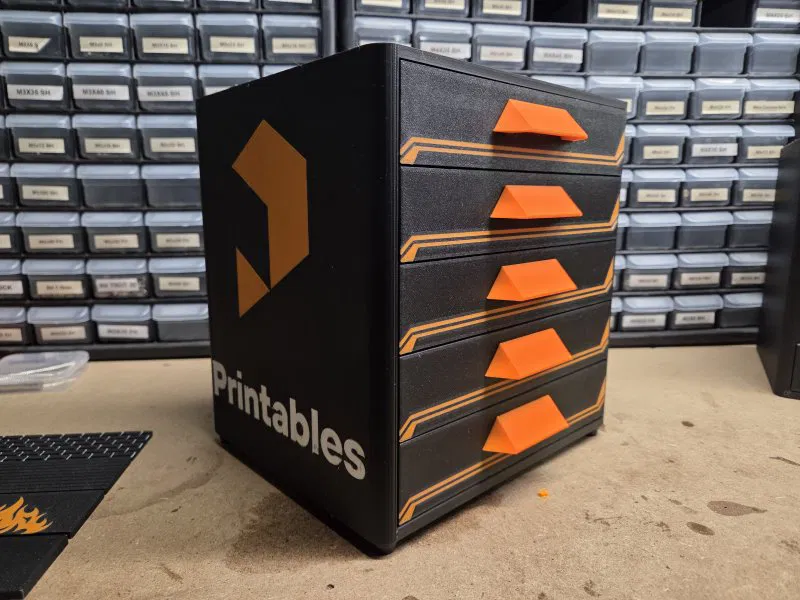 Tủ lưu trữ này đủ rộng rãi để chứa tất cả các bộ phận nhỏ cho máy in 3D hoặc các sở thích khác của bạn. Phiên bản Gen.2 có mặt ngăn kéo riêng biệt, nam châm giữ cửa, và tương thích với chuẩn Gridfinity.