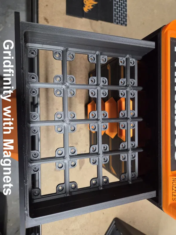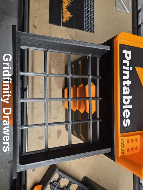 • Kích thước tủ đã được điều chỉnh để phù hợp với chuẩn Gridfinity trong ngăn kéo. Nhờ vậy, bạn có thể tải về bao nhiêu ngăn kéo tùy thích để dùng với tủ này.