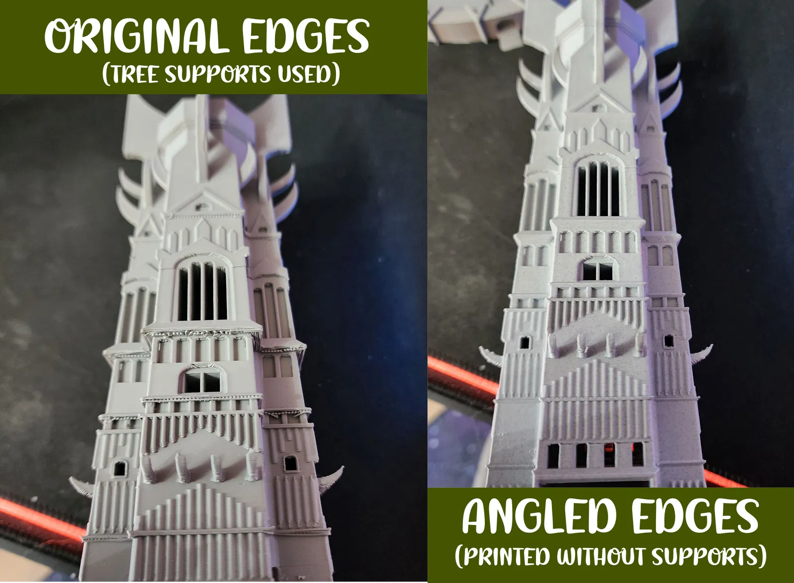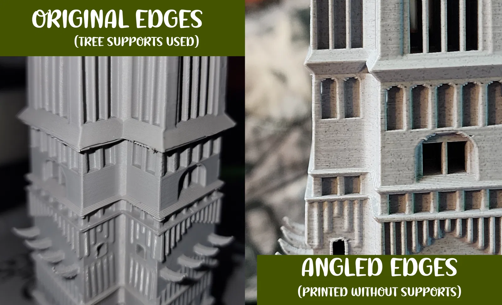 Vì vậy, tôi đã thực hiện một vài thay đổi nữa với hy vọng cũng cải thiện khả năng in - và nó thực sự hiệu quả! Tôi đã cắt tất cả các "mép" theo một góc và chúng giờ đây được in không cần bộ phận hỗ trợ và tạo ra các cạnh sạch sẽ, kết nối. Tôi cũng cắt mặt dưới của "cánh" ở trên cùng theo một góc hơi cao hơn, tạo ra mặt dưới mịn màng hơn đáng kể. Ngoài ra, tôi cũng cắt bớt một phần nhỏ các đỉnh cao nhất vì vài mm cuối cùng mỏng và sẽ vỡ ra ngay lập tức khi cầm. Ban đầu tôi kỳ vọng rằng cây cầu bắc qua cửa vẫn cần bộ phận hỗ trợ nhưng tôi đã in thử riêng phần đó mà không cần gì và bây giờ tôi khá tự tin rằng _toàn bộ tháp sẽ được in mà không cần bộ phận hỗ trợ.