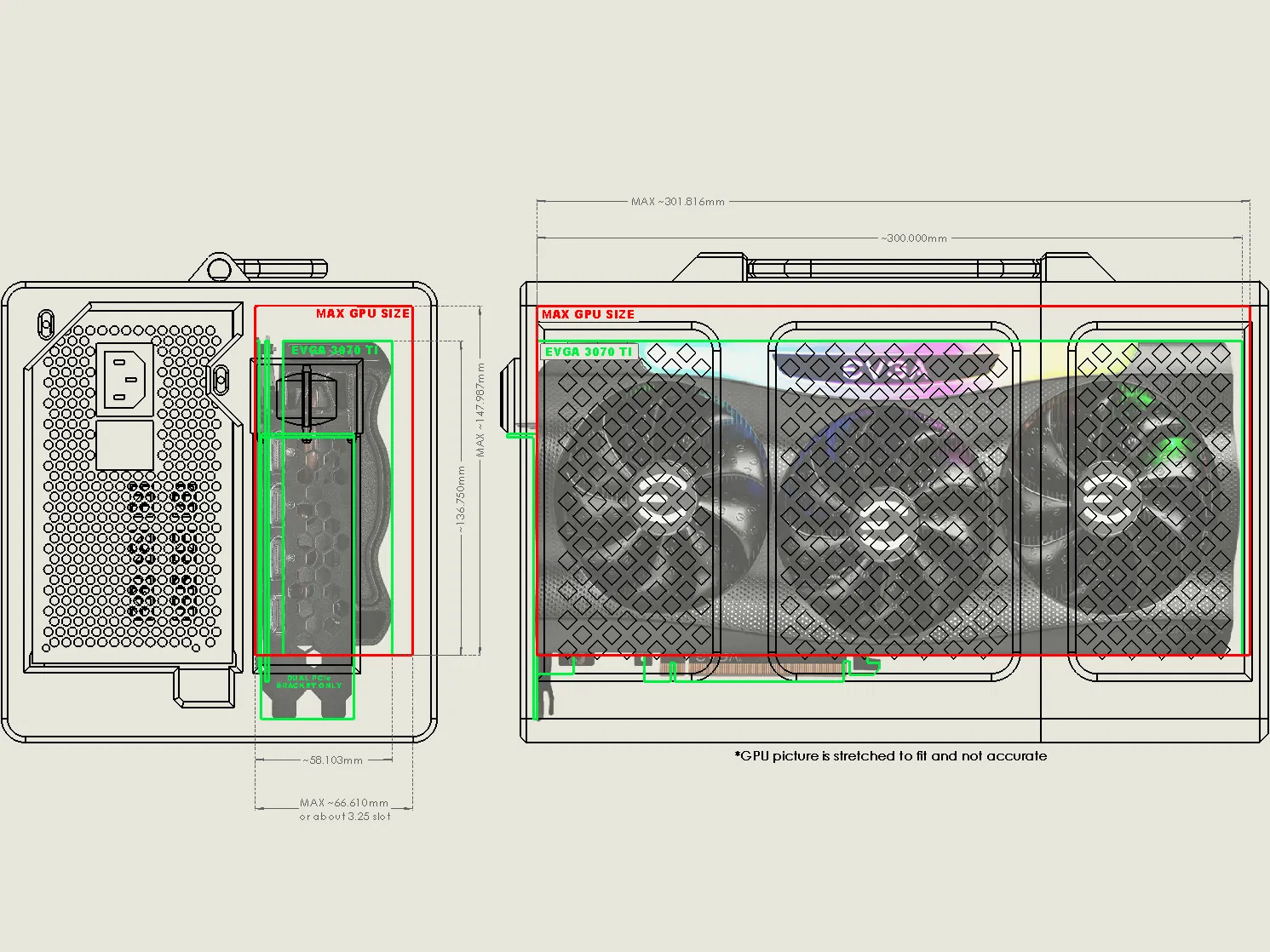 Thiết kế cho PSU full size ATX và GPU dual PCIe bracket