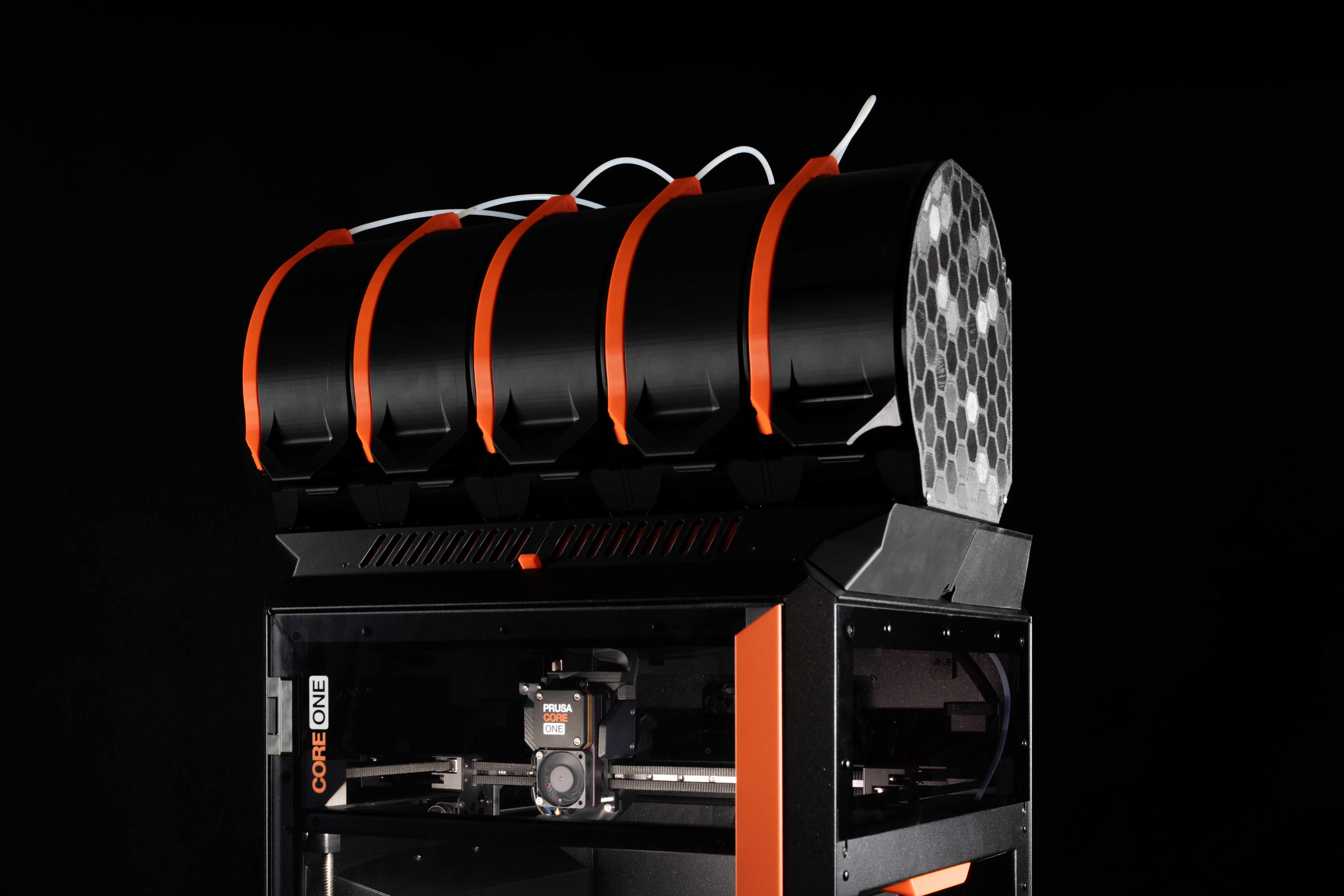 Đây là phiên bản Prusa CORE One MMU3 của tôi – xin giới thiệu Community version! Bộ này gắn toàn bộ cụm MMU3 trực tiếp lên trên máy in, kèm theo bộ đệm tích hợp và chỗ giữ cuộn dây.