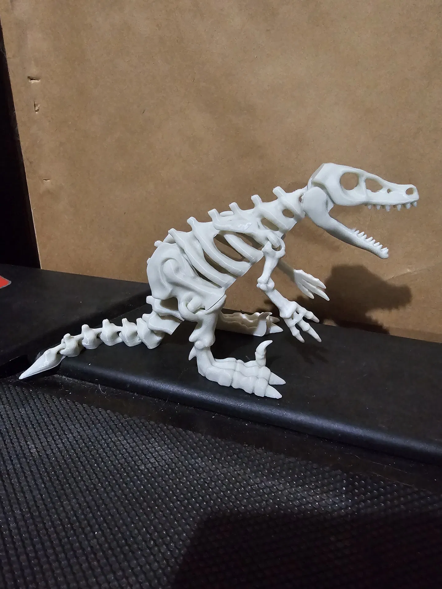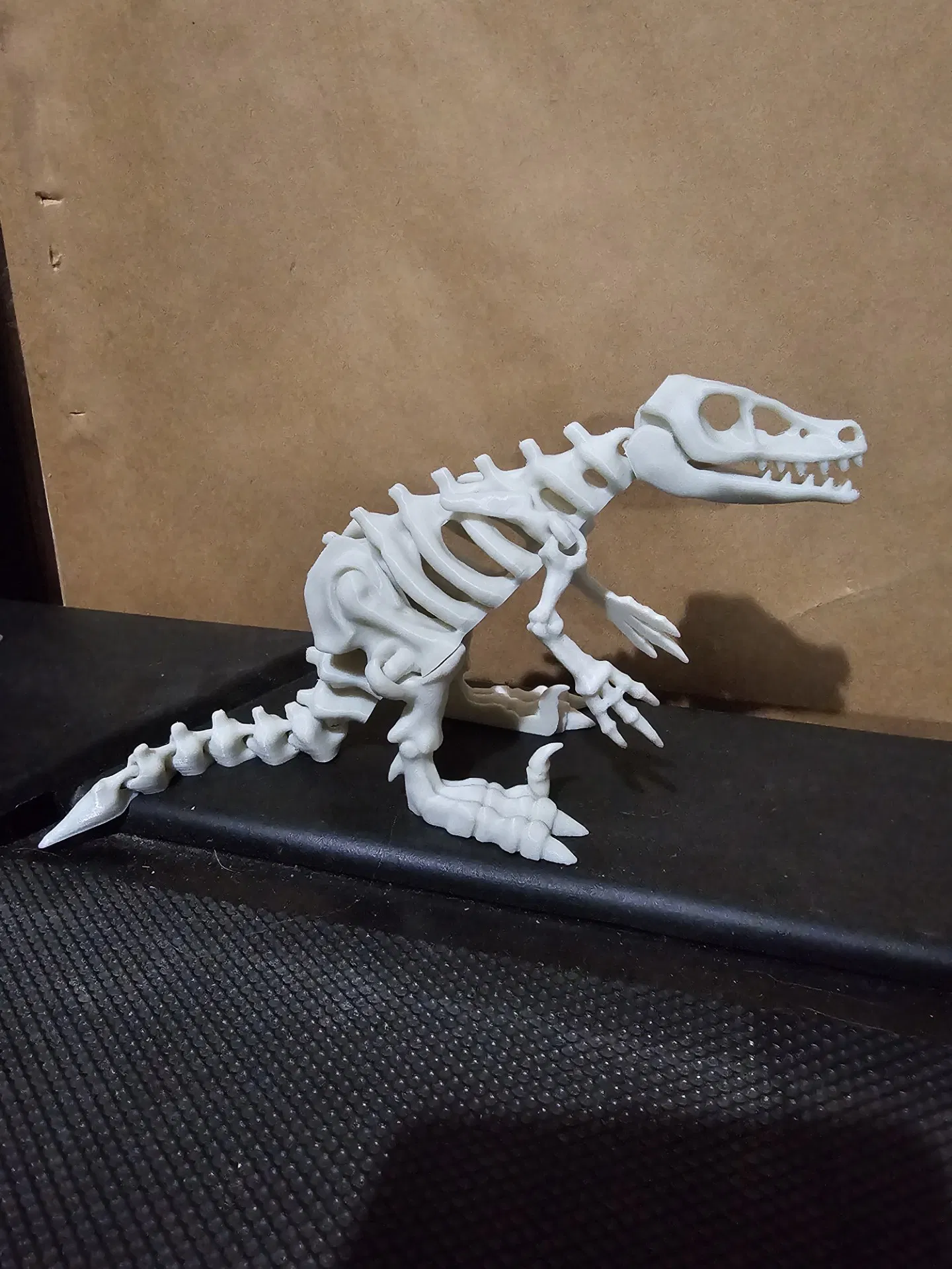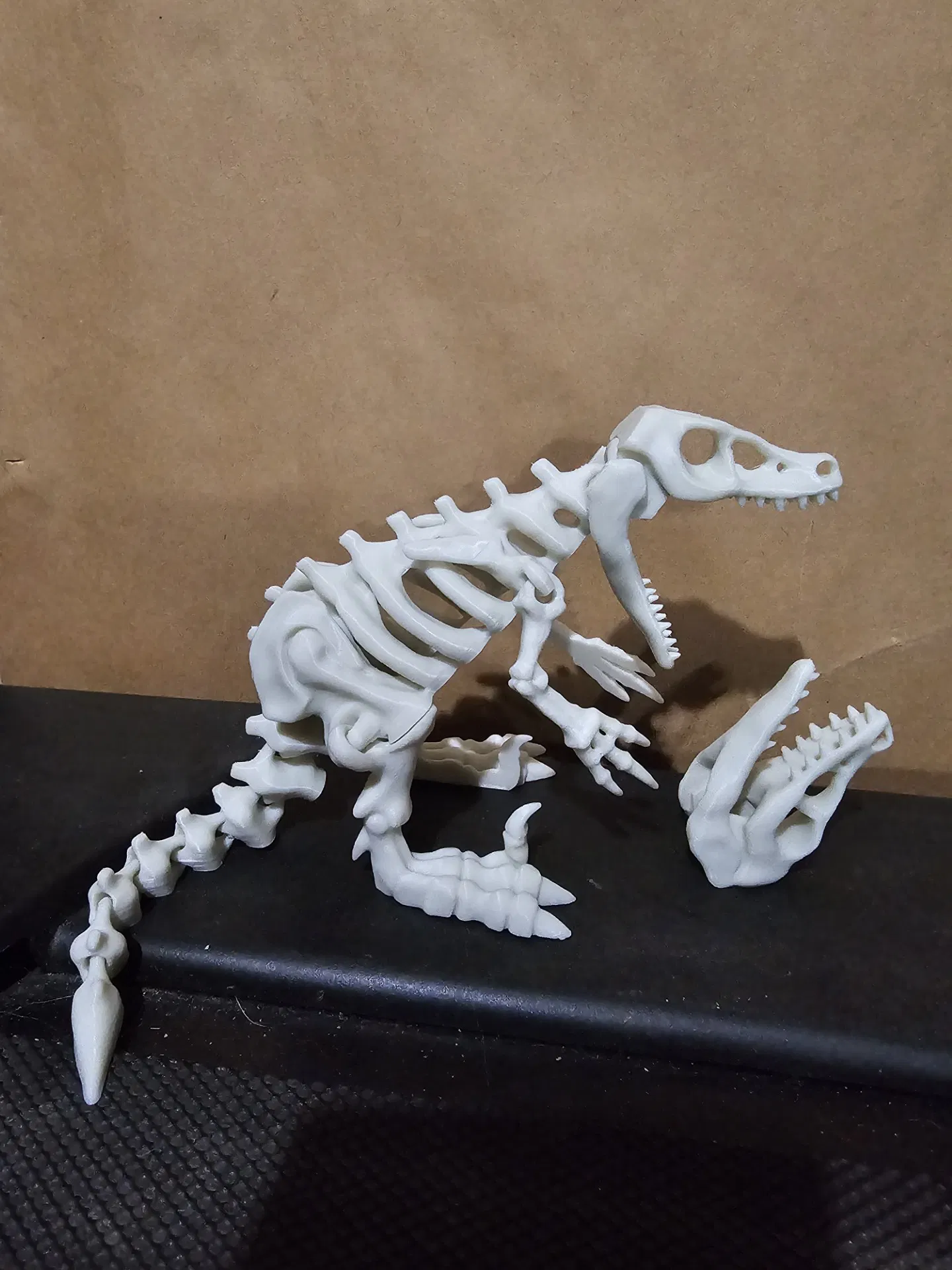 Bộ xương khủng long khớp nối có hộp sọ tháo rời. Có 3 hộp sọ đi kèm. Hai hộp sọ có hàm có thể cử động được. Dễ in và không cần hỗ trợ. Không nên in nhỏ hơn mặc định. In với 2 hoặc 3 lớp tường @ độ cao lớp .16.
