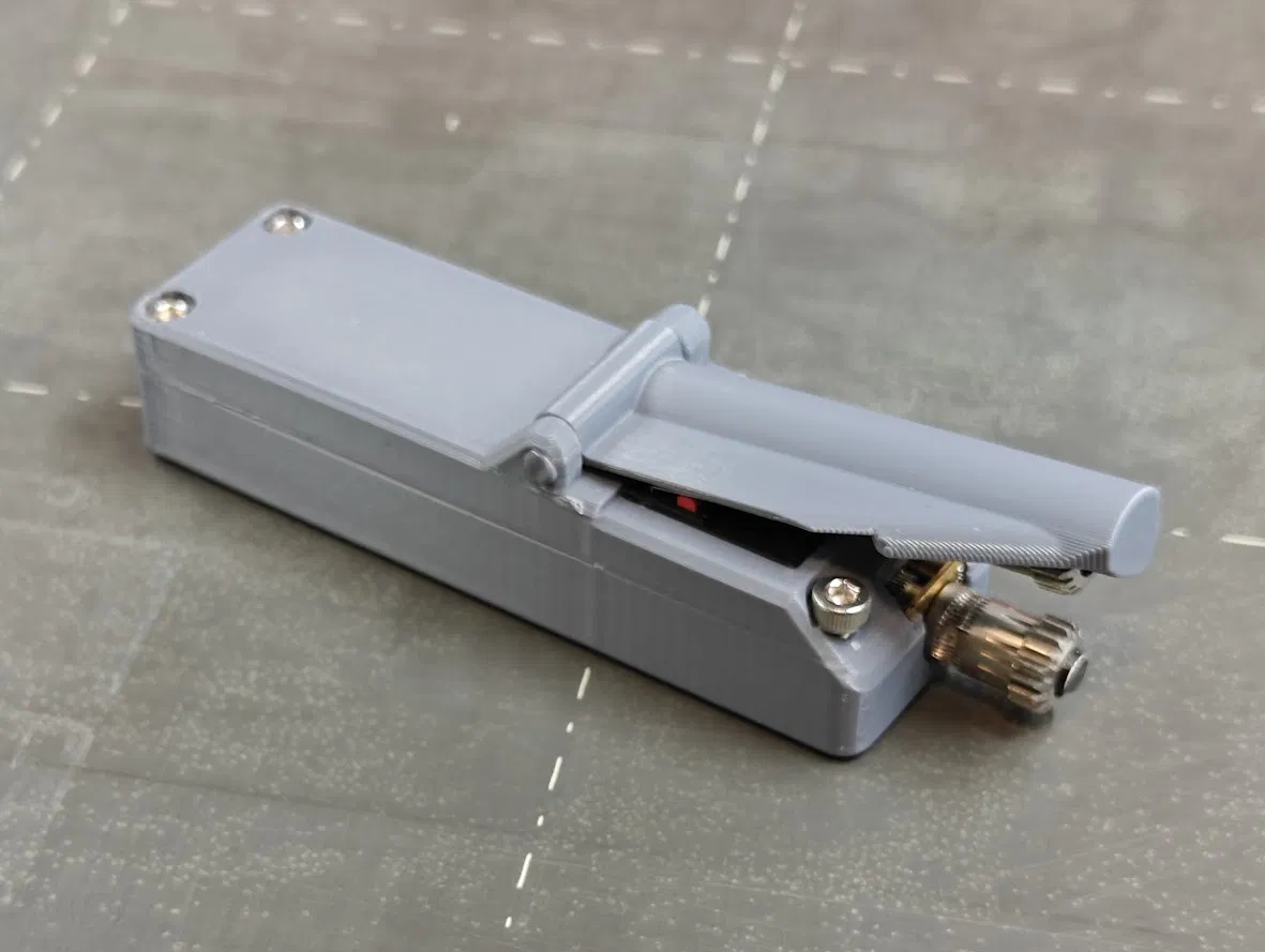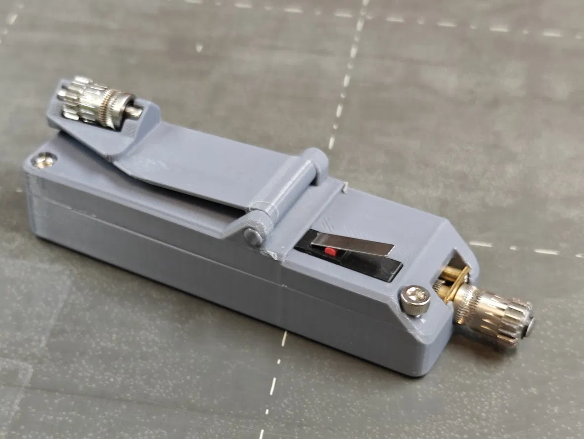 Kiểm tra công tắc của bạn xem có giống của tôi không, nhưng tôi dùng hai cái chân tiếp điểm gần cái bản lề nhất để tạo kết nối khi ấn cái cần xuống. Dùng một đoạn dây tóc làm chốt bản lề. Khoan hoặc doa lỗ nếu cần, rồi hàn chảy hai đầu để nó không bị bung ra. Cái tùy chọn bản lề bằng ốc được thiết kế cho ốc đầu dù M2x8mm, nhưng loại tương tự cũng chắc là xài được thôi, miễn là cái cần gạt chắc chắn và xoay dễ dàng.