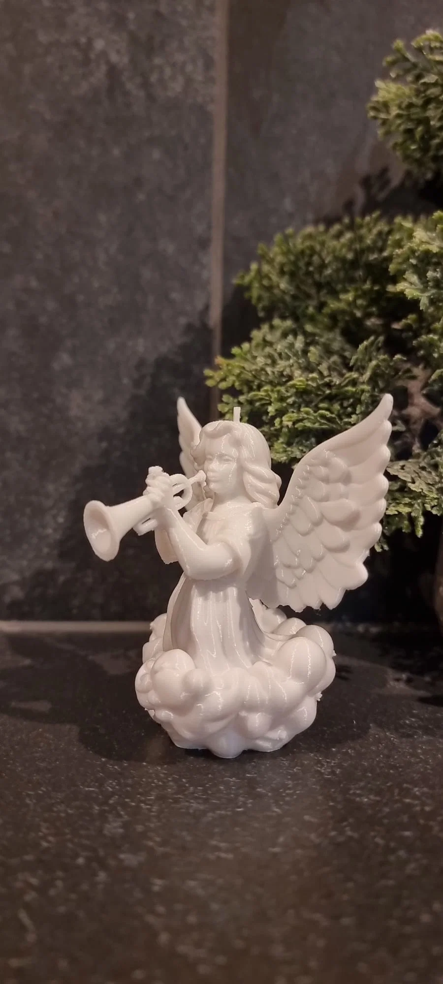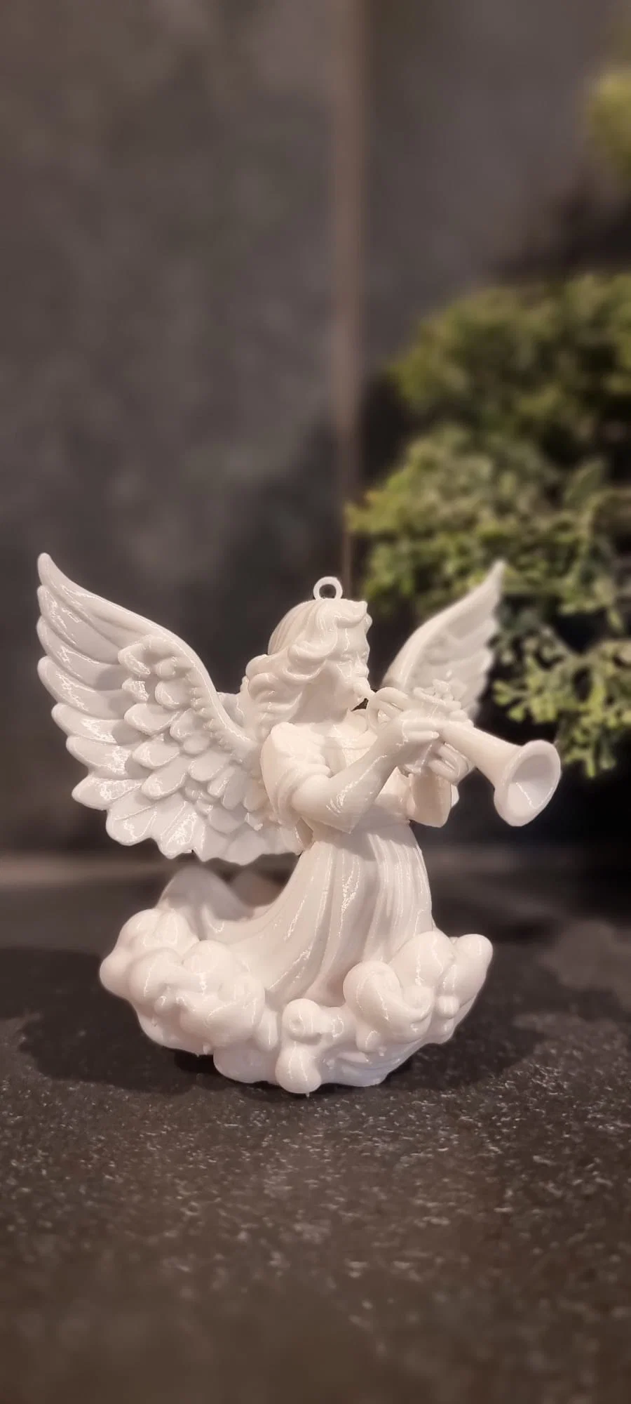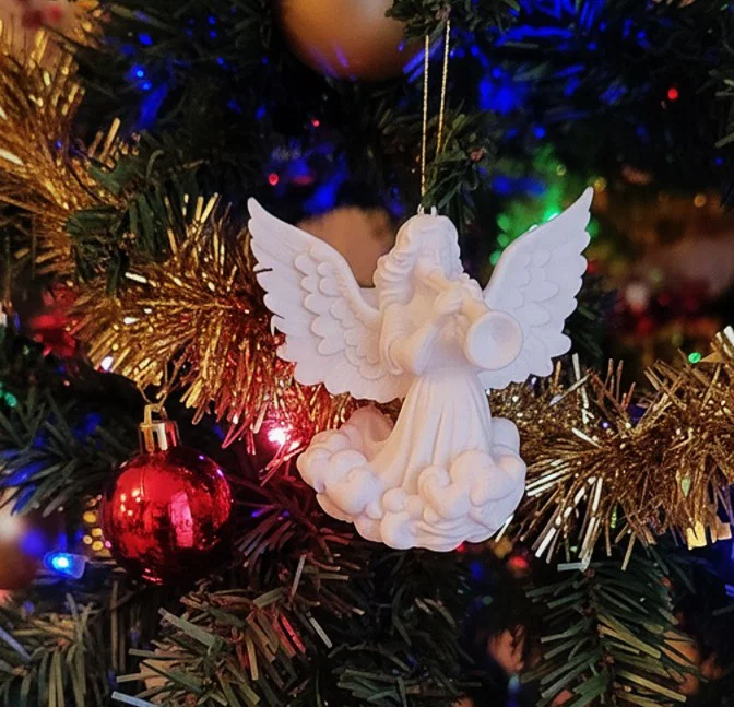 Thiên thần được điêu khắc với mái tóc bồng bềnh, đôi cánh lớn, chi tiết dang rộng, và đang thổi một chiếc kèn nhỏ. Nó được đặt trên một cụm mây được điêu khắc, gợi ý rằng nó đang ở trên không. Ánh sáng và bối cảnh tạo ra một bầu không khí lễ hội ấm áp, vui tươi và truyền thống, với thiên thần trắng nổi bật như một biểu tượng của hòa bình và sự tôn vinh.
