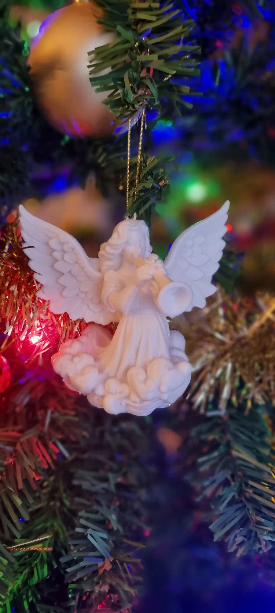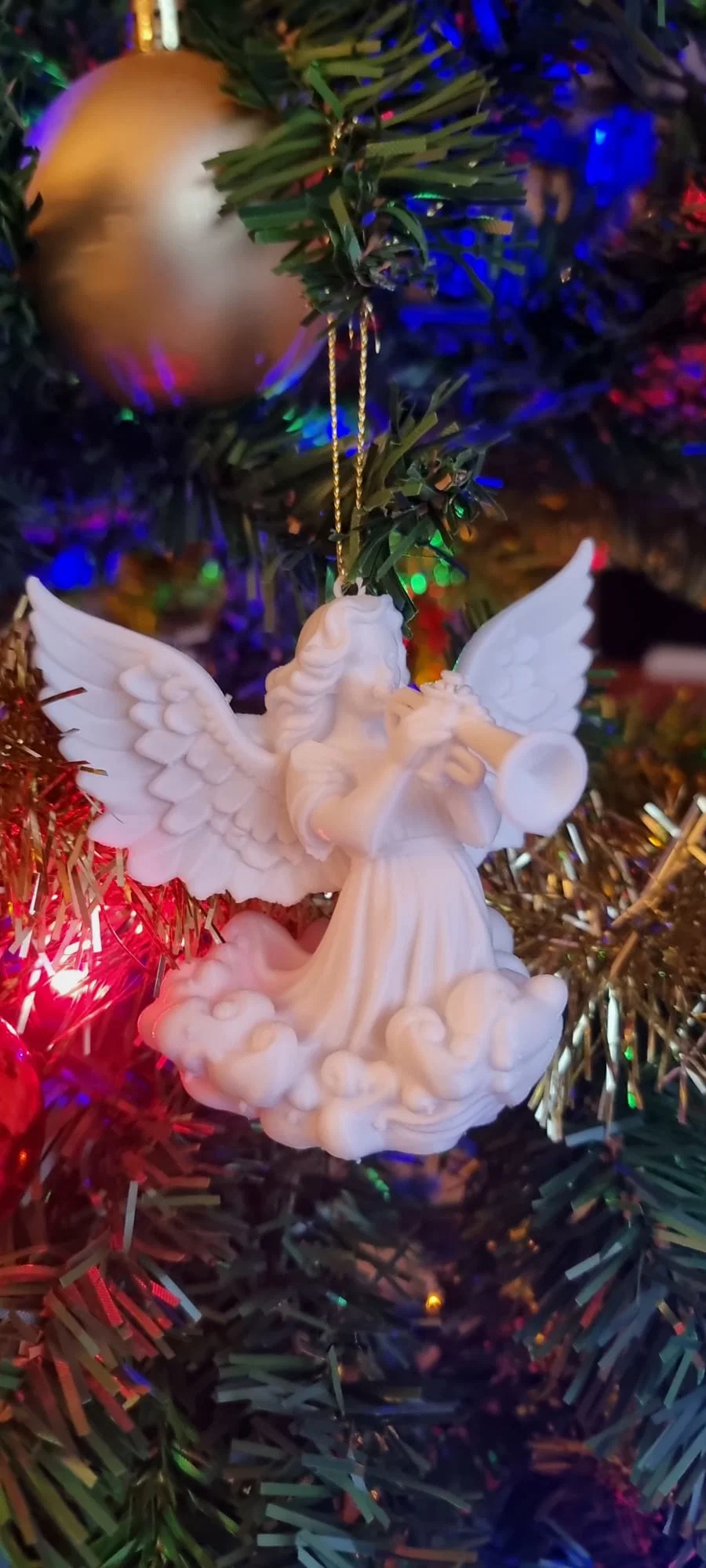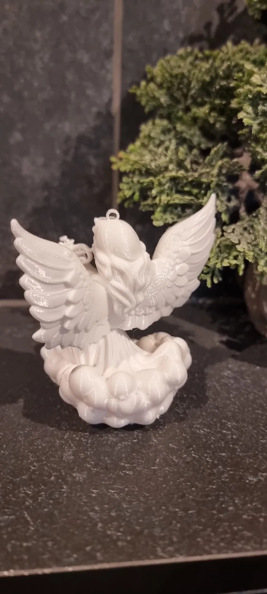 Thiên thần được điêu khắc với mái tóc bồng bềnh, đôi cánh lớn, chi tiết dang rộng, và đang thổi một chiếc kèn nhỏ. Nó được đặt trên một cụm mây được điêu khắc, gợi ý rằng nó đang ở trên không. Ánh sáng và bối cảnh tạo ra một bầu không khí lễ hội ấm áp, vui tươi và truyền thống, với thiên thần trắng nổi bật như một biểu tượng của hòa bình và sự tôn vinh.
