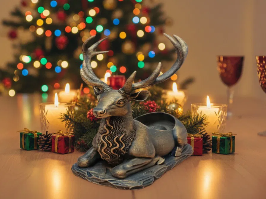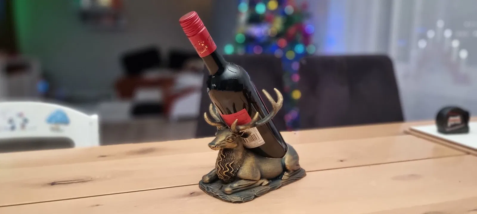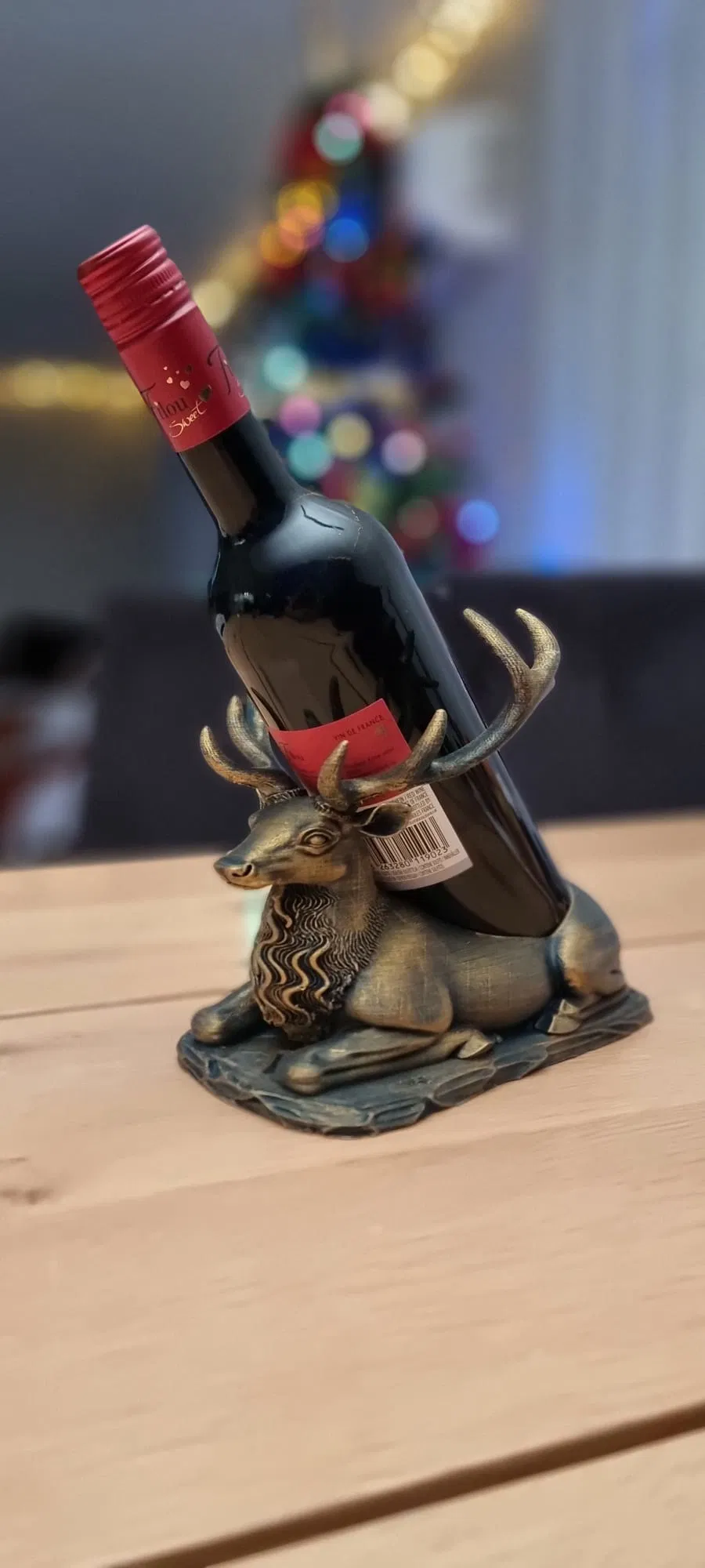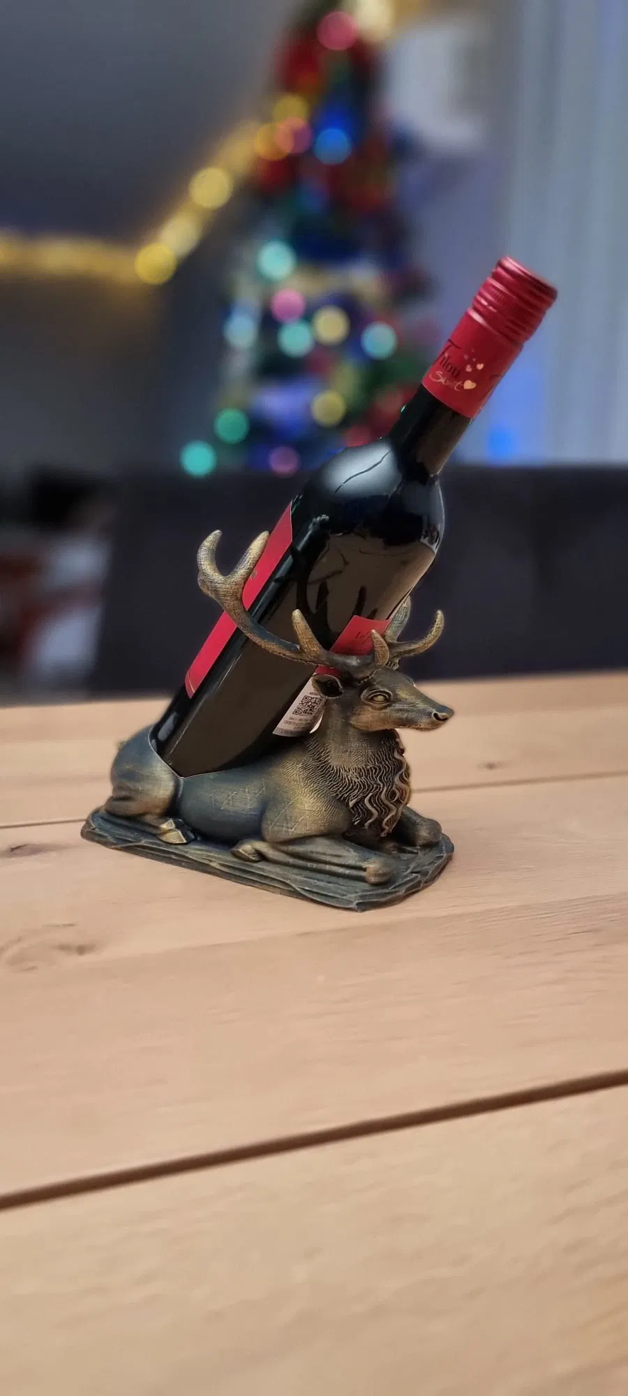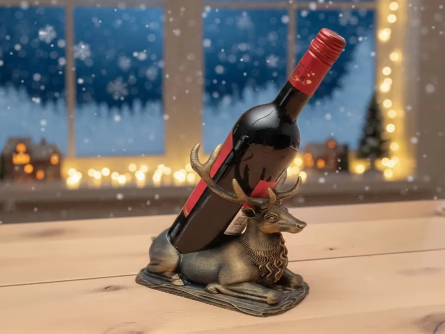 Một chú hươu đực oai vệ đang nằm nghỉ, với một không gian lõm đặc biệt trên lưng để giữ và ổn định một chai rượu vang cỡ tiêu chuẩn. Giá đỡ chai rượu vang vừa mang không khí lễ hội vừa hữu dụng, hoàn hảo nắm bắt tinh thần của những ngày lễ. Được chế tác dưới hình dáng một chú hươu hoặc tuần lộc hùng vĩ, nằm phục, với sừng và bờm được chạm khắc chi tiết, nổi bật, tạo cho nó một vẻ ngoài kim loại cổ điển hoặc mộc mạc.