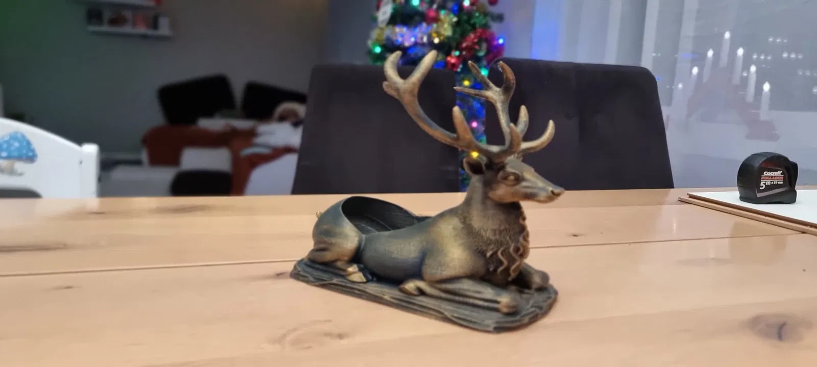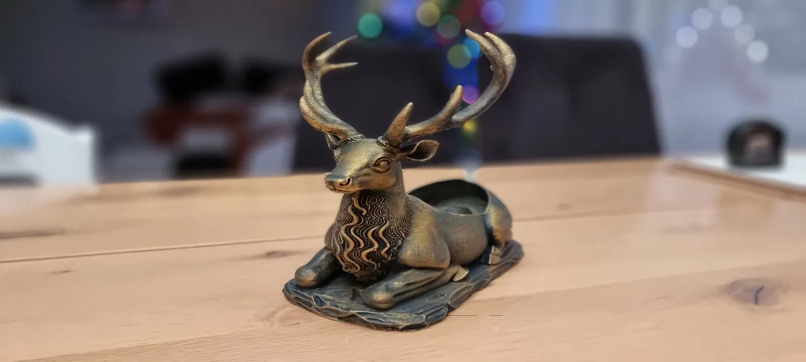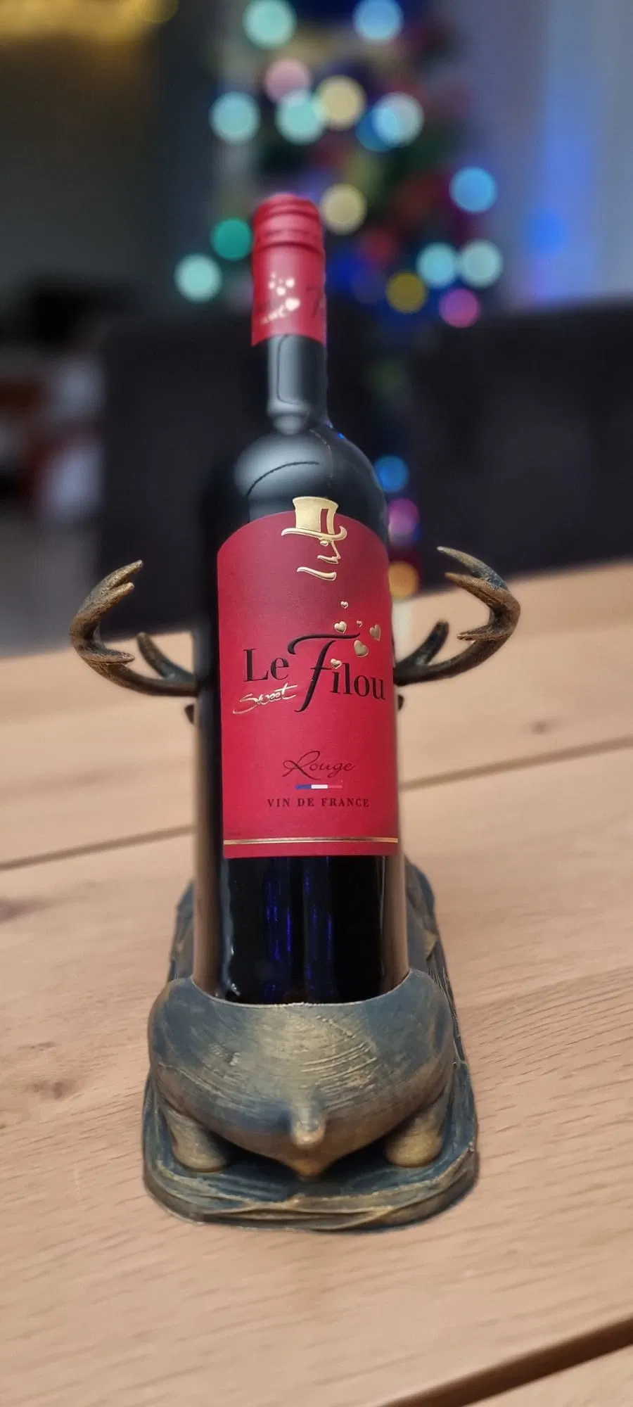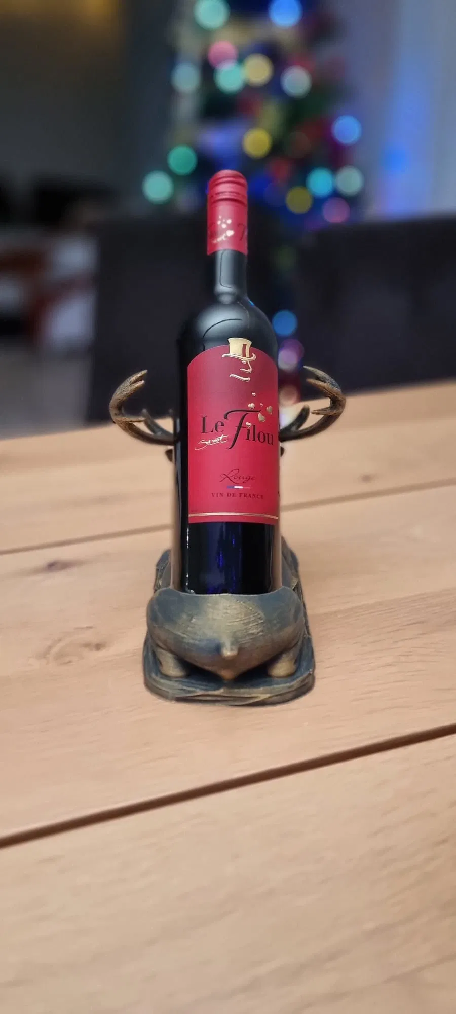 Một chú hươu đực oai vệ đang nằm nghỉ, với một không gian lõm đặc biệt trên lưng để giữ và ổn định một chai rượu vang cỡ tiêu chuẩn. Giá đỡ chai rượu vang vừa mang không khí lễ hội vừa hữu dụng, hoàn hảo nắm bắt tinh thần của những ngày lễ. Được chế tác dưới hình dáng một chú hươu hoặc tuần lộc hùng vĩ, nằm phục, với sừng và bờm được chạm khắc chi tiết, nổi bật, tạo cho nó một vẻ ngoài kim loại cổ điển hoặc mộc mạc.