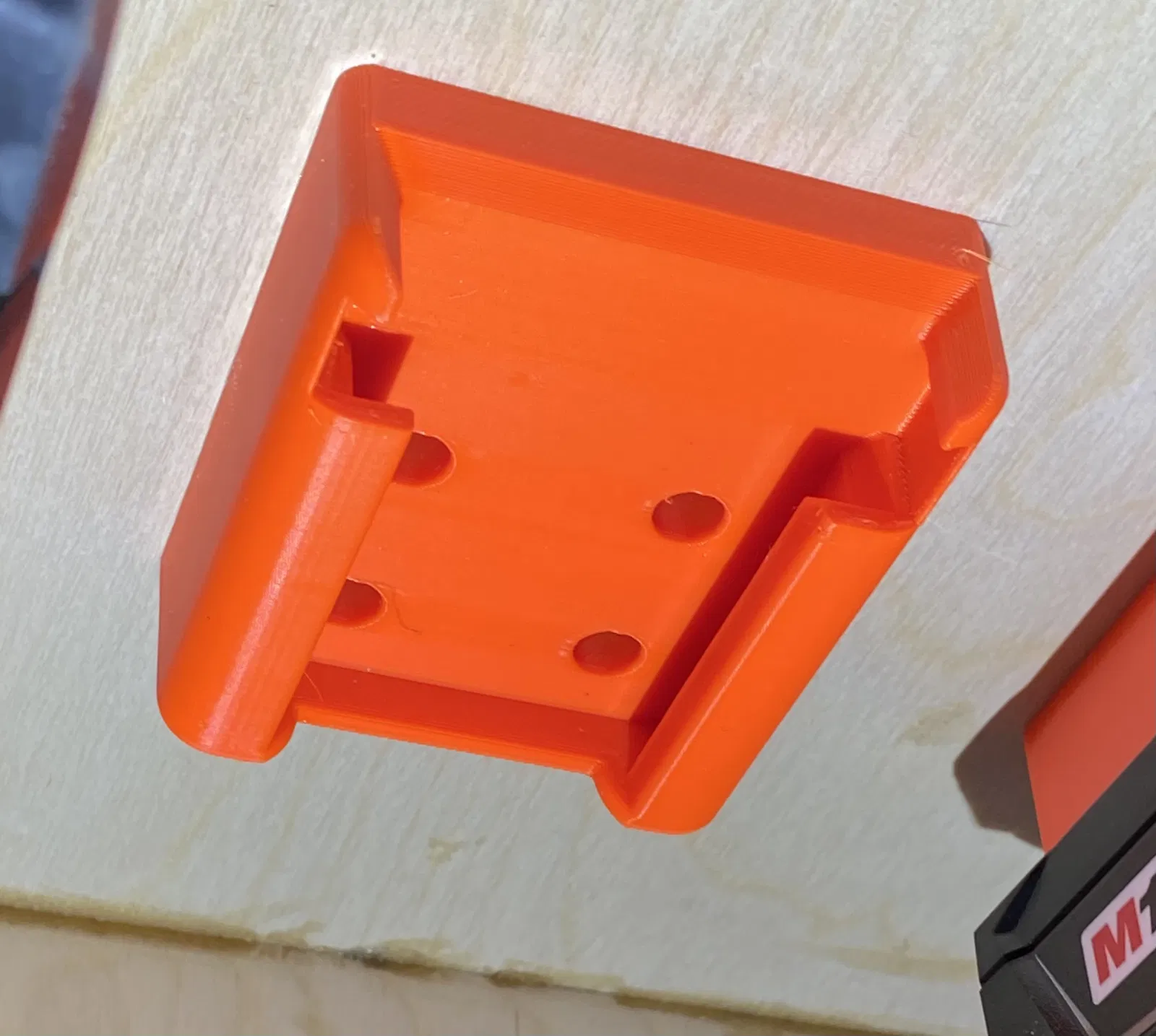 Cái mẫu này cho phép anh em gắn mấy cục pin M18 của hệ thống Milwaukee lên hoặc dưới kệ, hoặc gắn lên tường luôn. Pin nó sẽ snap vào bằng cái ngàm giữ giống y chang như khi gắn vô máy vậy đó. Nhờ vậy anh em có thể gắn pin ở chỗ nào tiện lợi, khỏi lo rớt cục pin mắc tiền ha.