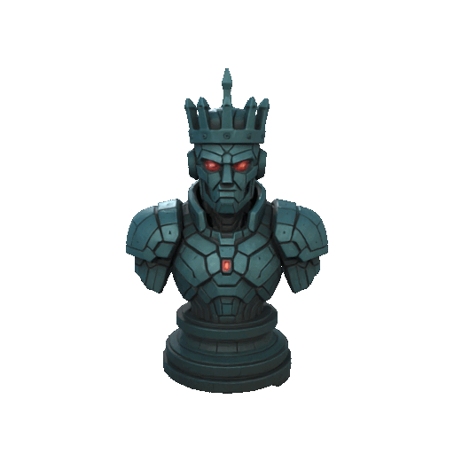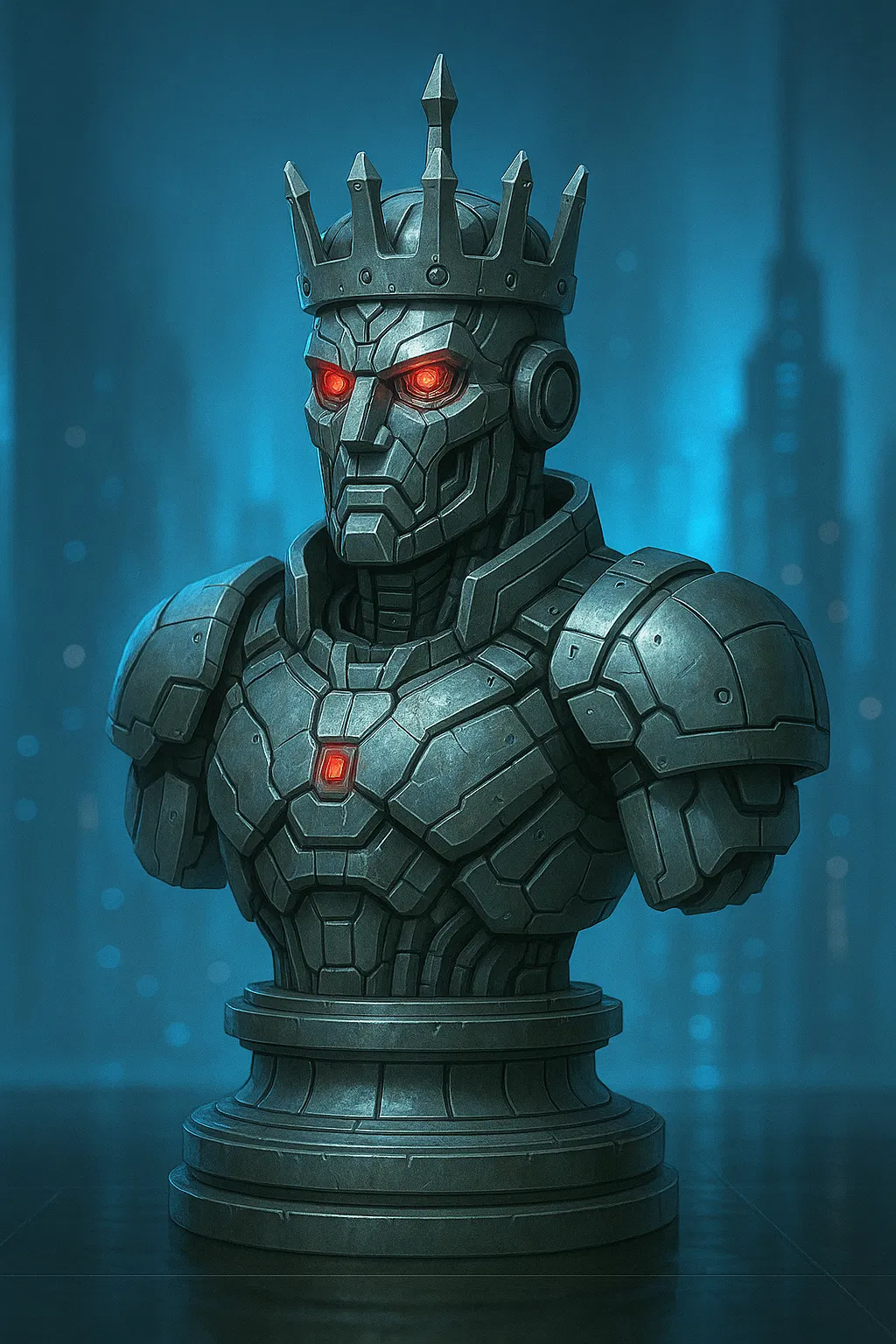 Quân "Vua" là trái tim của Đoàn quân Kim loại. Được rèn từ một hợp kim hiếm có khả năng chống lại cả bức xạ vũ trụ, nó ngự trị vững chãi trên bàn cờ. Ánh mắt của nó, một ánh sáng đỏ rực sâu trong cảm biến quang học, xuyên thủng mọi hàng phòng thủ. Nó không được tạo ra để chiến đấu – mà là để thống trị. Các kho lưu trữ của các siêu đô thị ghi rằng nó có thể nhìn thấu mọi nước đi trước khi đối thủ kịp suy nghĩ.