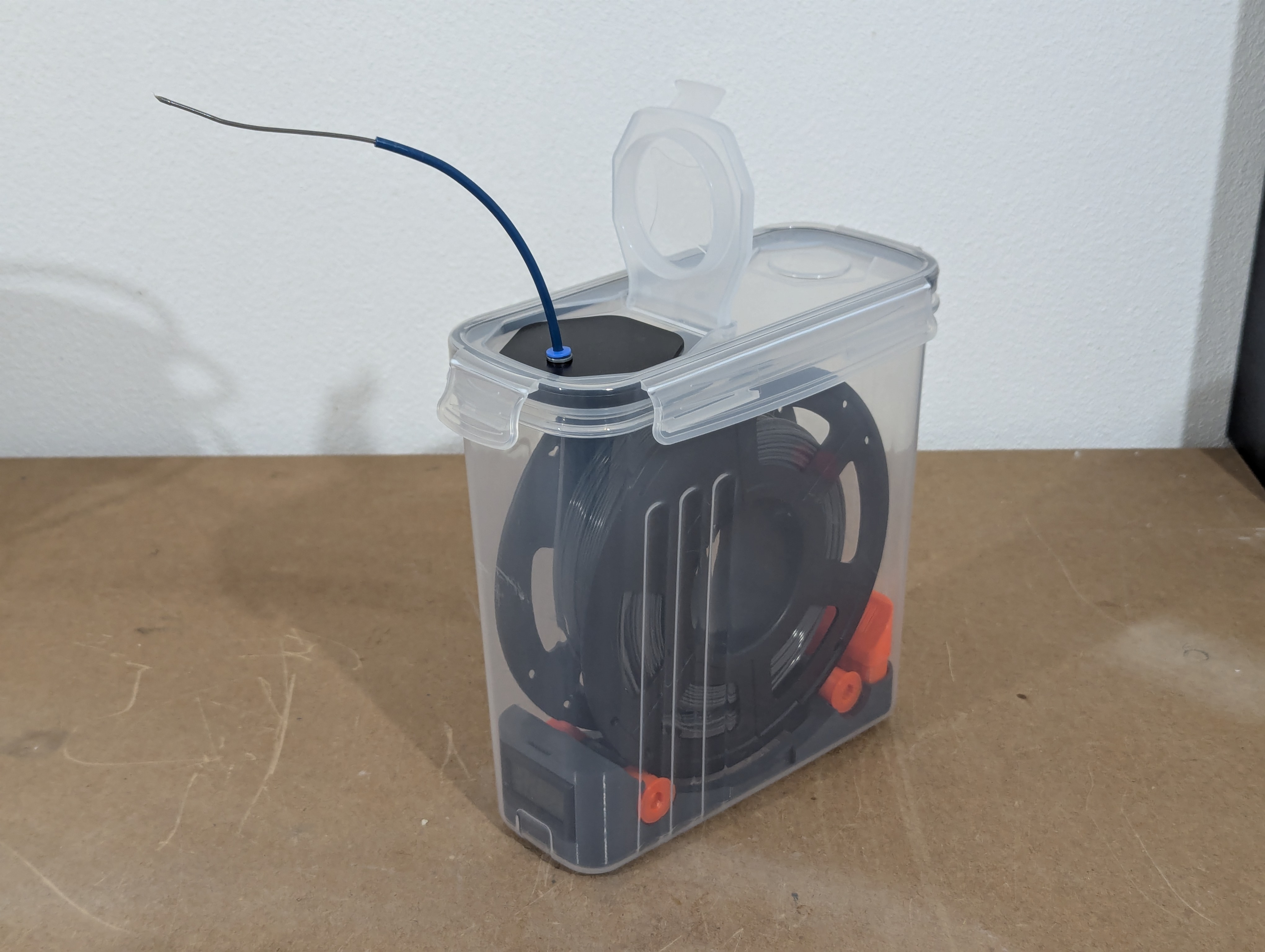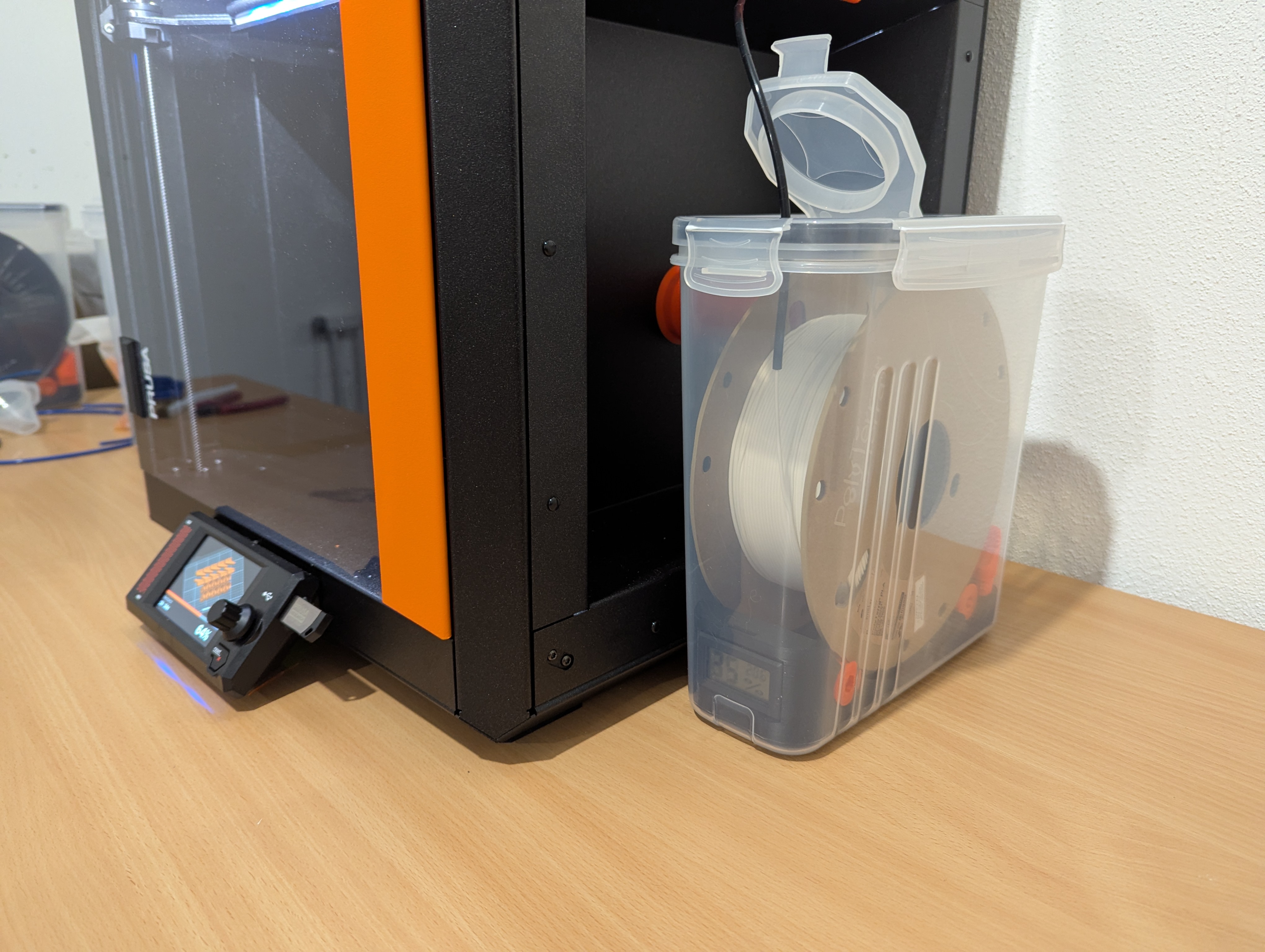 Với cái Prusa Core One của tui thì cái lỗ ở trên là hoàn hảo. Kiểu này tui có thể để hộp bên cạnh máy in. Nếu tui muốn cất cuộn dây lâu dài, tui sẽ đổi cái nắp in ra với cái nắp zin, và hộp sẽ kín khí 100%.