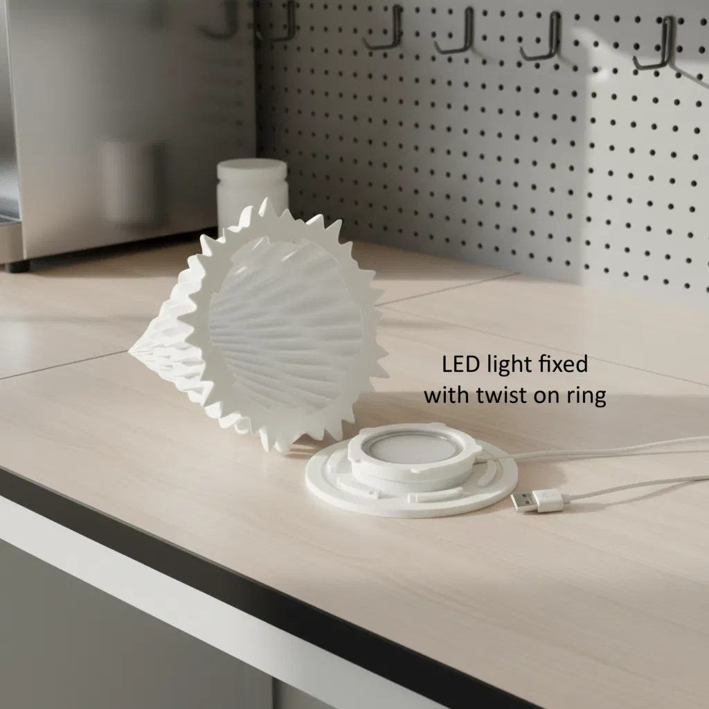 Chiếu Sáng Đơn Giản (Không Cần Đế Đèn & In Chế Độ Lọ): Để có ánh sáng nhanh chóng, dễ dàng bằng pin, cây đèn này cũng có thể được chiếu sáng bằng đèn trà LED tiêu chuẩn. Phương pháp này không yêu cầu thành phần "Đế Đèn". Việc in ở Chế Độ Lọ (Vase Mode) được khuyến khích mạnh mẽ để ánh sáng có thể xuyên qua.