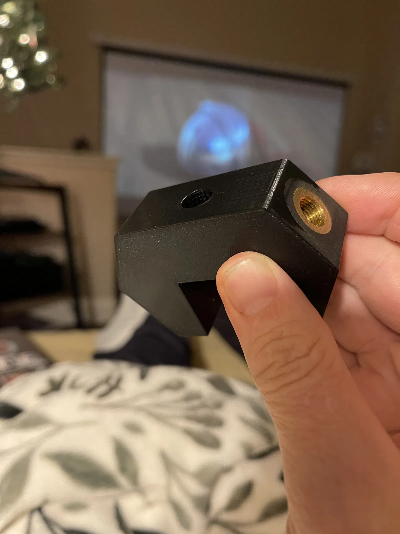 Sau khi in xong, gắn các insert ép nhiệt (xem bên dưới). Tôi dùng mỏ hàn lớn để làm nóng và ép chúng vào. Chúng có dạng côn nên thường tự căn chỉnh.