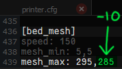Nếu bạn không sử dụng giá đỡ bàn chải hồ sơ thấp V4 LPF2 với đế và đầu dò tiêu chuẩn, bạn sẽ cần 10mm khoảng trống xung quanh bộ gạt để tránh va chạm. Tốt nhất là nên đặt khoảng trống đầy đủ trong mọi trường hợp. Trong tệp printer.cfg, giảm số mesh_max thứ hai đi 10 trong phần [bed_mesh]. Máy của tôi là 295, vì vậy tôi đã giảm xuống còn 285. Lưu cấu hình và khởi động lại máy để áp dụng các thay đổi.
