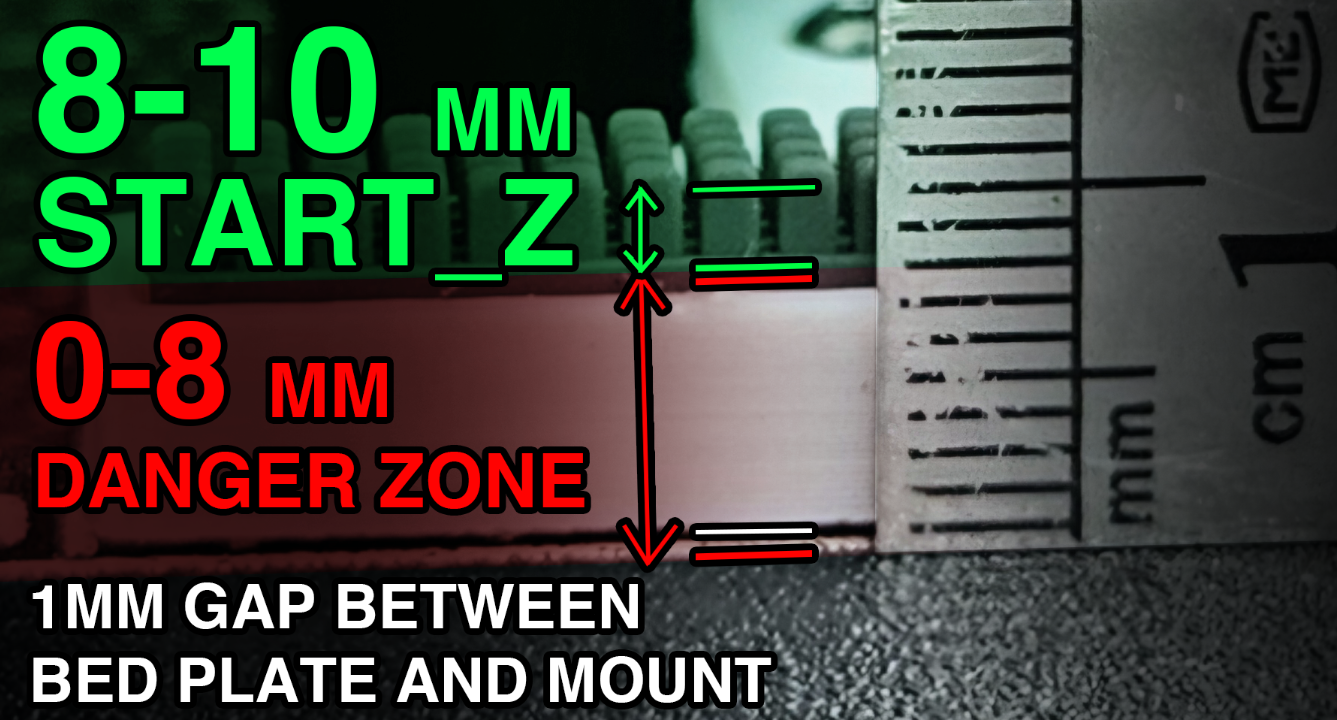 Nếu đáy của giá đỡ bàn chải cao hơn 1mm so với tấm đế (ví dụ: khi sử dụng bộ đệm Z lớn hoặc nếu bạn có đế nâng cấp thấp hơn điểm lắp trục vít trục z, hãy thay đổi kích thước bộ đệm z 1mm từ thư mục công cụ và các mục bổ sung để đáy của giá đỡ bàn chải nằm cao hơn tấm đế 1mm, sau đó tính toán chiều cao bổ sung bằng cách thay đổi biến spacer_height trong cấu hình (v5+). Chiều cao gạt cuối cùng sẽ là start_z cộng với spacer_height. Sử dụng thước để đo và xác nhận rằng các biến được đặt ở chiều cao an toàn.
