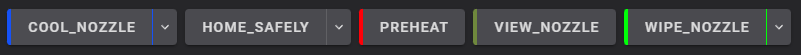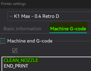 Bạn có thể thêm macro vào Machine end G-code trong cài đặt máy in của slicer bằng cách thêm dòng WIPE_NOZZLE trước END_PRINT. Chỉ thực hiện điều này nếu bạn không bao giờ có ý định in gần bộ gạt, nếu không đầu phun của bạn có thể va chạm với bản in. Tùy chọn an toàn hơn là để nguyên Machine end G-code và chỉ nhấp vào macro WIPE_NOZZLE khi bạn biết điều đó an toàn. Bạn không cần thêm nó vào mã bắt đầu vì nó sẽ được kích hoạt trong trình tự san lấp mặt bằng.