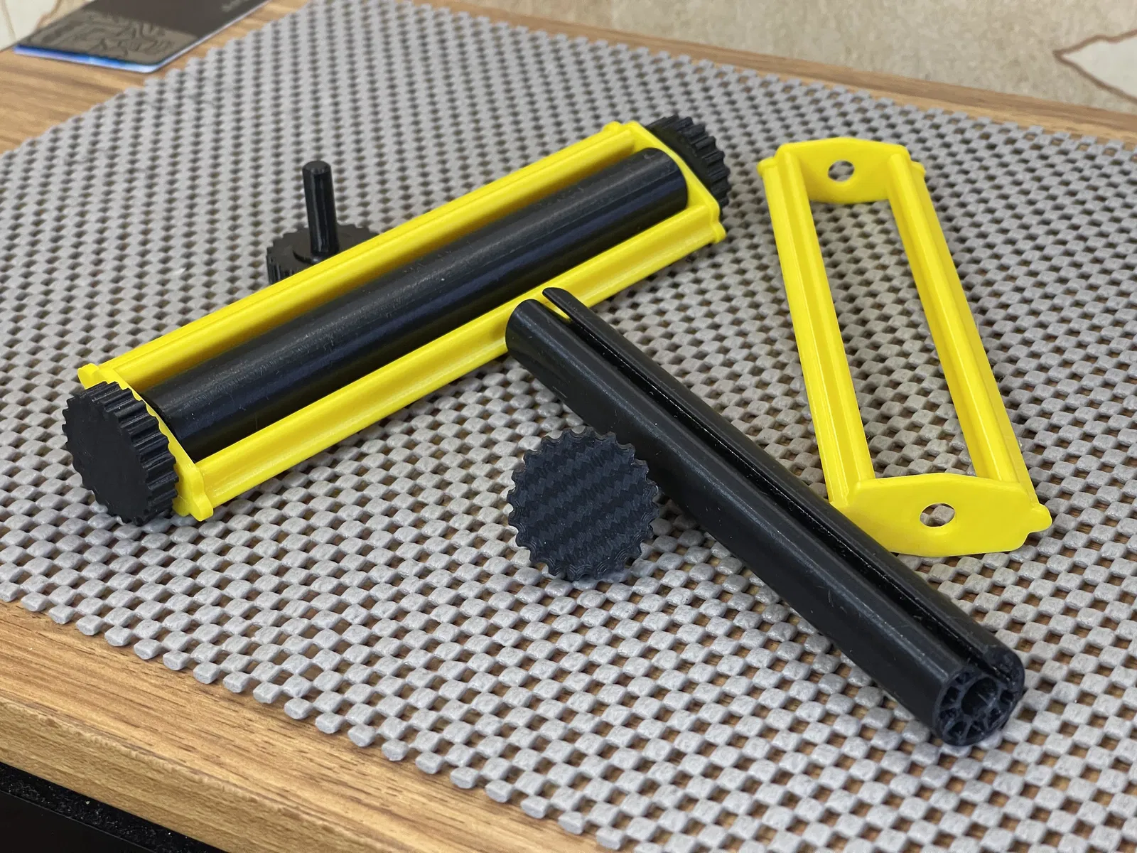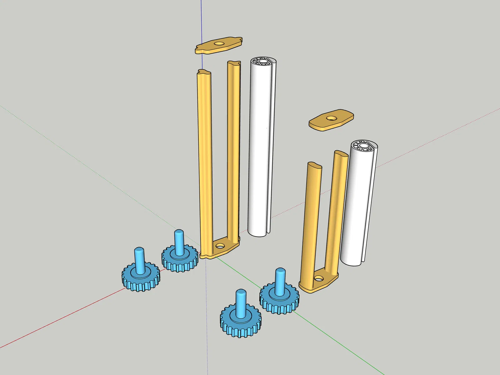 Nói sơ qua về cách lắp ráp nha. Tui có dùng sai từ ngữ thì mấy bạn thông cảm nha, tui không biết gọi mấy chi tiết này sao cho đúng. Vậy nha. Lấy cái kẹp với cái núm, của tui màu vàng á, rồi mình dán cái núm vô cái đầu kẹp, nó hơi cứng một xíu là bình thường nha. Rồi mình nhét cái thanh màu đen vô giữa hai cái núm kẹp, rồi mình bôi keo vô cái phần lỗ bên trong, chỗ mà mình sẽ nhét cái trục xoay vô.