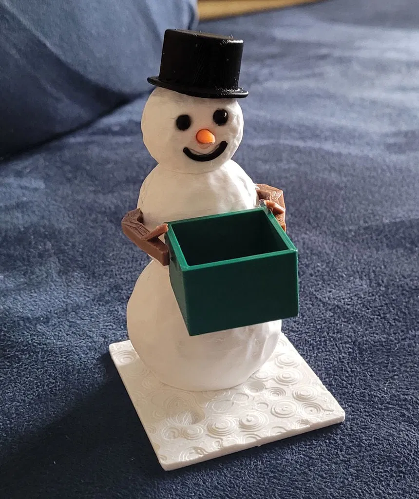 Đây là một người tuyết nhỏ thân thiện, trông thật, đang bận rộn mang một cái hộp. Vật thể này rỗng bên trong nên không tốn nhiều filament. Bạn có thể đặt những vật nhỏ vào hộp, ví dụ: nhẫn, thẻ nhớ micro SD, v.v. Chiều cao không tính mũ là 9,5 cm.