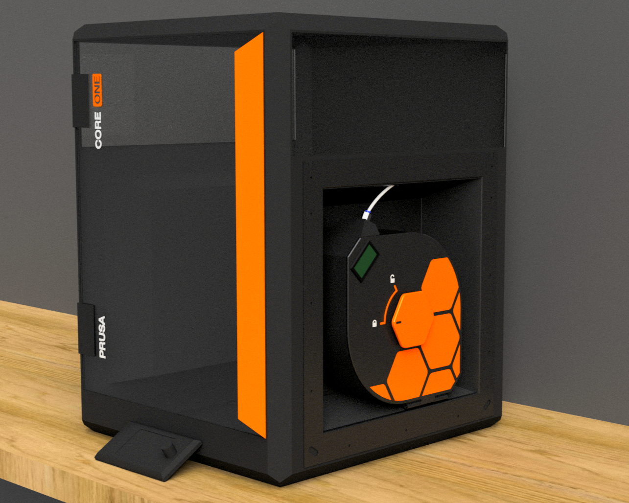 - Hộp chống ẩm tiêu chuẩn sẽ vừa vặn hoàn hảo với CORE One và nằm phẳng với cạnh máy in. Loại này có thể chứa cuộn sợi rộng tới 7cm (ví dụ: Prusament).