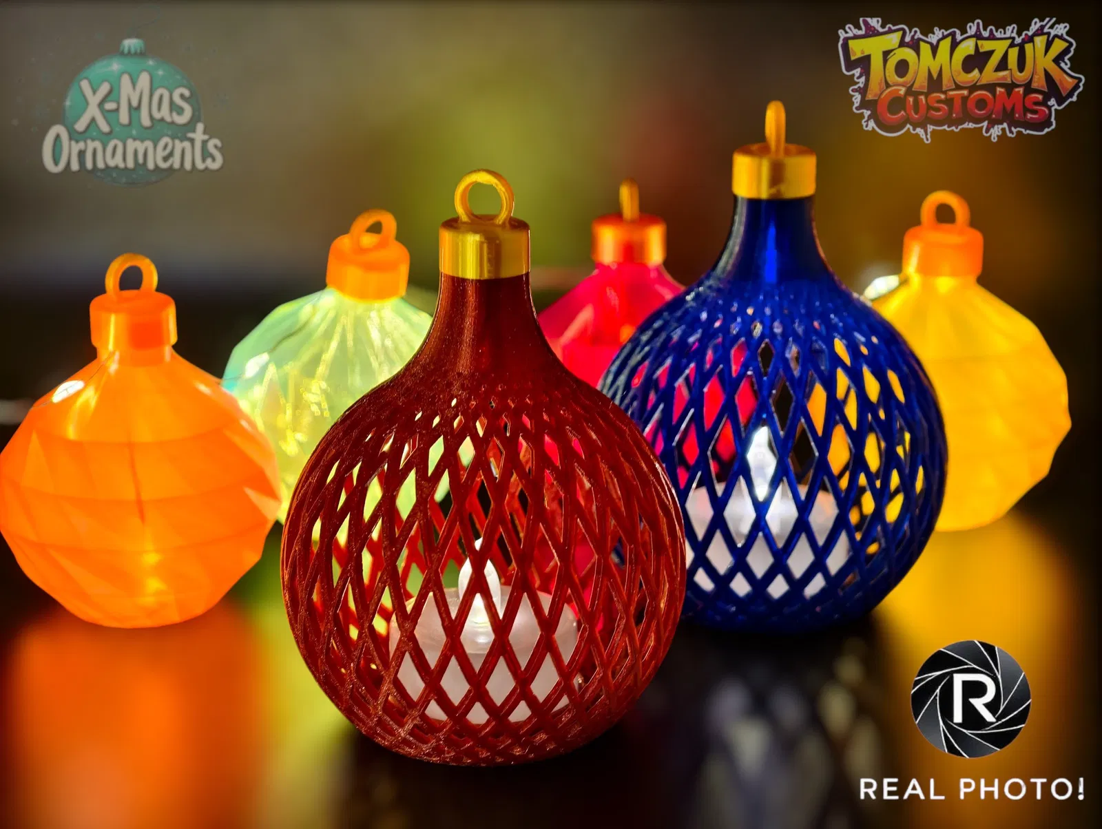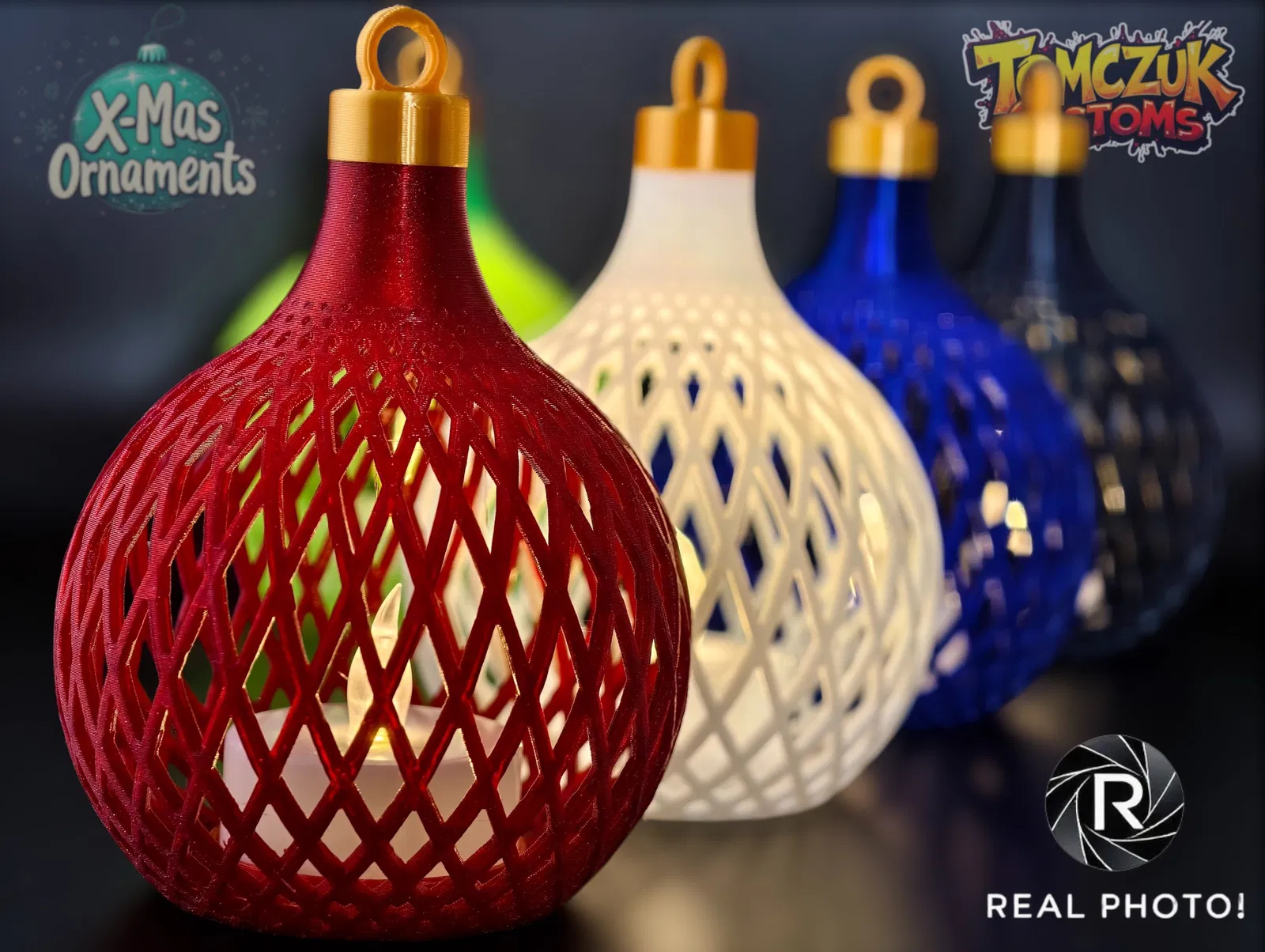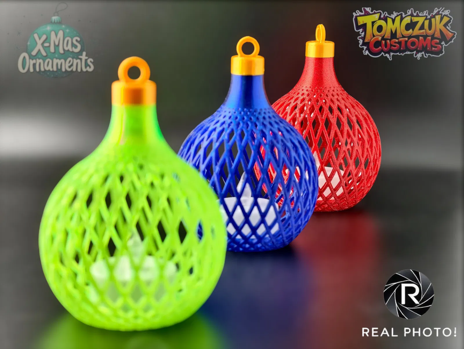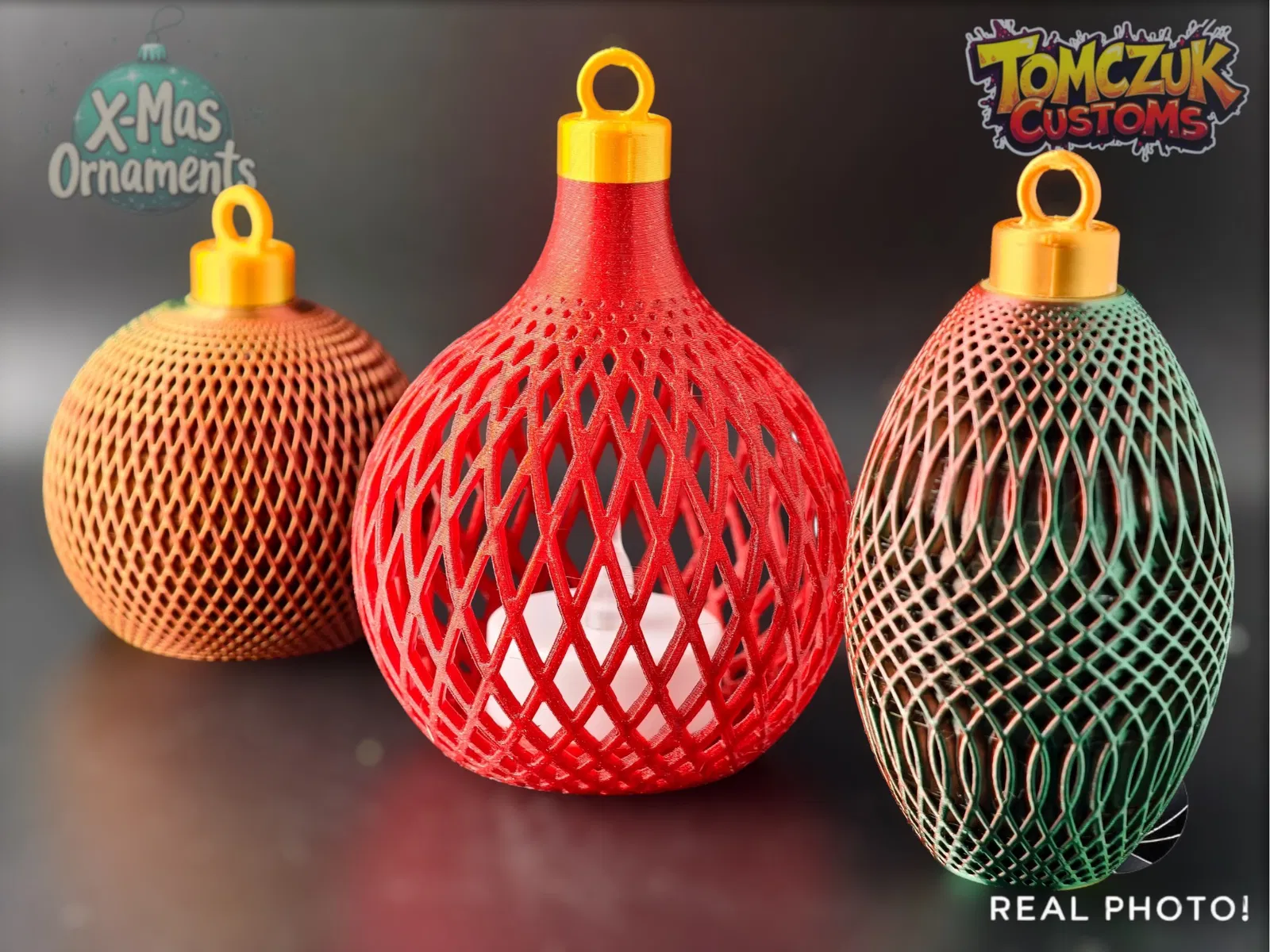 Set gồm 3 quả châu Giáng Sinh cổ điển, chắc chắn, có một mẫu đặc biệt dùng để đặt đèn trà LED bên trong, tạo hiệu ứng lung linh ấm áp. Tuyệt vời cho cây thông Noel, in dễ dàng với PLA/PETG kim sa hoặc lấp lánh.