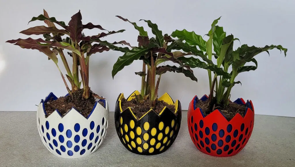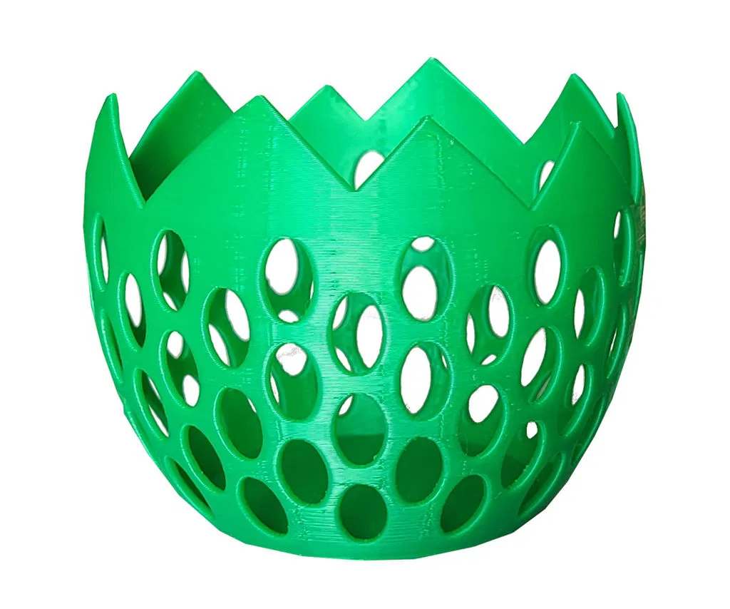 Chậu nhỏ hình quả trứng với bộ xương độc đáo, gồm 2 phần: vỏ ngoài và ruột. Cao 6.5 cm, rộng 8.5 cm. Phần ruột nên in bằng PETG để chống ẩm. Món quà tuyệt vời cho người yêu cây cảnh.