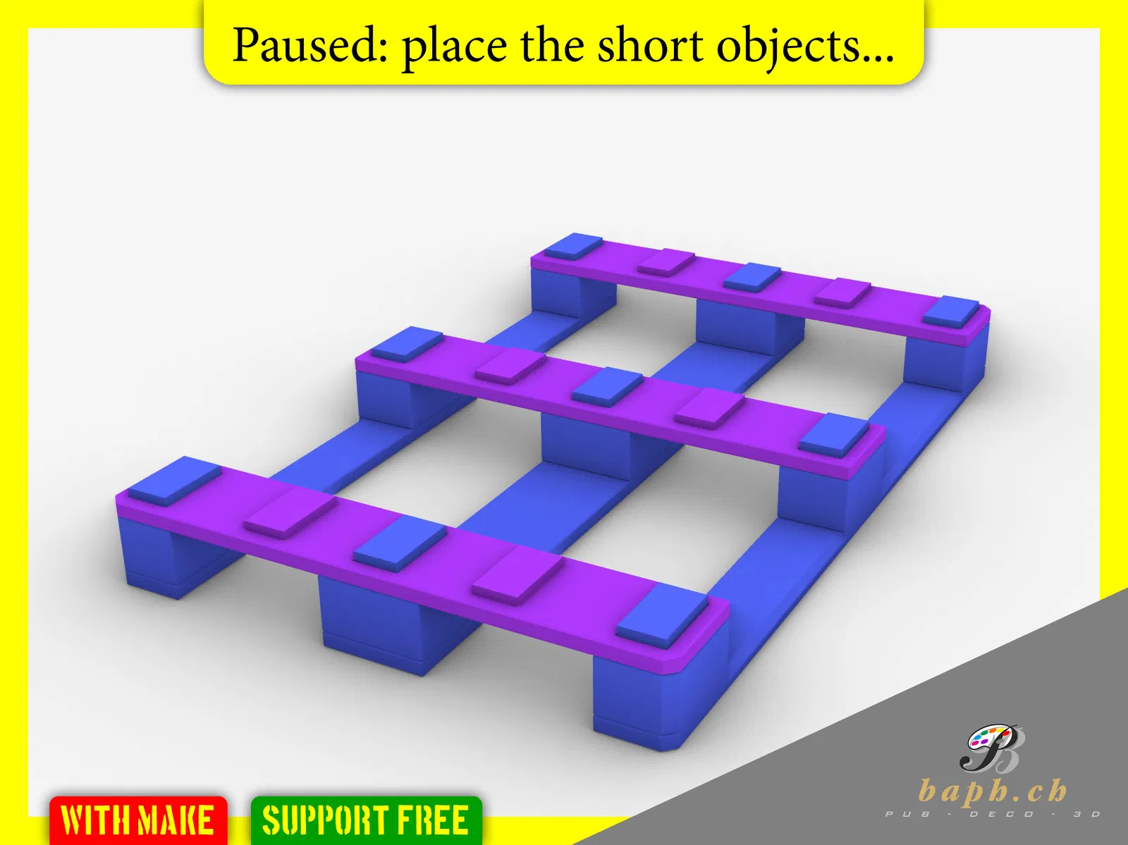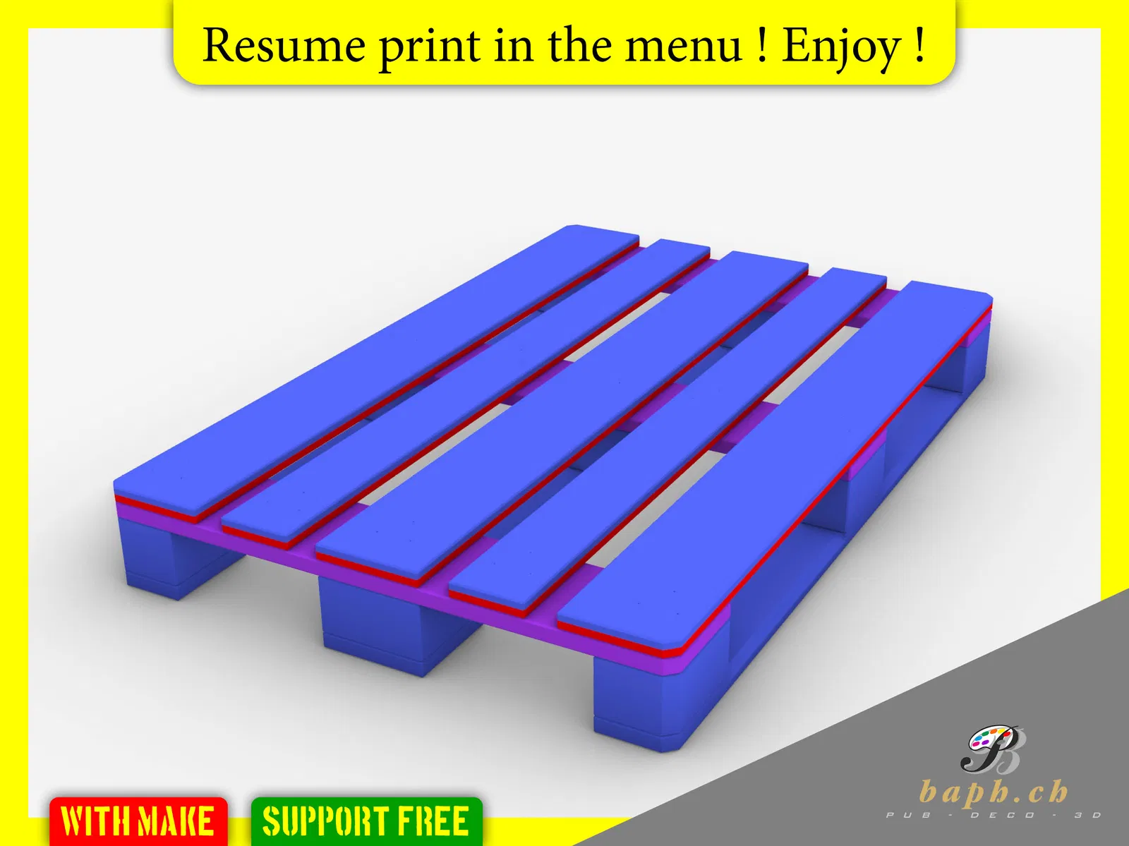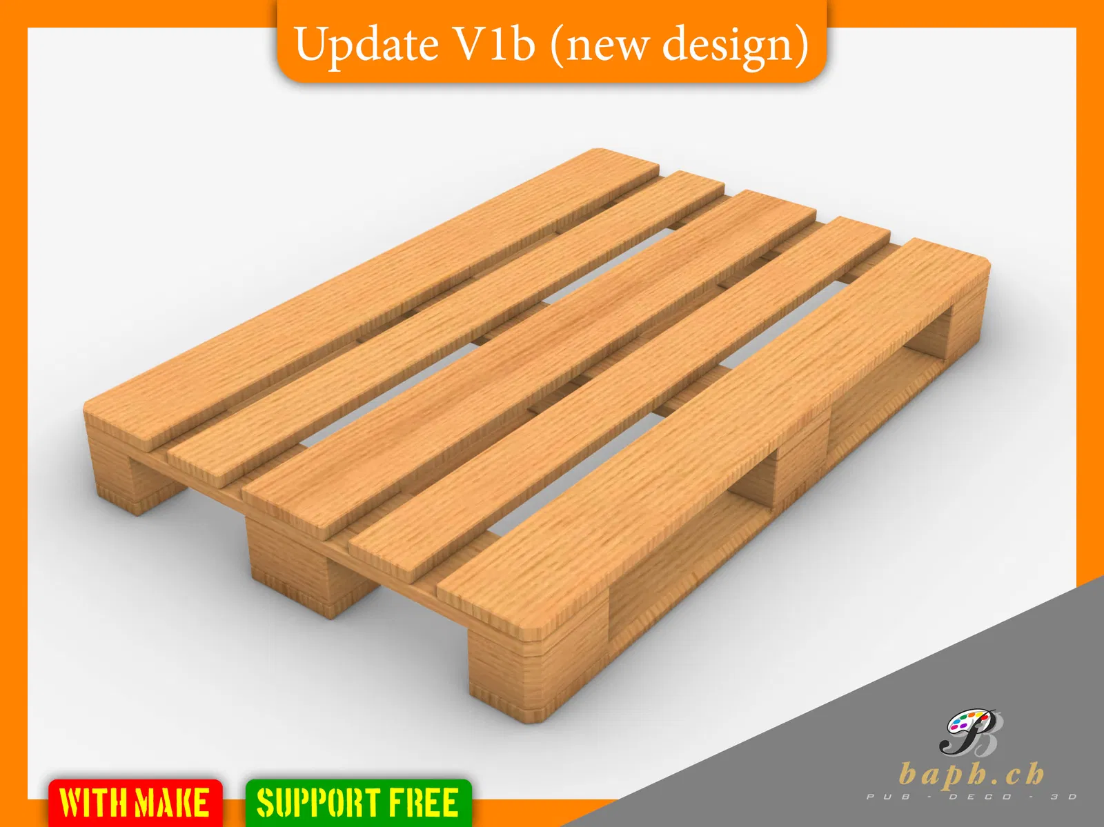 Phiên bản V.3 của Palette EU, in một lần không cần support. Kích thước 1:10 là 120x80mm, với một lần tạm dừng in để đặt các bộ phận. Giờ có thêm bản 150x100mm và có thể xếp chồng.