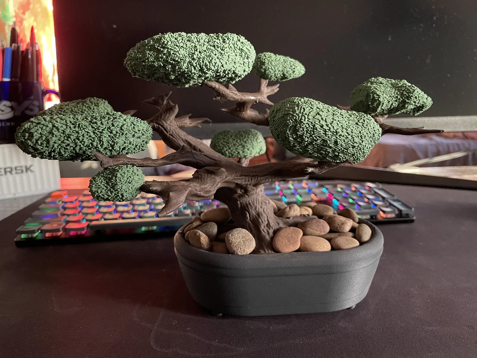 Mô hình cây Bonsai này là dự án in 3D ở mức trung cấp, gồm 40 mảnh ghép lại bằng keo 502. Cần kiên nhẫn khi in, nhưng thành phẩm là vật trang trí rất đẹp. Kích thước cuối cùng khoảng 12 inch dài, 8 inch cao.
