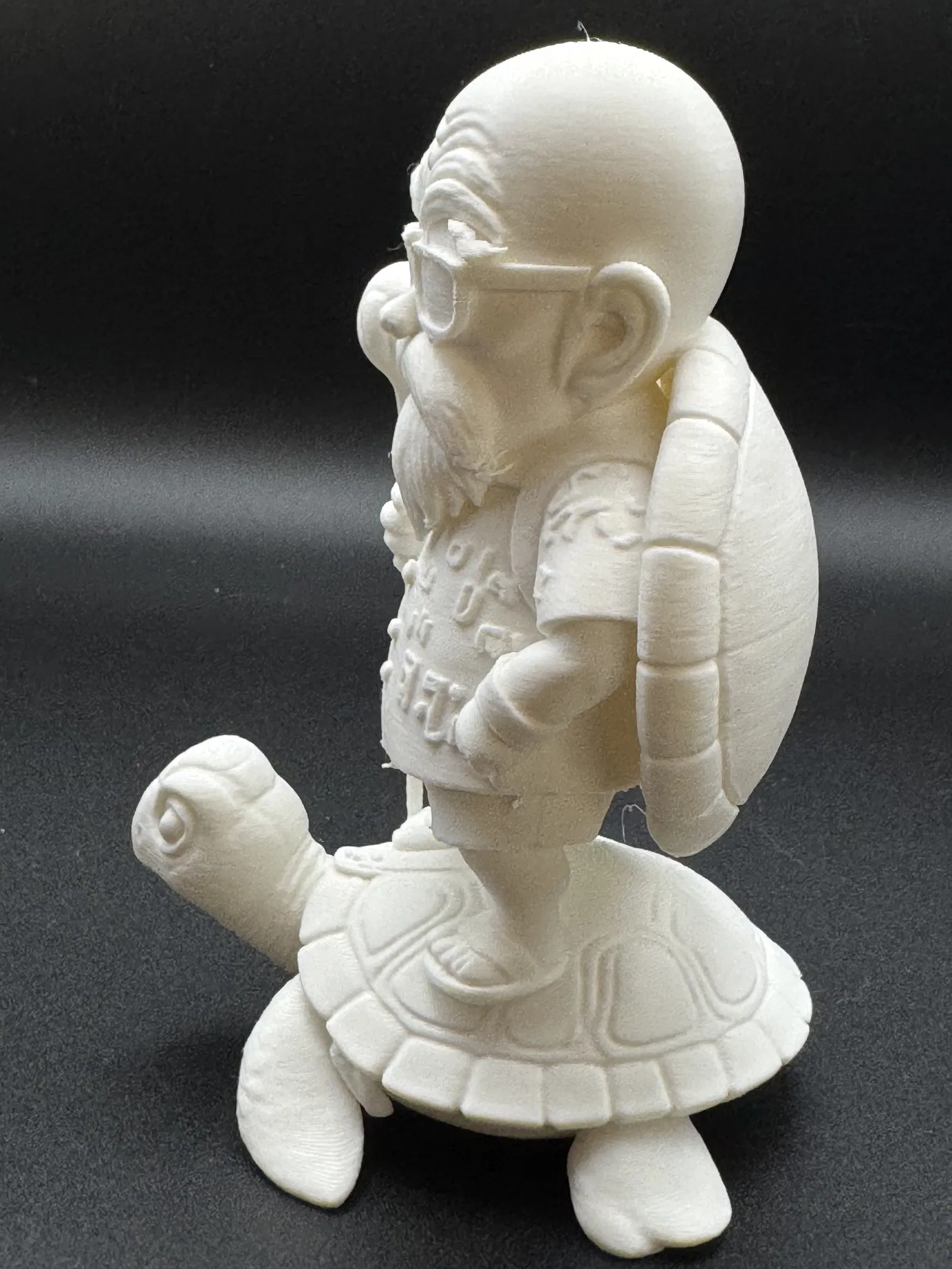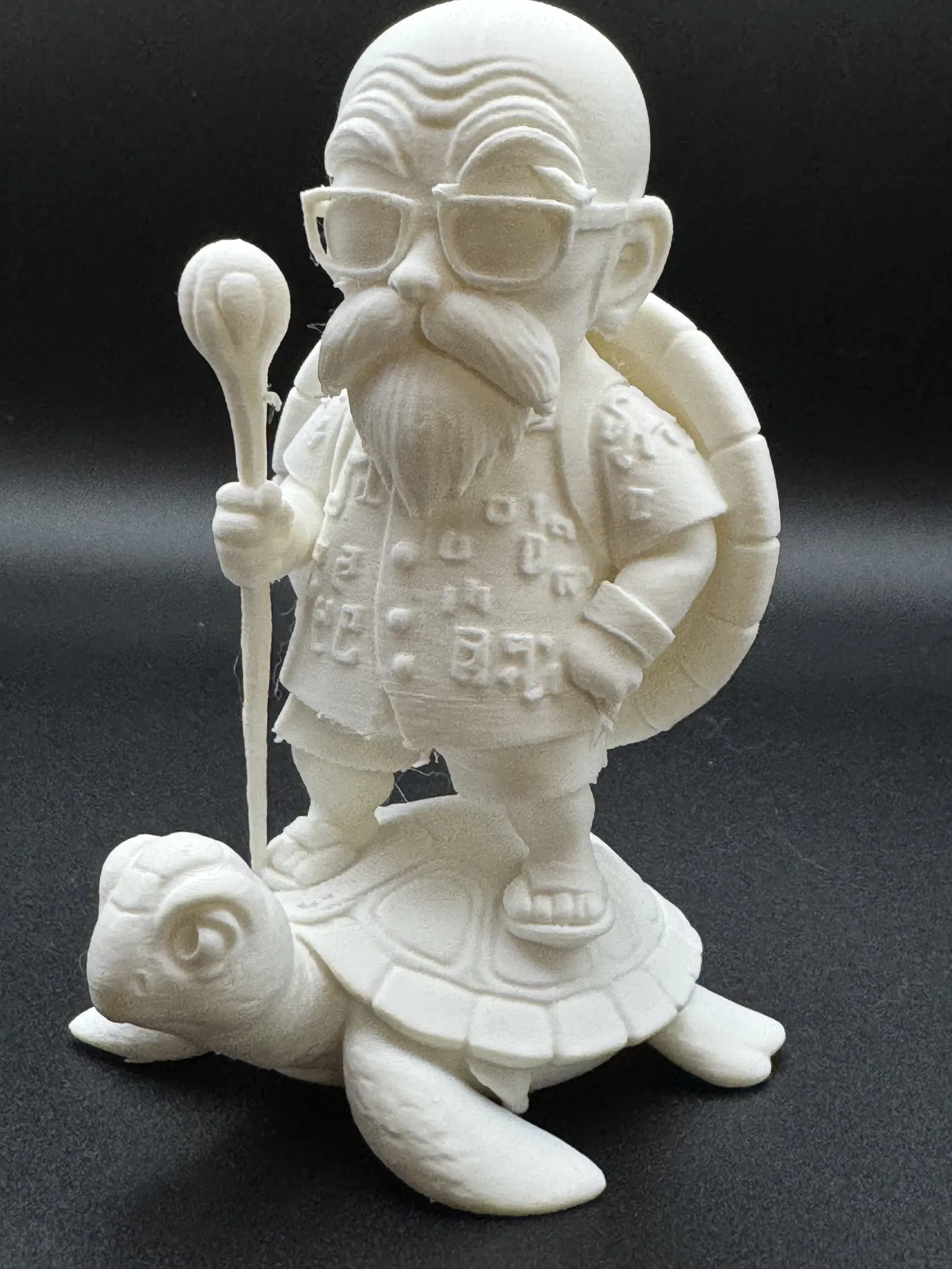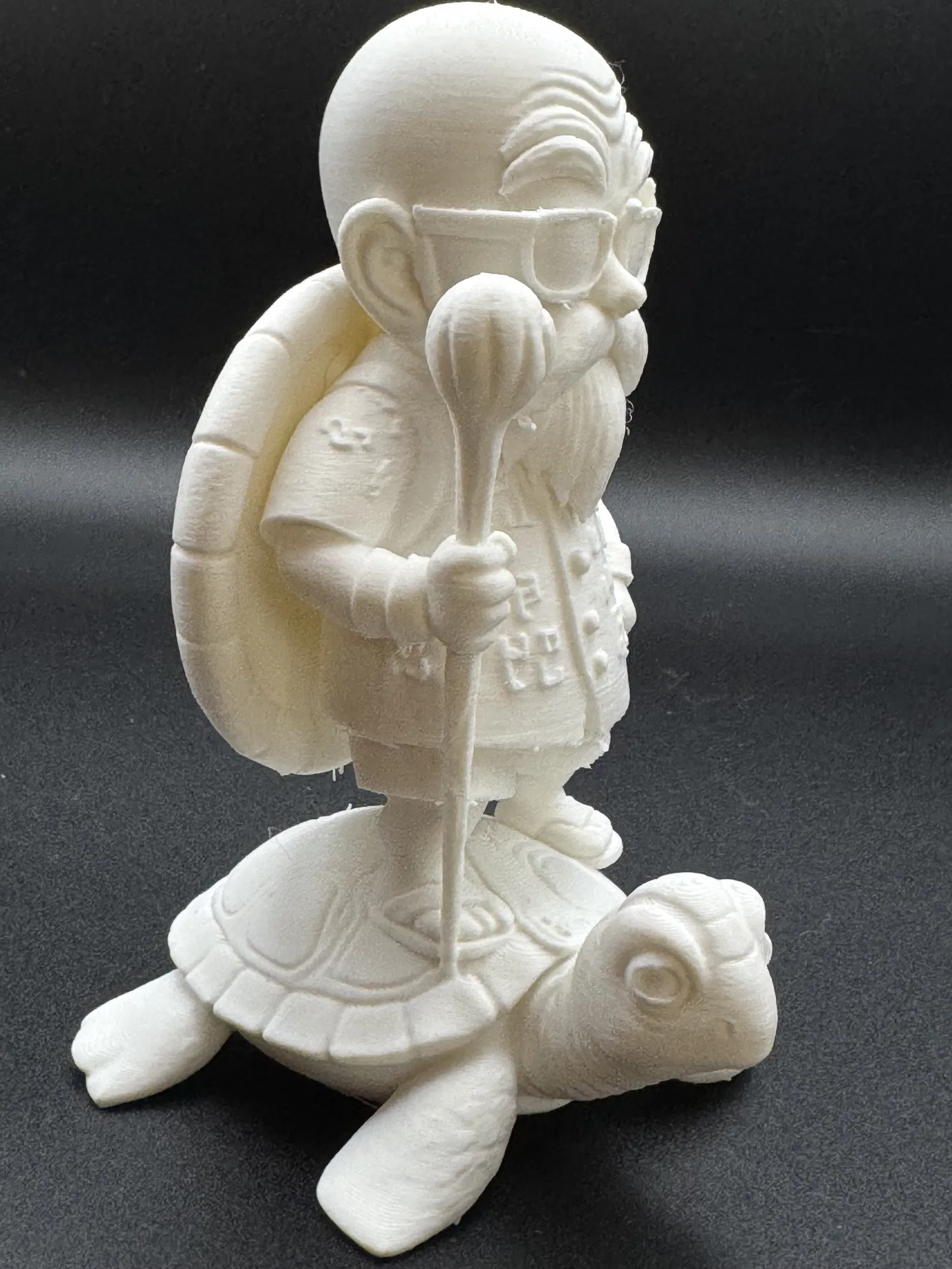 Thầy trò Muten Rùa - Thần Rùa trong Dragon Ball. Phần support khá dễ tháo, in bằng sợi PLA Polymaker Polyterra Cotton White. Nhớ nhẹ tay gỡ support nha, đặc biệt là chỗ gần chót cây quyền trượng, nên dùng dụng cụ chuyên dụng như kềm, kéo cắt mô hình. Chúc anh em in ấn vui vẻ!