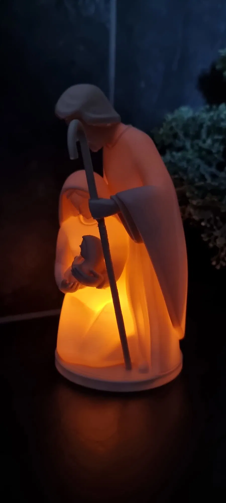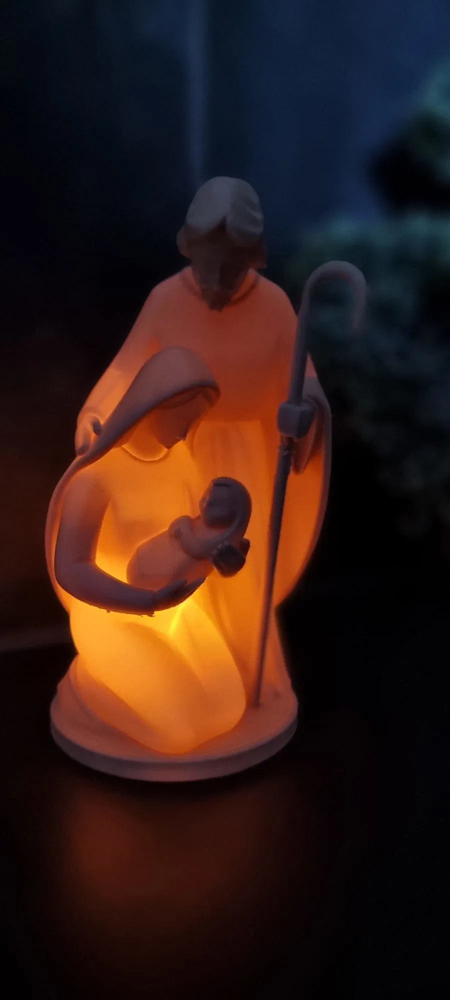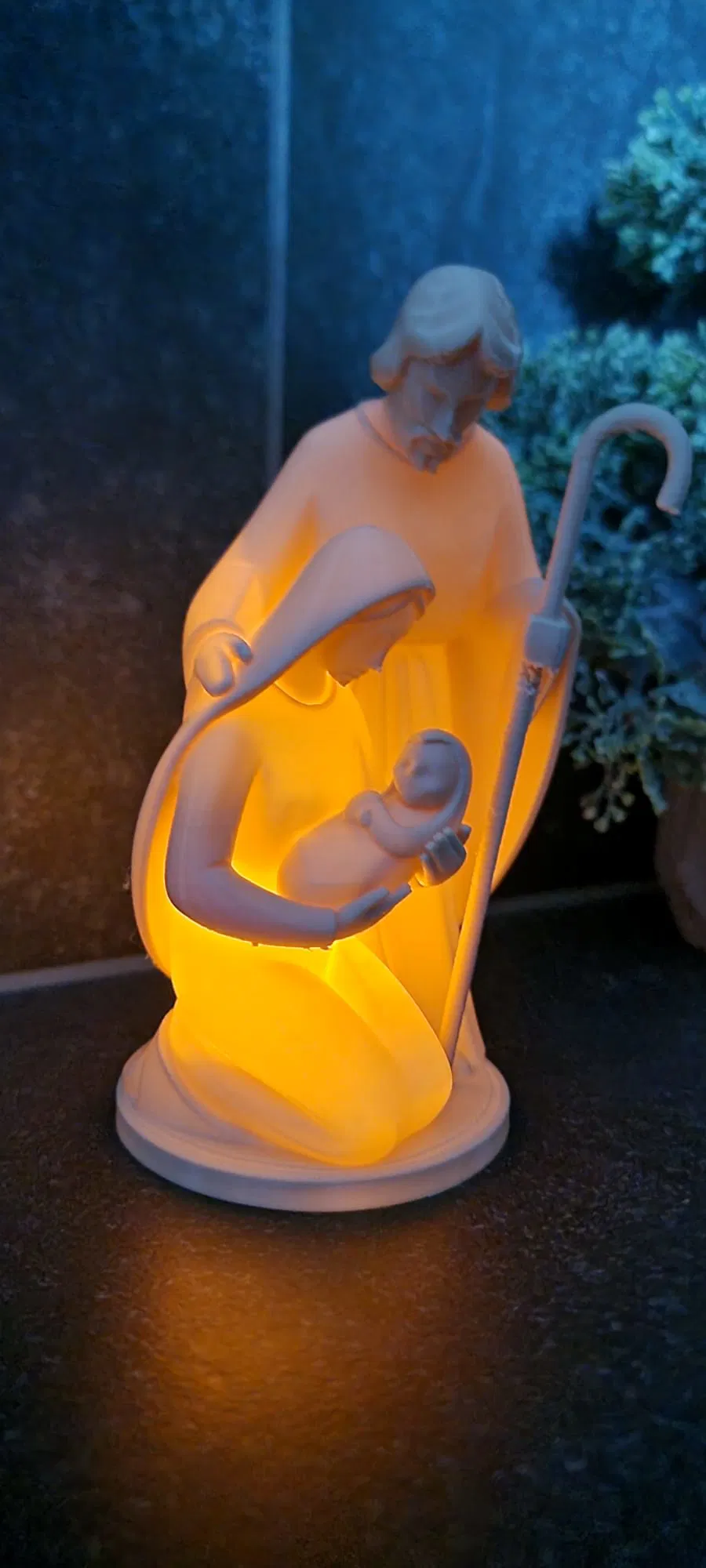 Bức tượng tái hiện khoảnh khắc thiêng liêng của Lễ Giáng Sinh, khắc họa hình ảnh Đức Mẹ Maria ẵm Chúa Hài Đồng Giêsu trên tay, với Thánh Giuse đứng phía trên, tay cầm cây trượng mục đồng. Vẻ mặt của họ chìm trong sự sùng kính và tình yêu thương. Điểm đặc biệt khiến tác phẩm này trở nên nổi bật chính là khả năng được thắp sáng.