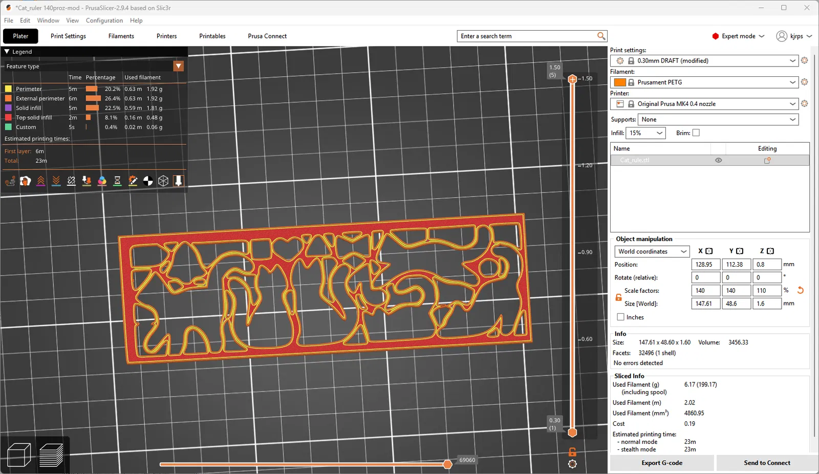 Lấy cảm hứng từ mẫu "cat-ruler", giờ đây mẫu này có thể in được và rất hữu dụng. Mô hình gốc quá mảnh, nên tôi đã điều chỉnh lại để dễ in hơn và phóng to lên 140%. Đảm bảo in với bù trừ X-Y là +0.5mm để có độ cứng cáp cần thiết, bạn có thể dùng bút chì vẽ lại hình mèo.