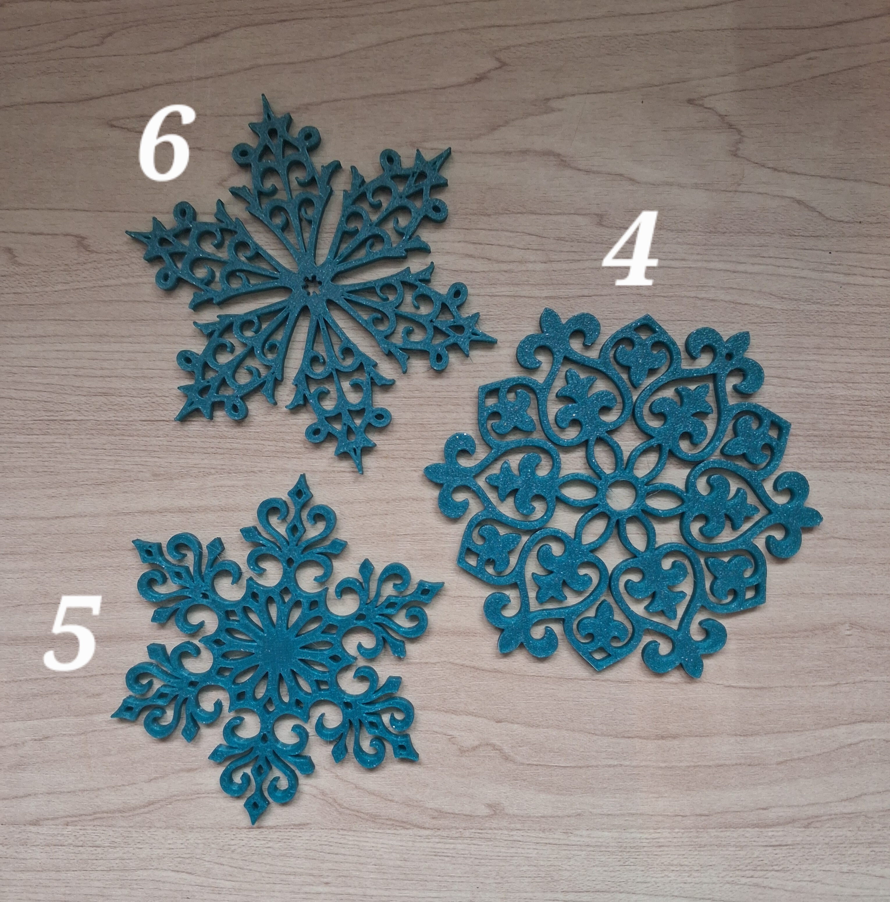 Đây là mấy cái Móc Trang Trí Tuyết Rơi đơn giản nè. Bộ này có ba cái nha. Mình có mấy bộ tuyết rơi khác nữa, mọi người qua trang của mình xem nha. Chúng dày 3mm, nên khá chắc chắn, mà cũng không quá dày cho một bông tuyết đâu. Mấy cái này có đánh số, mọi người xem hình thứ hai để biết số nha. Tất cả đều có lỗ ở trên đỉnh nên dễ dàng luồn dây qua (lỗ to hay nhỏ tùy bông tuyết, của mình thì vừa đẹp)