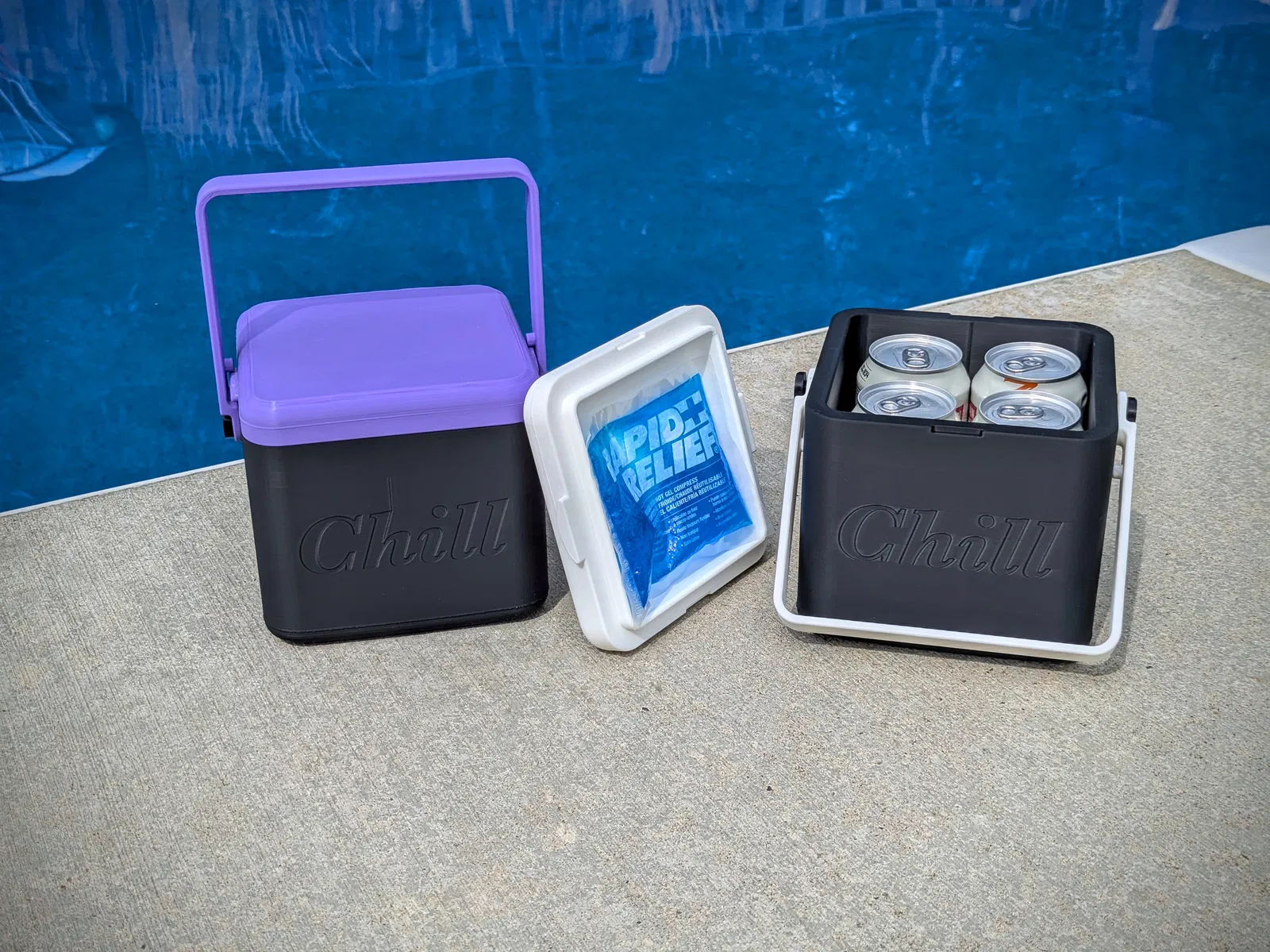Giờ có mấy cái đáy lận nè, cái loại 142mm (nắp trắng) thì có cả loại có chữ "Chill" nổi và loại trơn để bạn tự dập nổi thông điệp mùa hè của riêng mình. Cái 142mm tui đề nghị cho lon bia bình thường nha, nó có đủ không gian để bỏ thêm túi gel giữ lạnh lên trên mấy lon bia cho mát hơn nữa đó. Còn cái 130mm (nắp tím) là kích cỡ zin, không có không gian dư đó đâu. Cái 172mm (tui chưa có in thử) thì nên chỉnh kích cỡ cho mấy lon bia cao (16oz) nha.