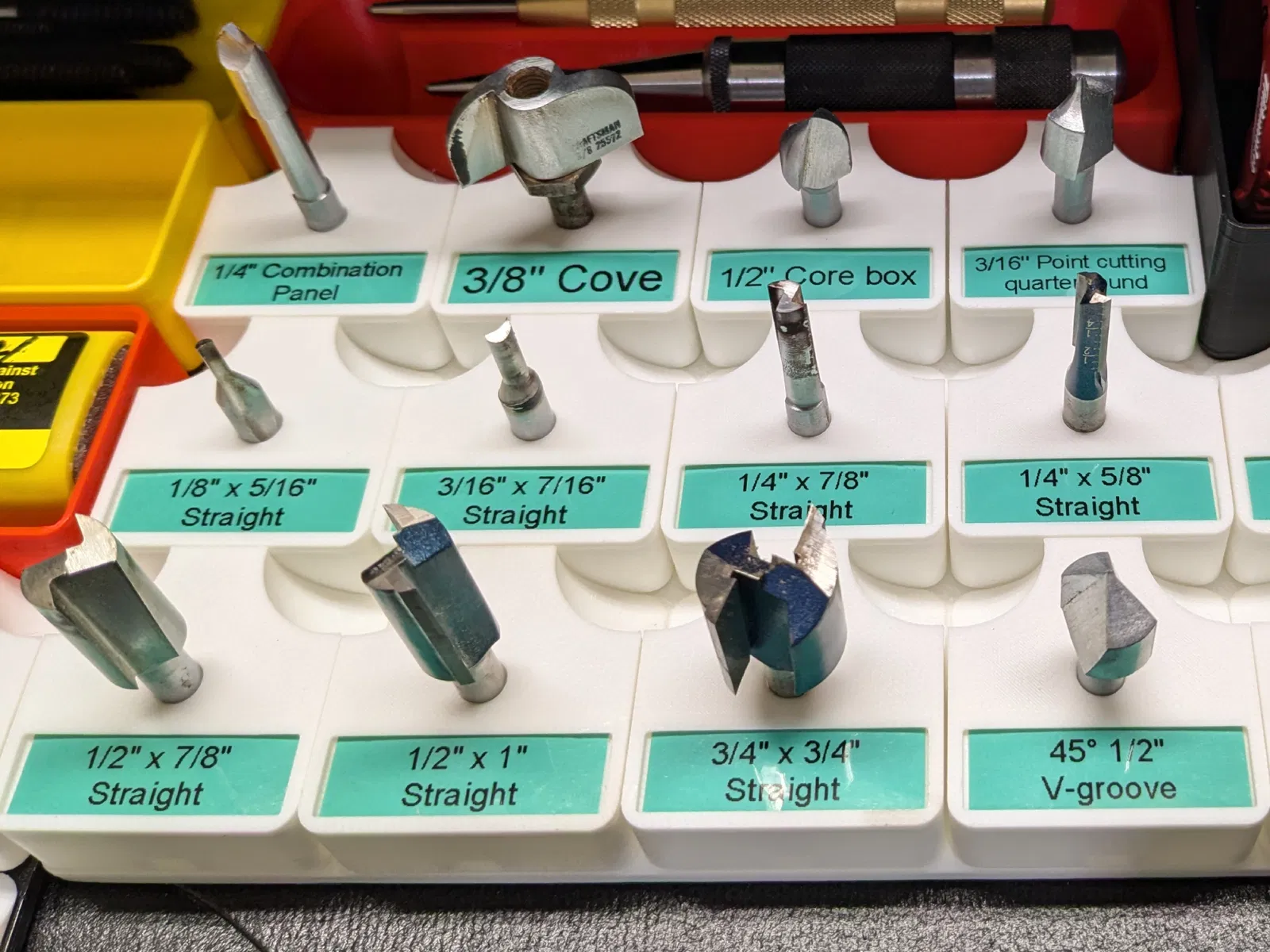Hộp đựng mũi phay router tương thích Gridfinity, có khe dán nhãn kích thước 37x12mm, ví dụ như nhãn 1/2" của Brother/Dymo. Nhãn được giữ trong khe bằng một gờ nhỏ, không cần keo dán, nhưng cũng không bị rơi ra ngoài. Hai phần lõm giúp nhấc từng hộp ra dễ dàng. Có sẵn các kích cỡ 6mm, 1/4", 8mm, 3/8", 12mm và 1/2".