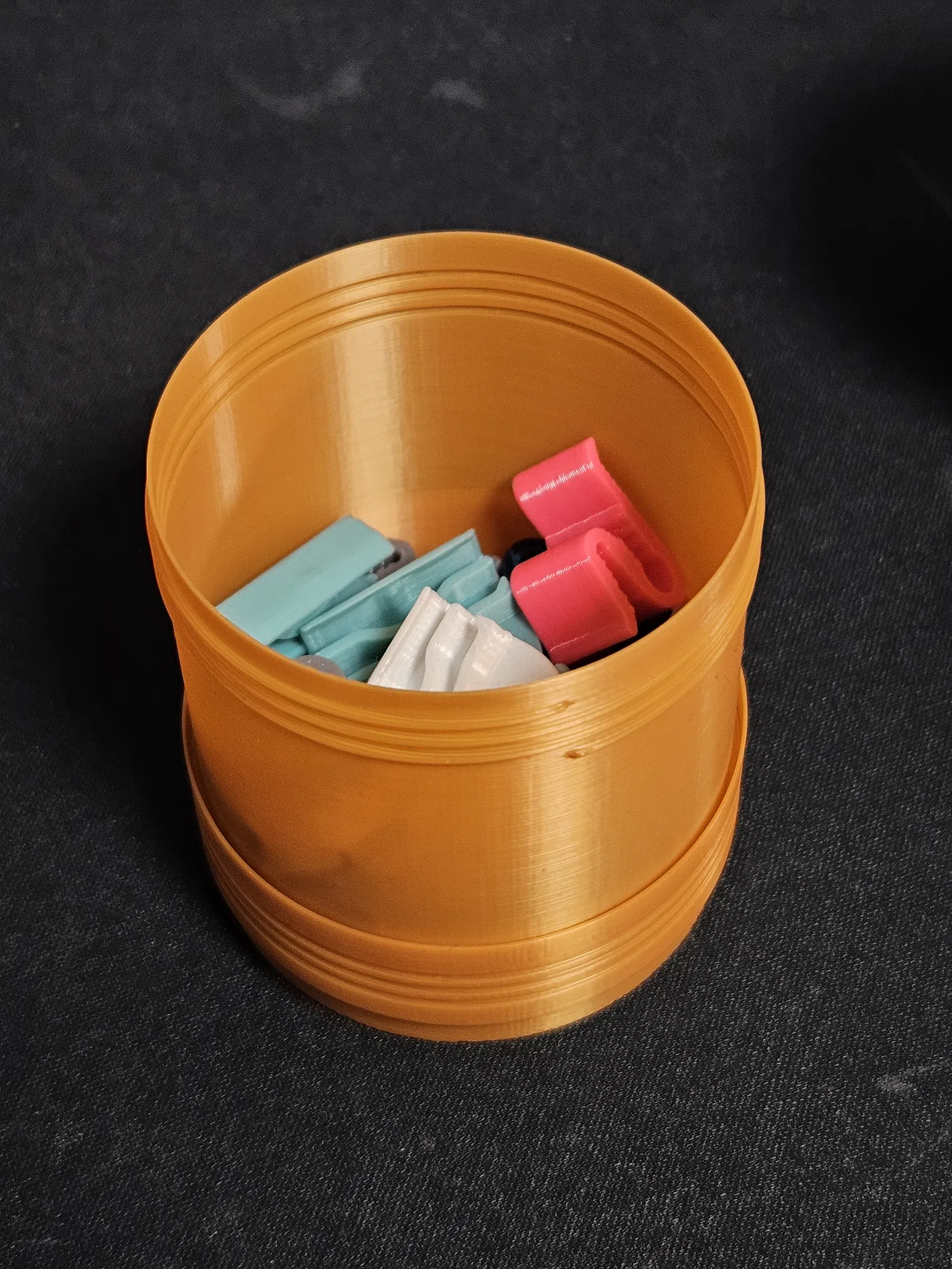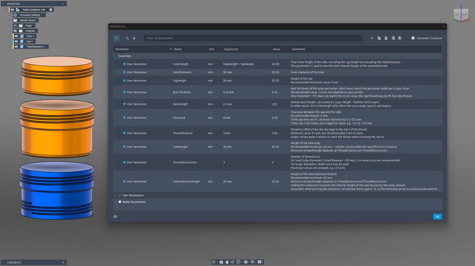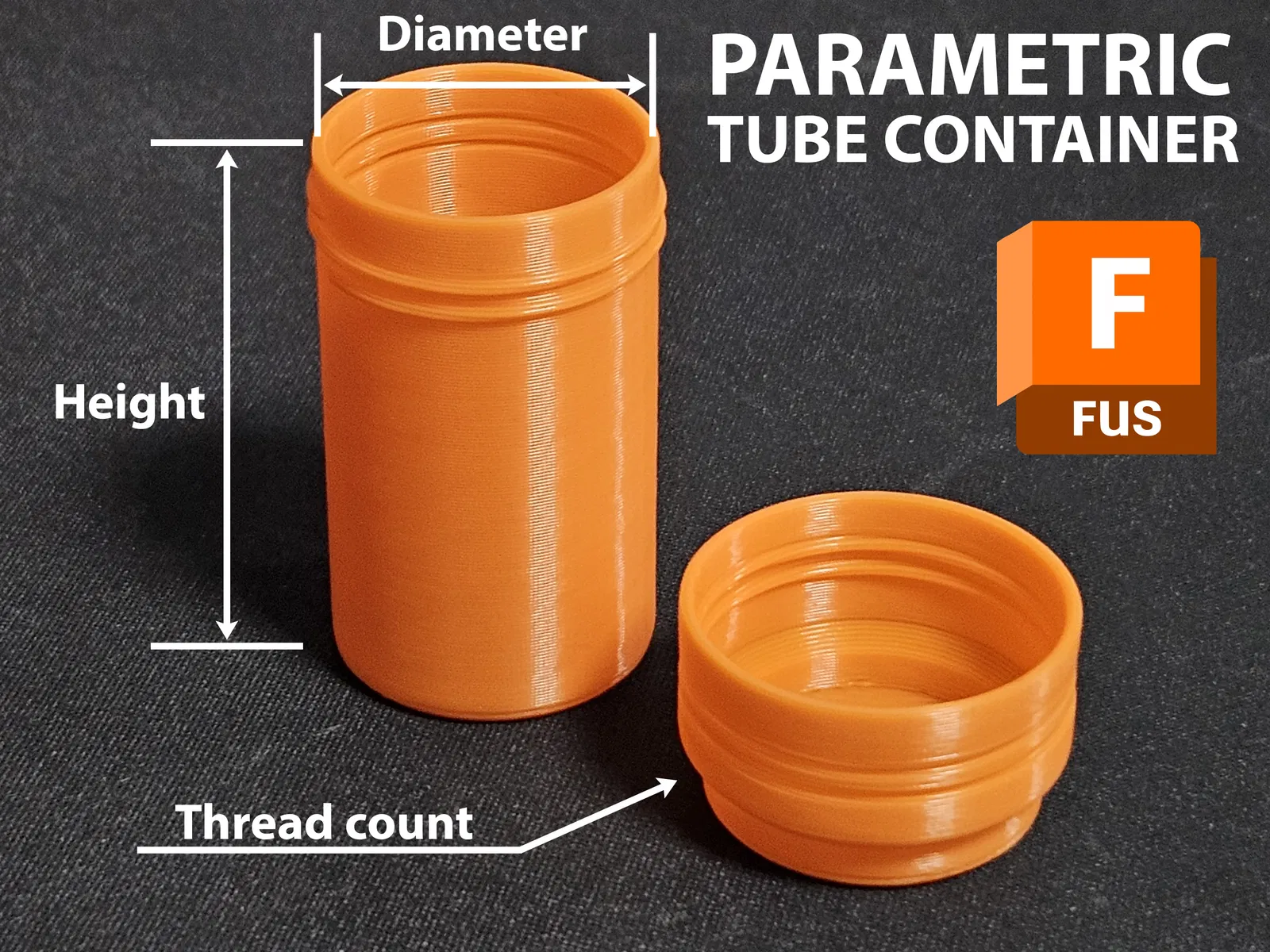 Mô hình Fusion 360 theo tham số này cho phép bạn tạo ra một hộp đựng dạng ống với mọi kích thước. Đường kính chỉ bị giới hạn bởi bàn in của bạn, và tổng chiều dài có thể dài tùy thích bằng cách sử dụng các phần nối dài có thể tháo rời, kết nối bằng khớp ren.
