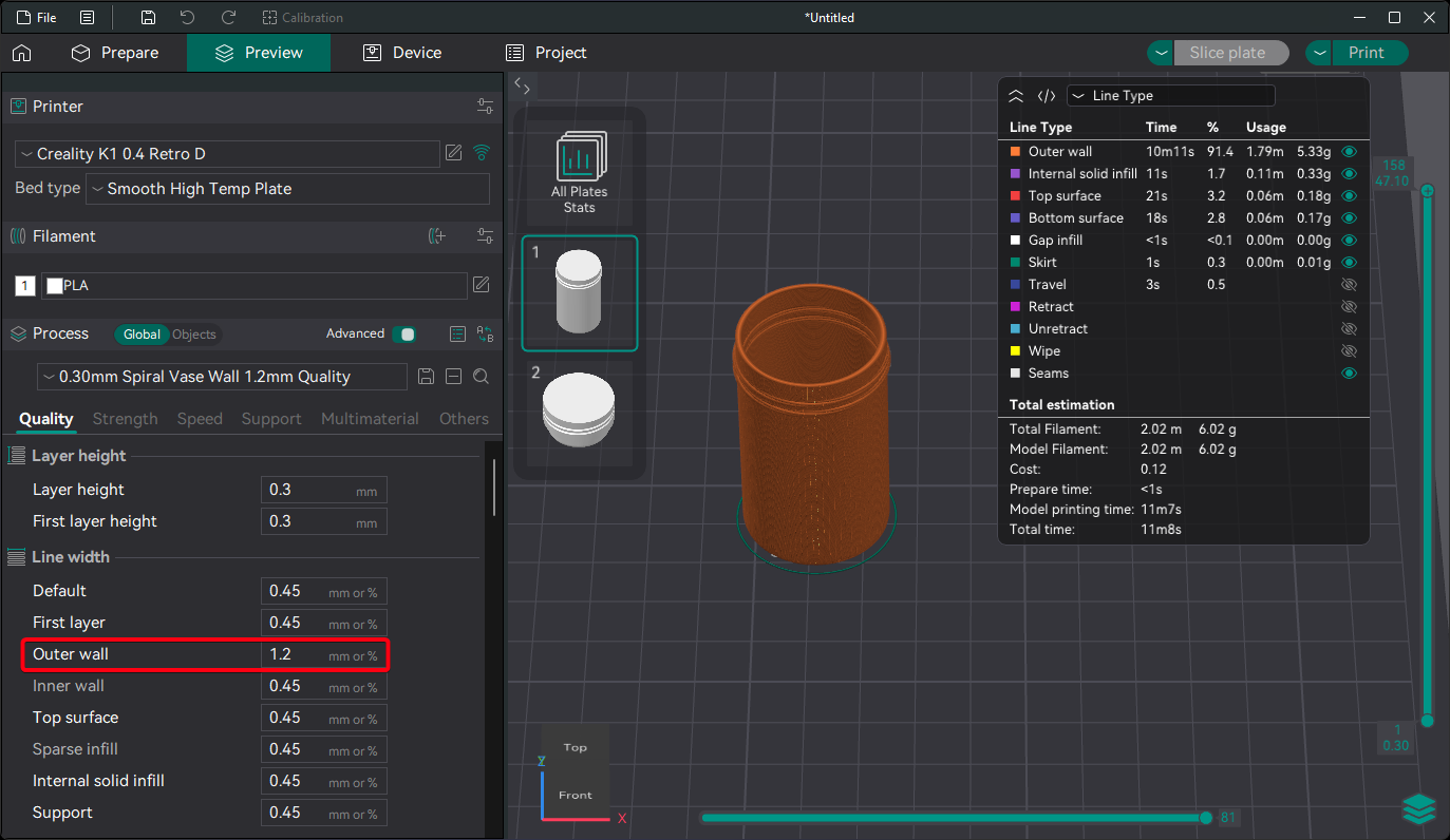 - WallThickness Độ dày của một lớp tường được sử dụng trong slicer của bạn. Khuyến nghị: 1.2 mm, nhưng tùy thuộc vào máy in của bạn. ⚠ Rất quan trọng để ren khớp.