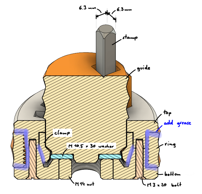 Bộ khuôn khắc gồm bốn bộ phận: đế, nắp, vòng và kẹp. Lấy cái kẹp trước, cho ít dầu mỡ vào mấy chỗ có ma sát với nhau. Rồi vặn cái kẹp vào cái vòng. Tiếp theo, lấy cái nắp trên và đặt cho khớp với vòng và kẹp. Sau đó, bạn vặn tất cả các bộ phận lại với nhau bằng vít M3x20. Cuối cùng, gắn con ốc M10 vào đế.
