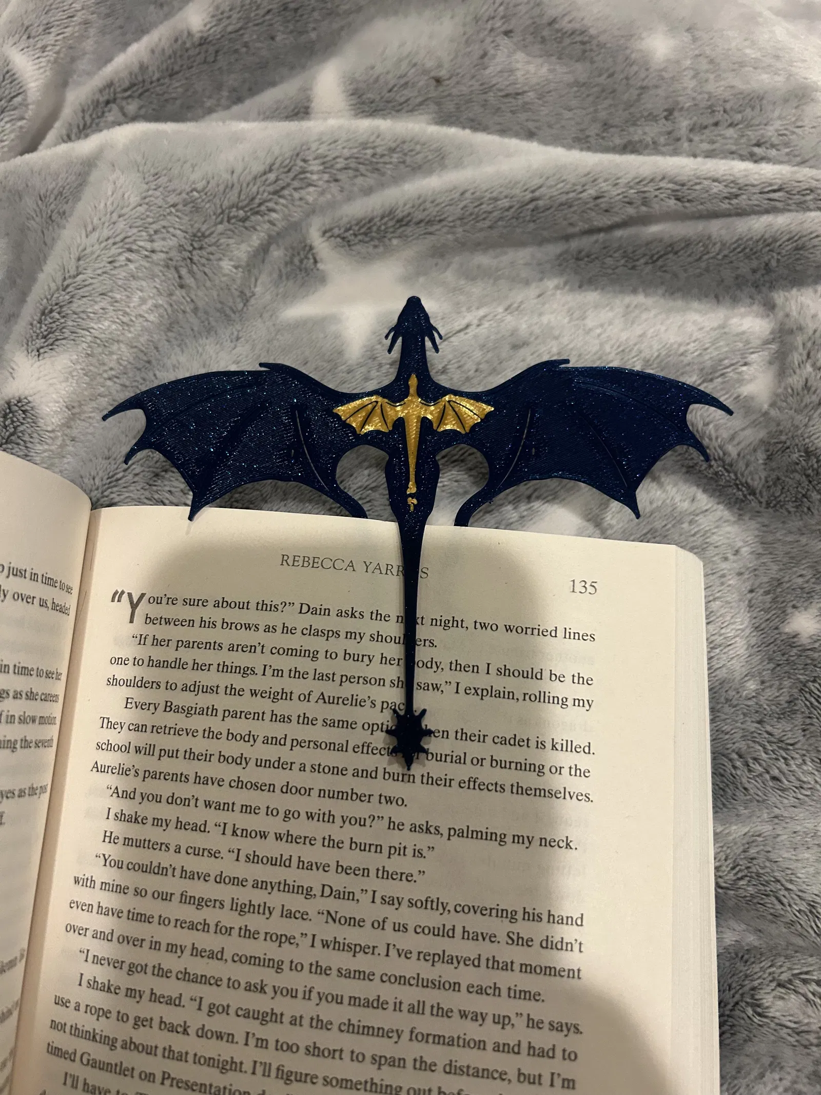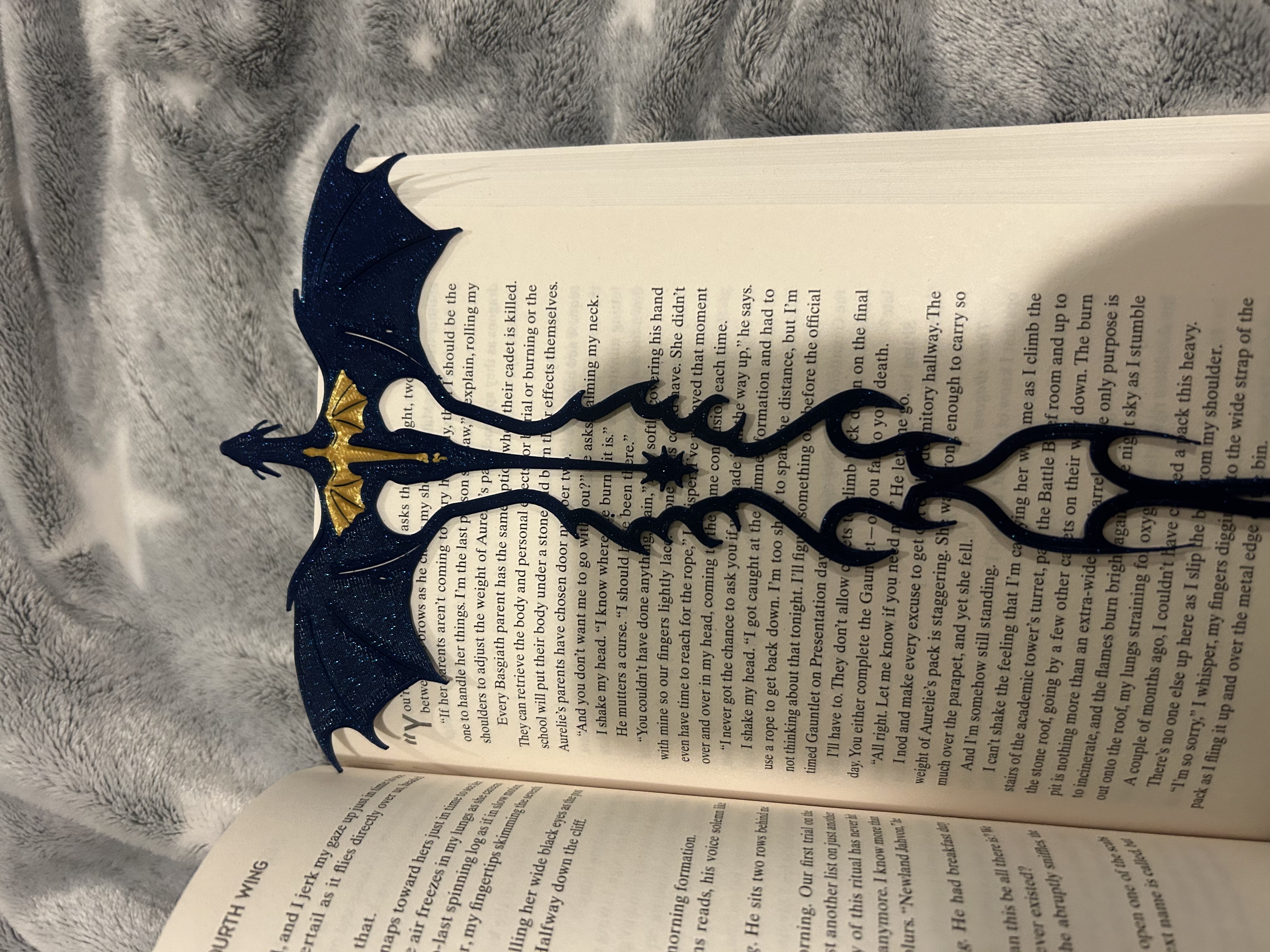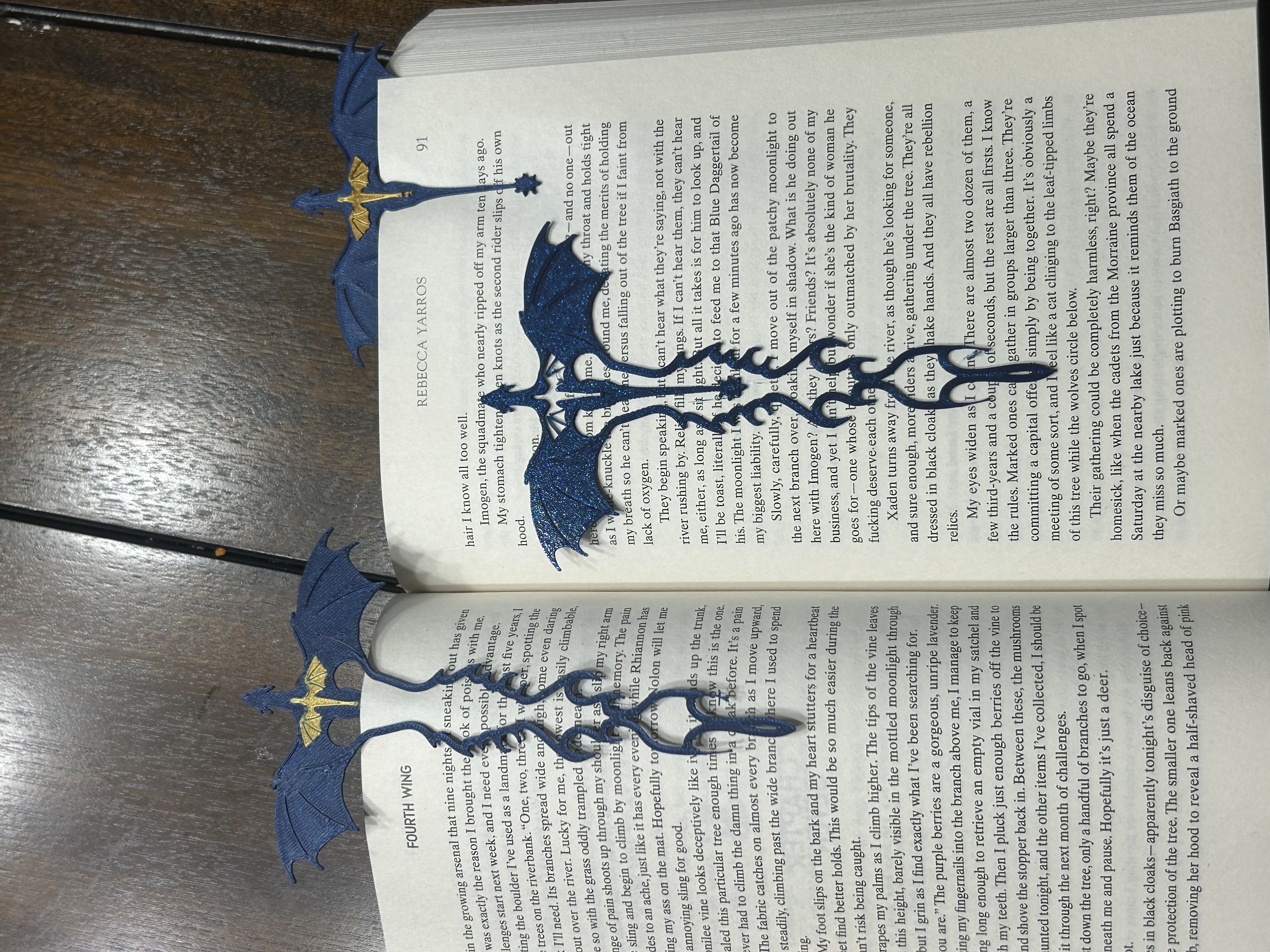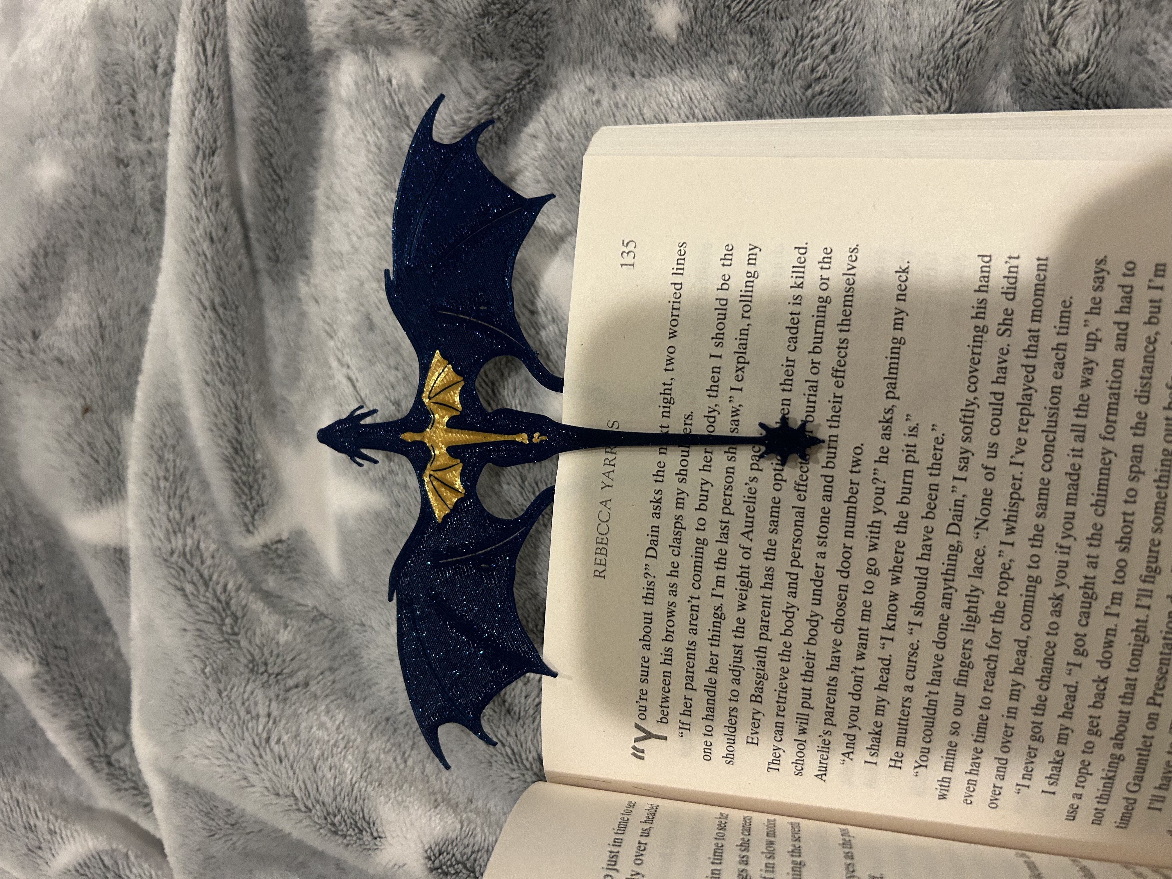 Đuôi của Tairn có thể nhấc lên hoặc ấn vào, cho phép nó đặt lên trang sách và kẹp bookmark vào trang đó.