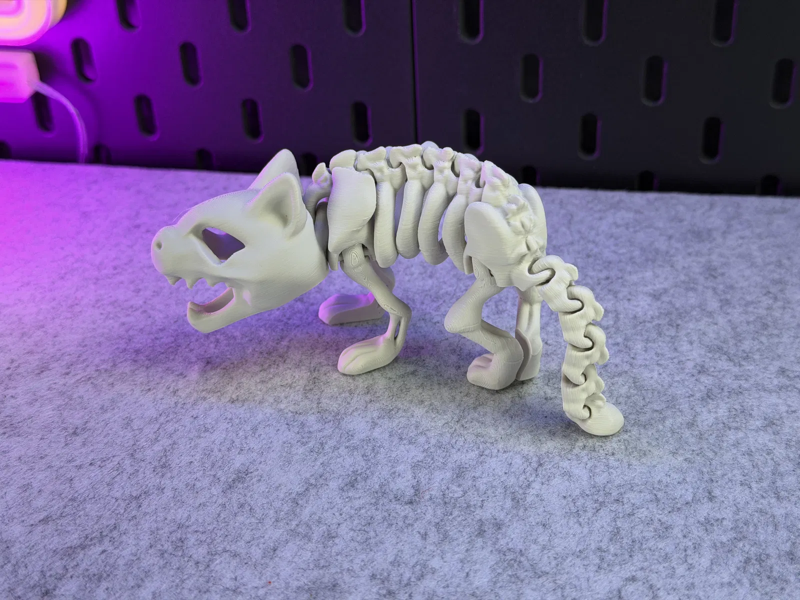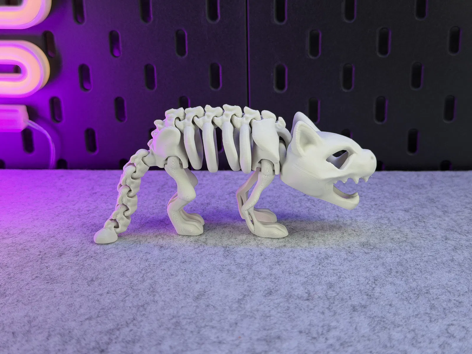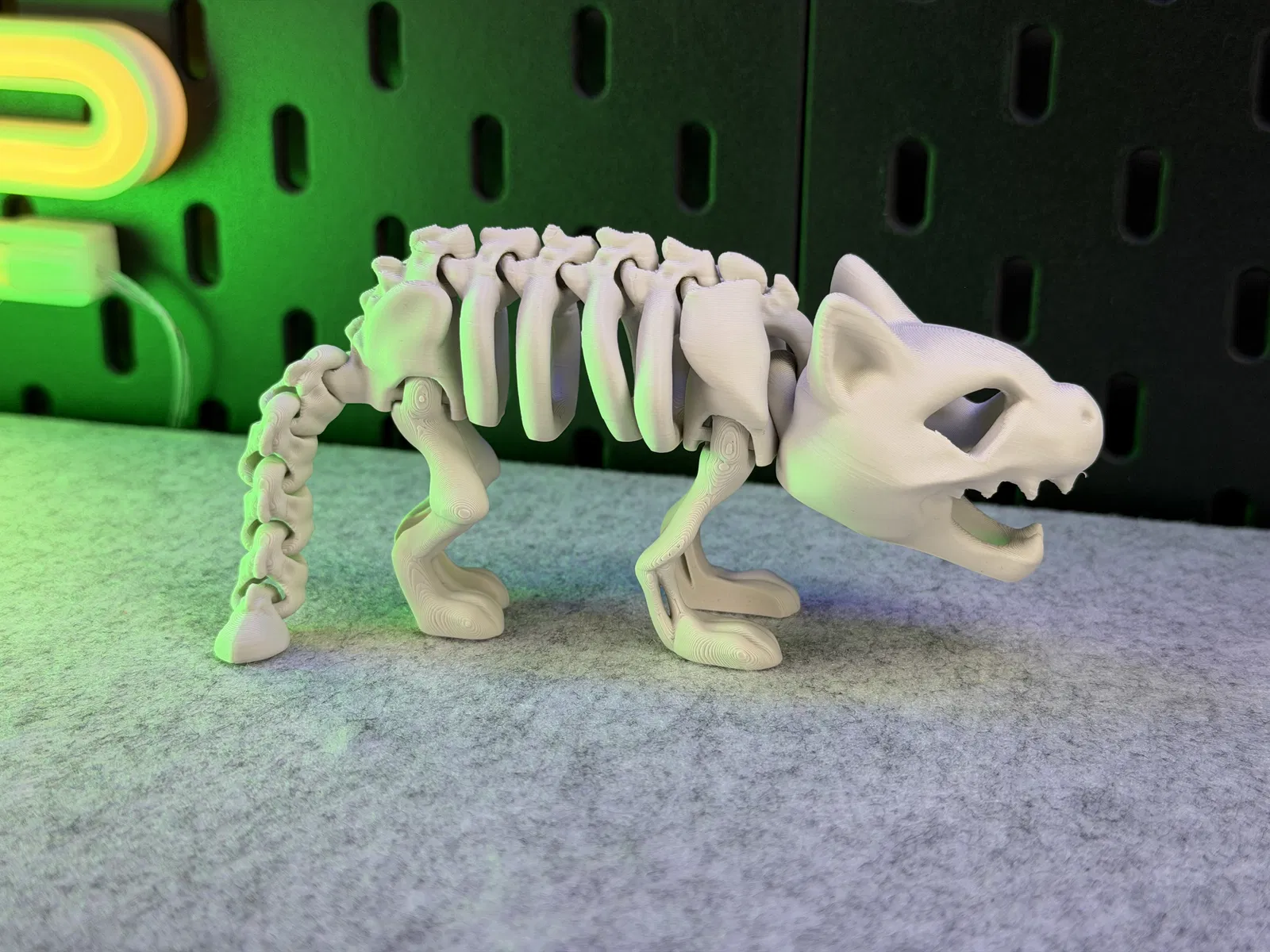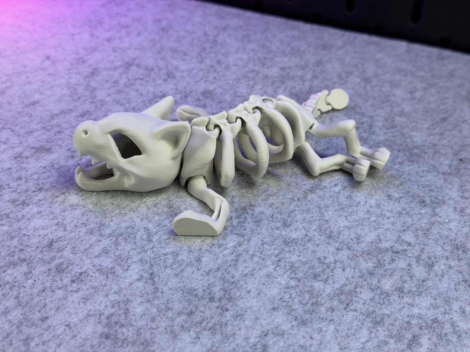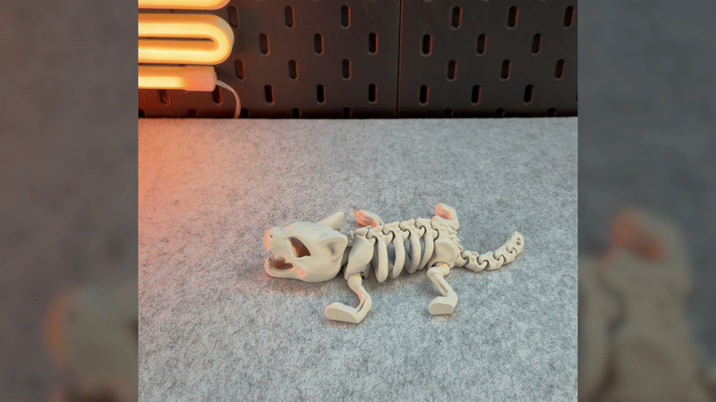 Mô hình Mèo Bộ Xương Khớp Nối, in được một màu. Có thể đứng vững! Hướng dẫn in chi tiết với vật liệu PLA, hỗ trợ cho đầu, cài đặt lớp, vòng thành, độ dày ruột, và lưu ý về khay in. Cảnh báo không scale nhỏ, tránh dùng lực mạnh làm gãy khớp nối và cẩn thận khi gỡ khỏi khay in. Sản phẩm không dành cho trẻ em hoặc thú cưng.