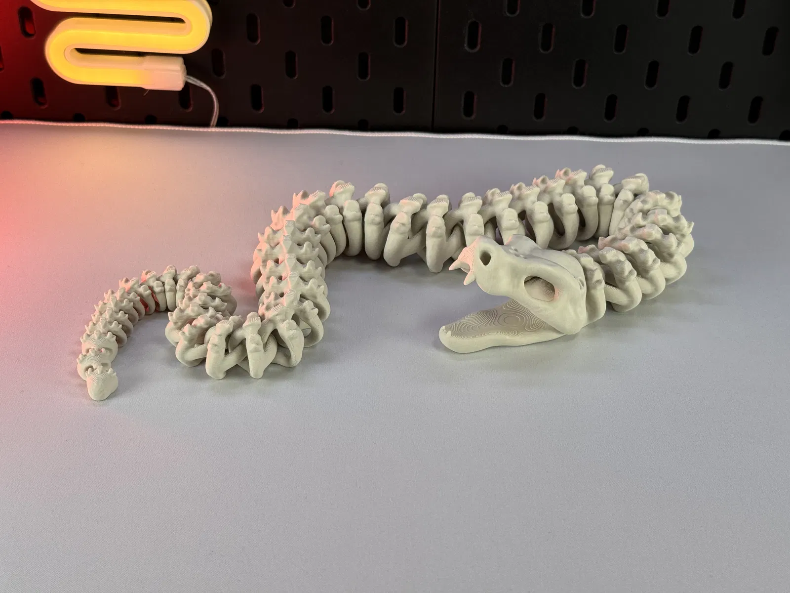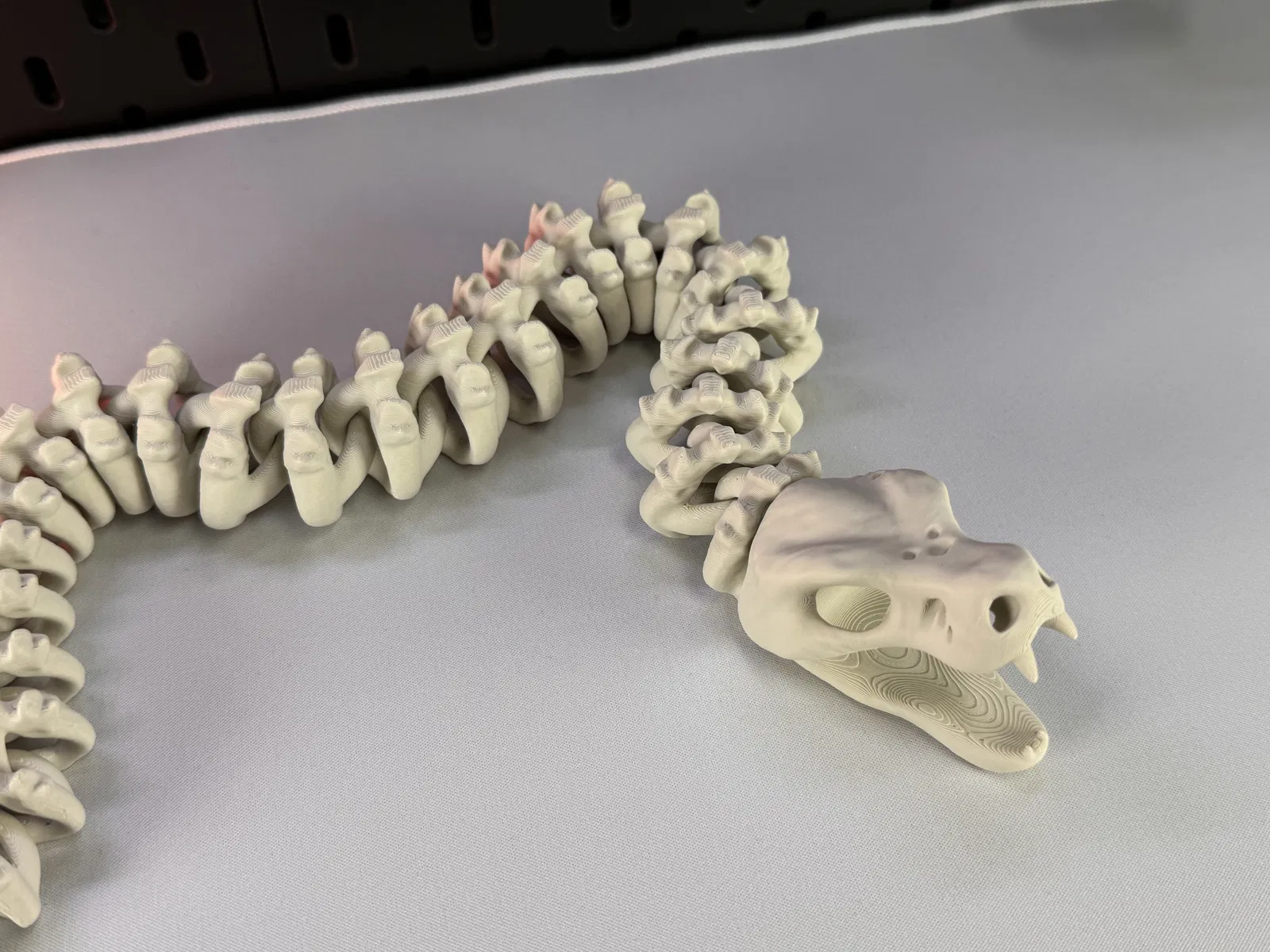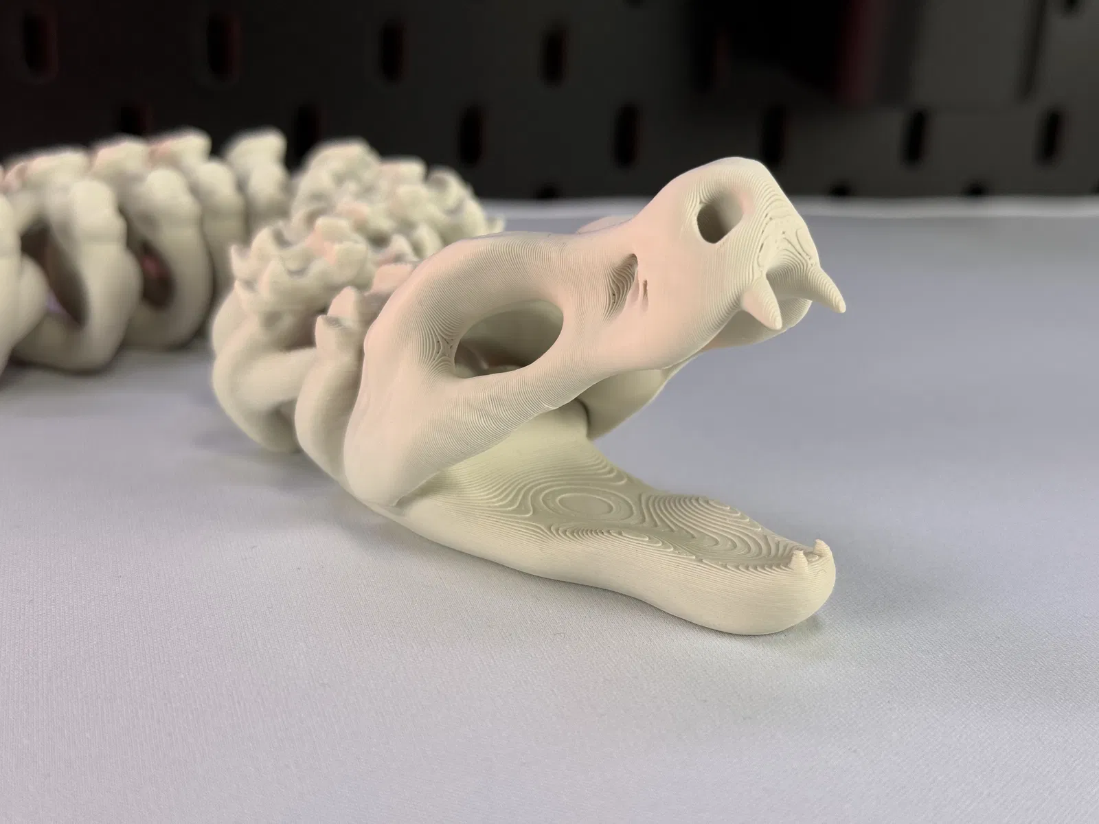 Mô hình Rắn Bộ Xương Khớp Nối (In một màu). Mô hình có đầu và thân riêng biệt, dễ dàng lắp ráp. Lưu ý cẩn thận khi lắp ráp. Hướng dẫn in chi tiết bao gồm các cài đặt khuyến nghị cho PLA, không cần hỗ trợ, chiều cao lớp 0.2mm, và các mẹo khác. Cảnh báo về an toàn cho trẻ em và vật nuôi. Không thay đổi kích thước mô hình để đảm bảo khớp nối hoạt động tốt.