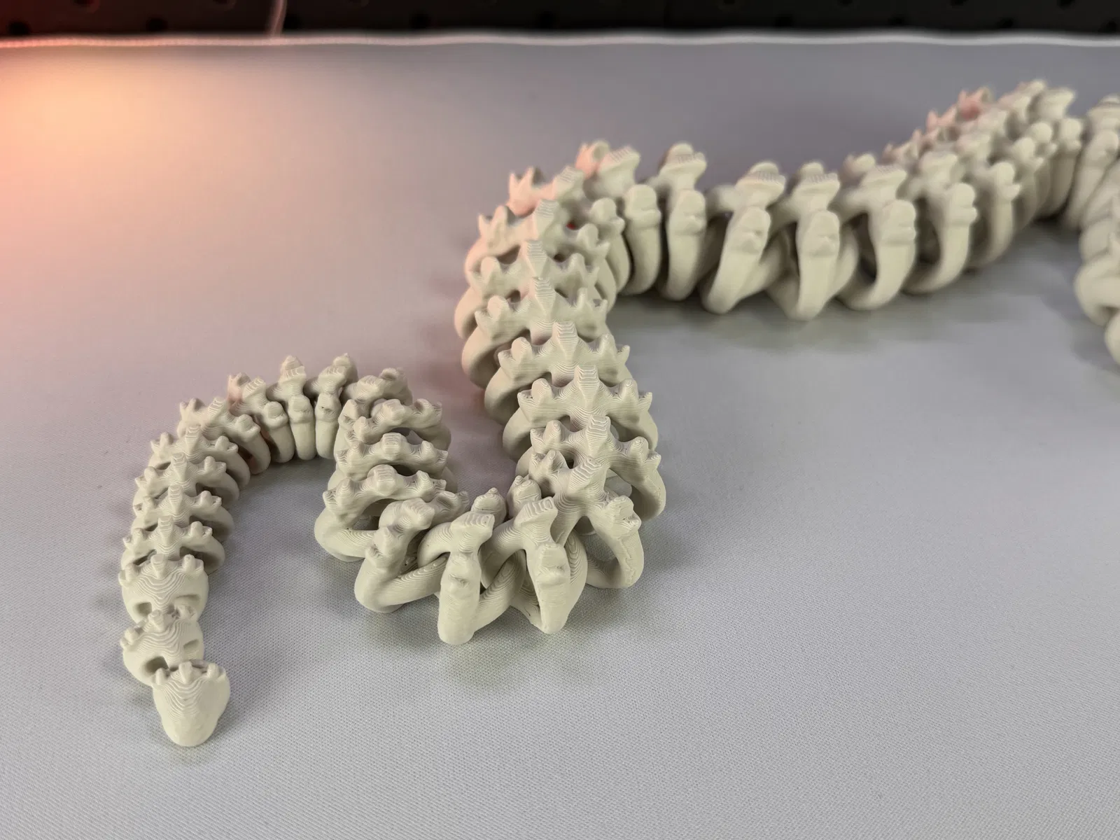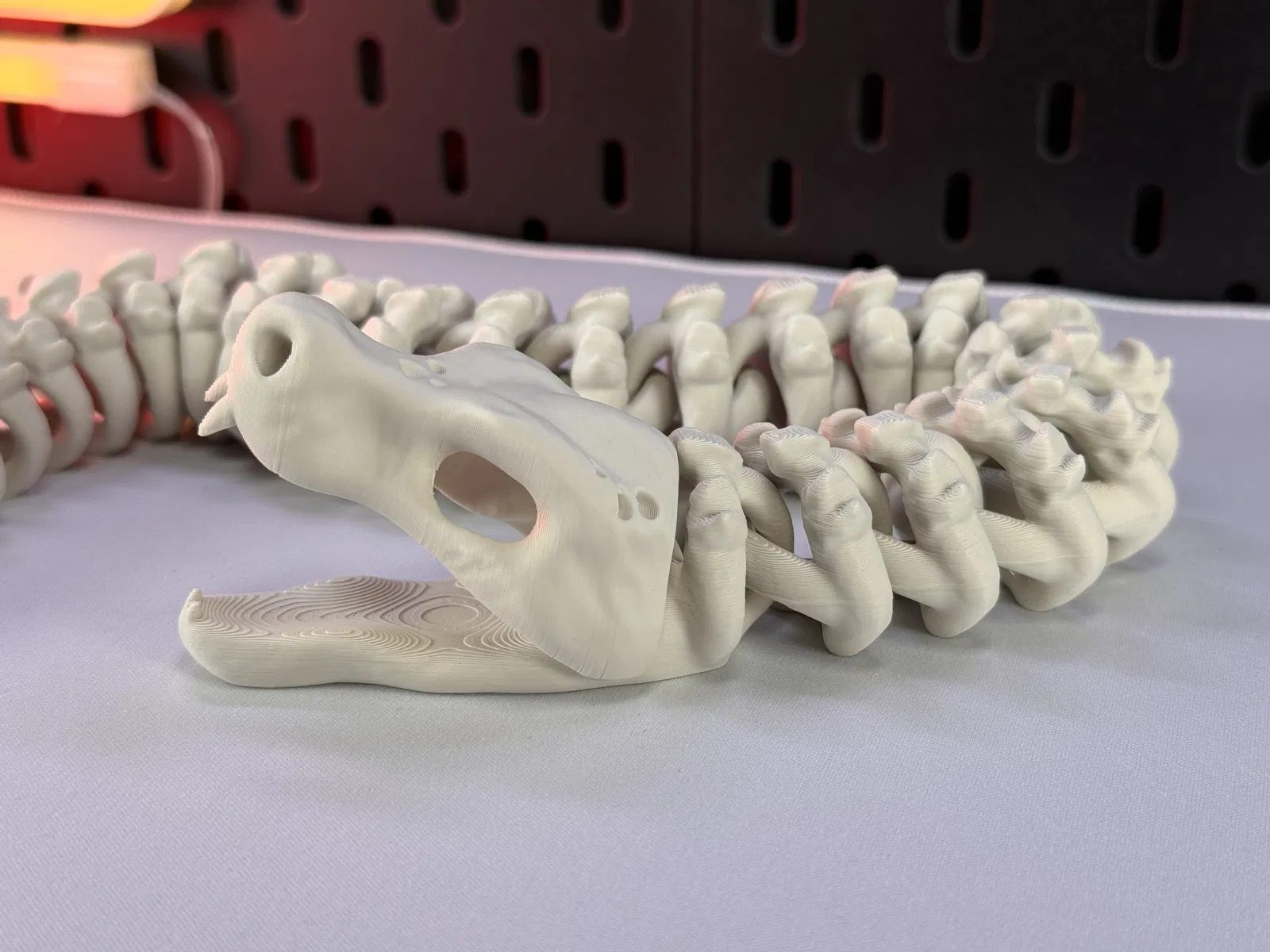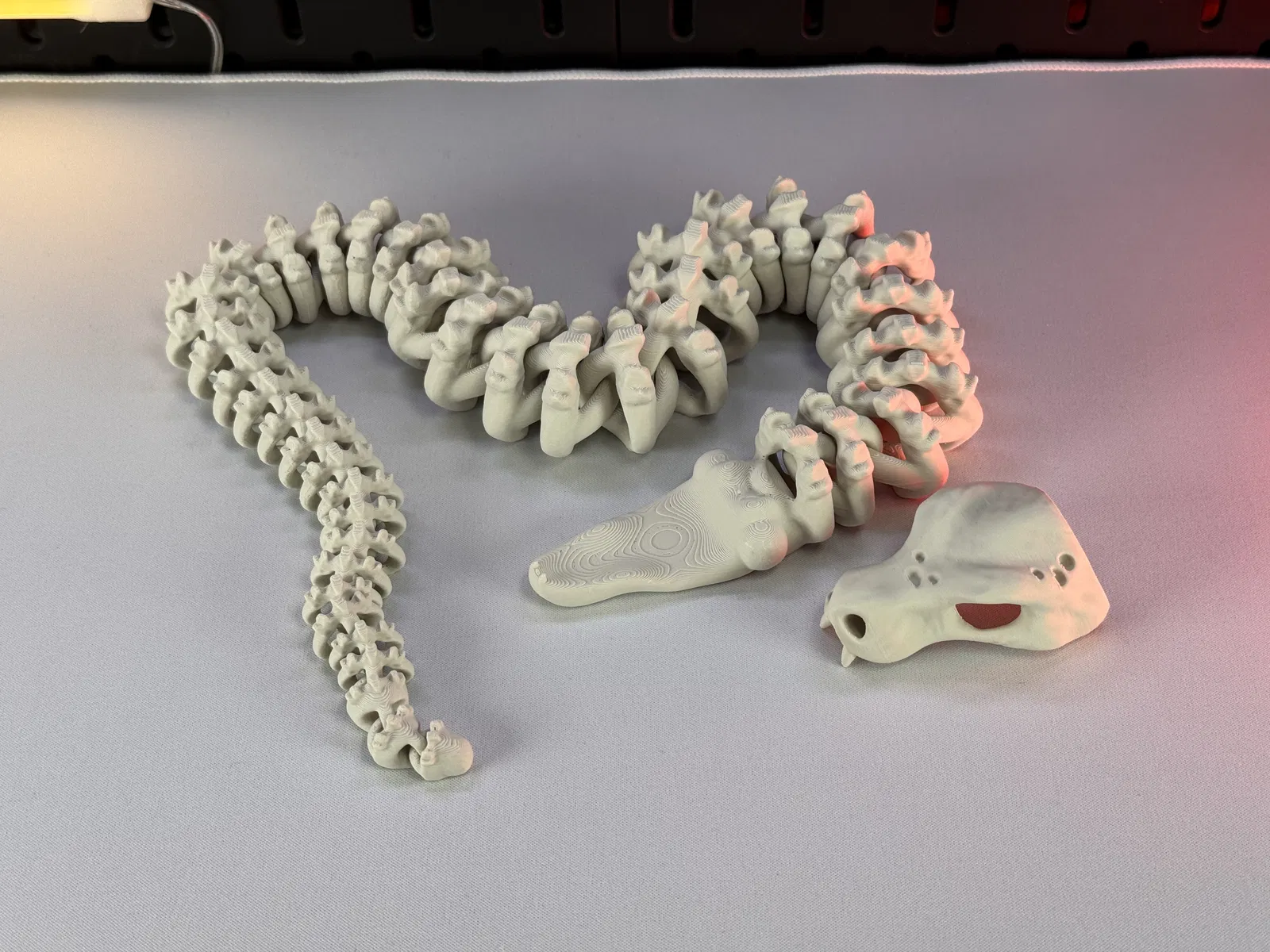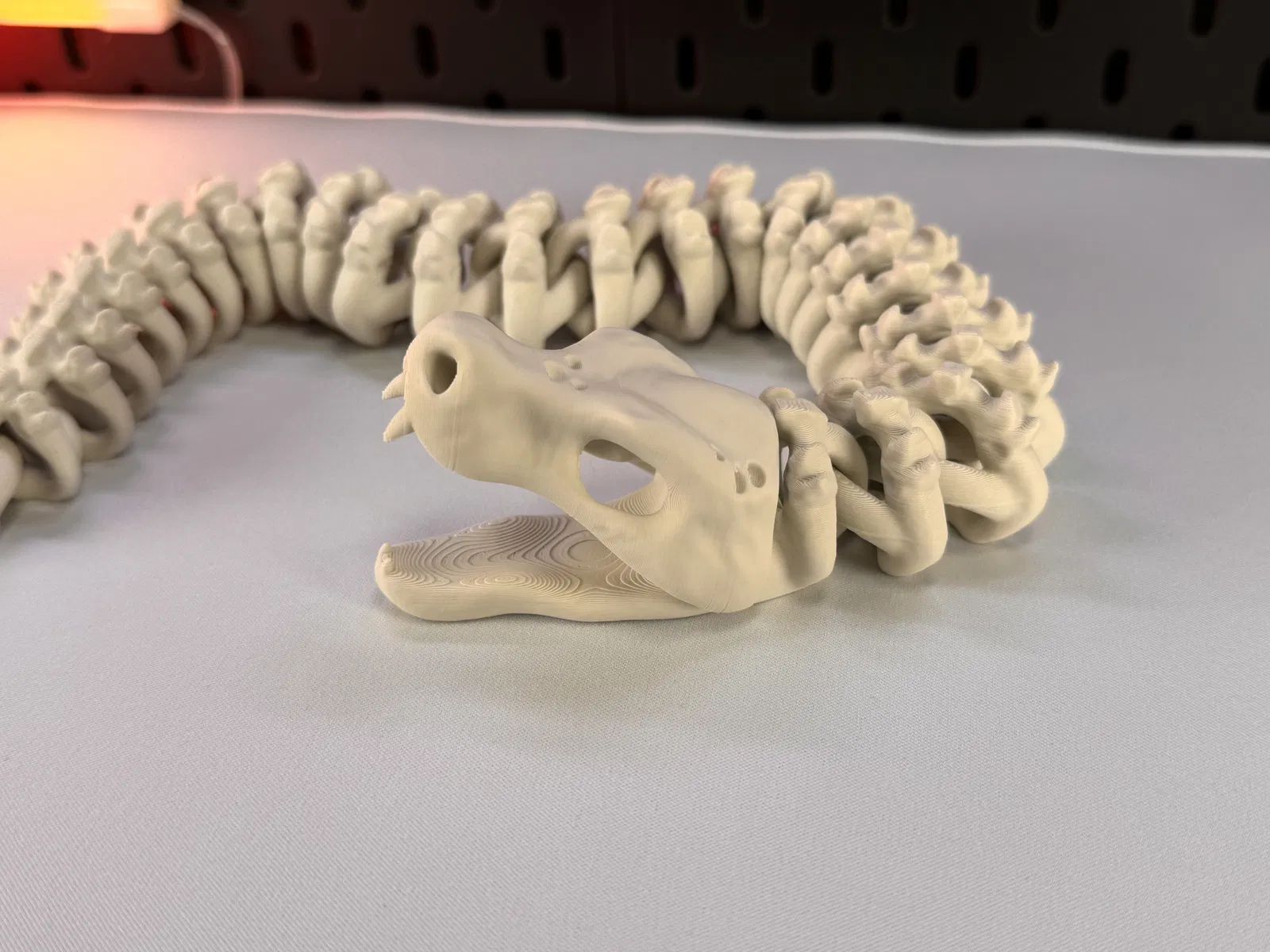 Mô hình Rắn Bộ Xương Khớp Nối (In một màu). Mô hình có đầu và thân riêng biệt, dễ dàng lắp ráp. Lưu ý cẩn thận khi lắp ráp. Hướng dẫn in chi tiết bao gồm các cài đặt khuyến nghị cho PLA, không cần hỗ trợ, chiều cao lớp 0.2mm, và các mẹo khác. Cảnh báo về an toàn cho trẻ em và vật nuôi. Không thay đổi kích thước mô hình để đảm bảo khớp nối hoạt động tốt.