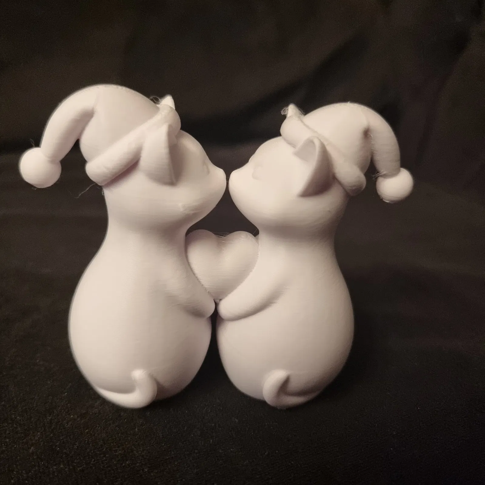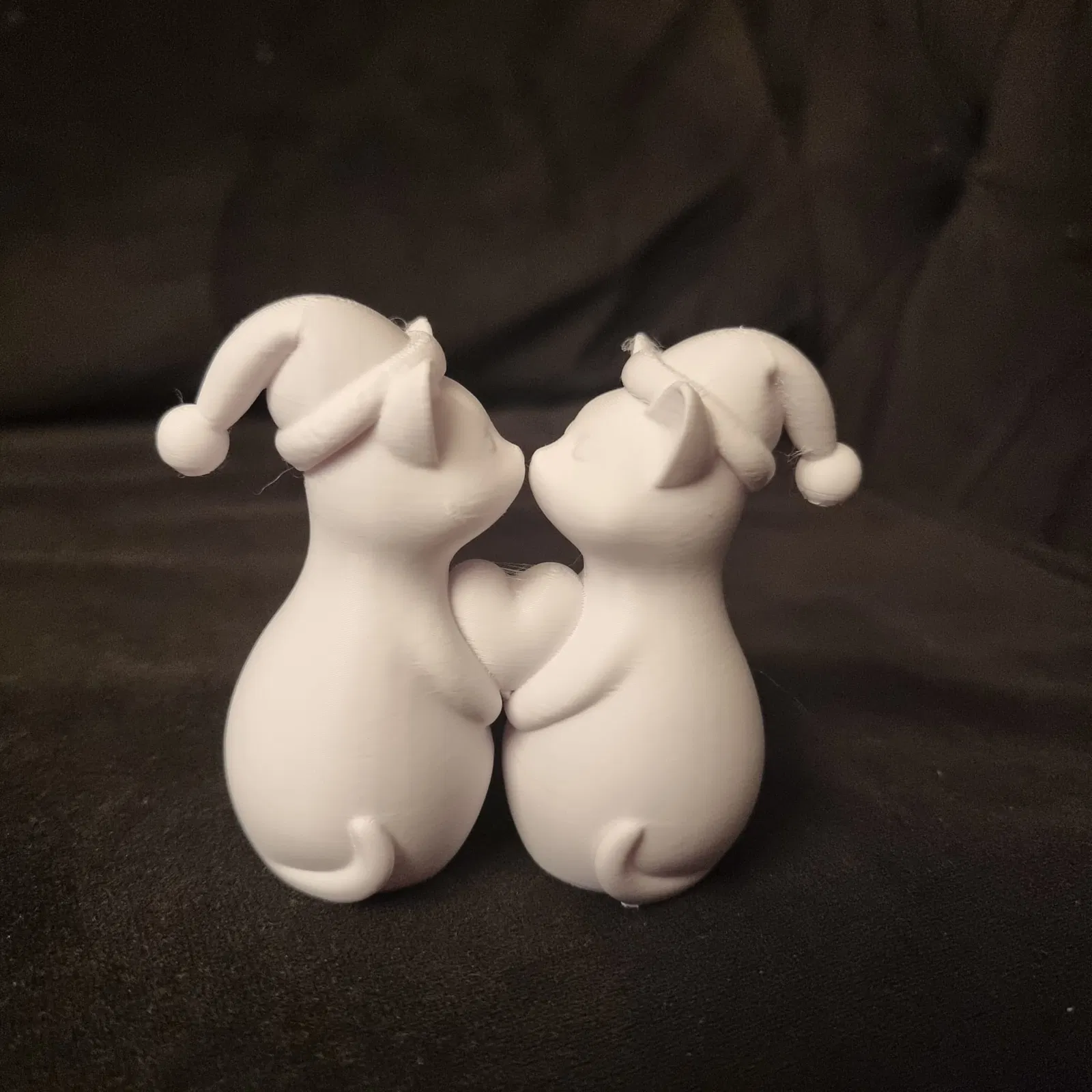 Cặp đôi mèo dễ thương đội mũ Noel, tay ôm trái tim, thích hợp làm đồ trang trí nhà cửa, mang không khí Giáng sinh ấm áp và tình cảm.