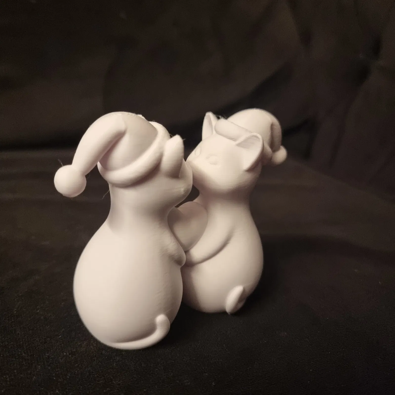 hai chú mèo cách điệu đứng cạnh nhau. Những chú mèo đang đội mũ ông già Noel, cho thấy chủ đề Giáng sinh hoặc ngày lễ. Chúng được tạo dáng đối mặt với nhau, đầu chạm vào nhau và chân quấn quanh một trái tim nhỏ ở giữa, tượng trưng cho tình yêu và sự gắn bó. Tổng thể mang tính thẩm mỹ dễ thương và vui nhộn.