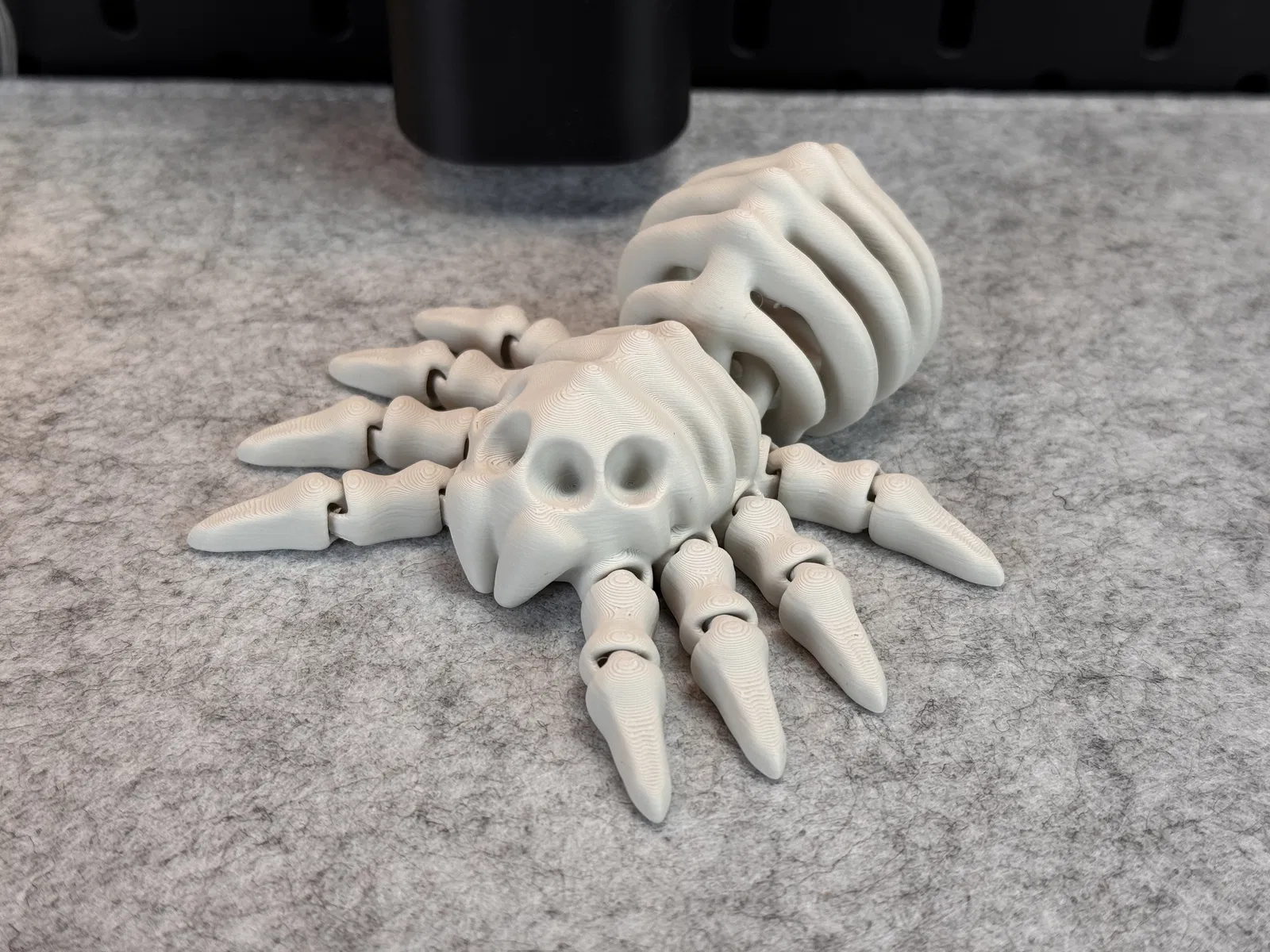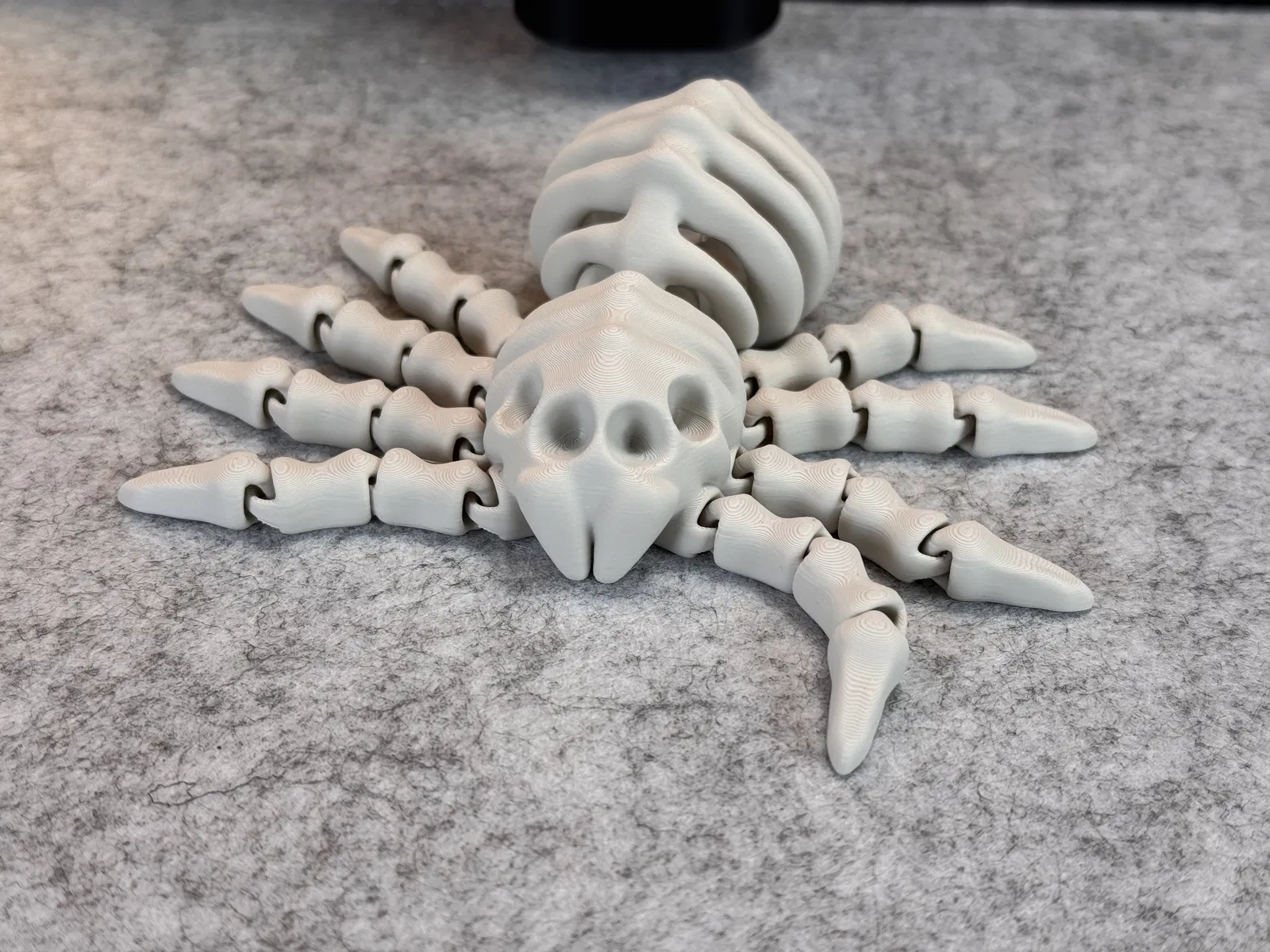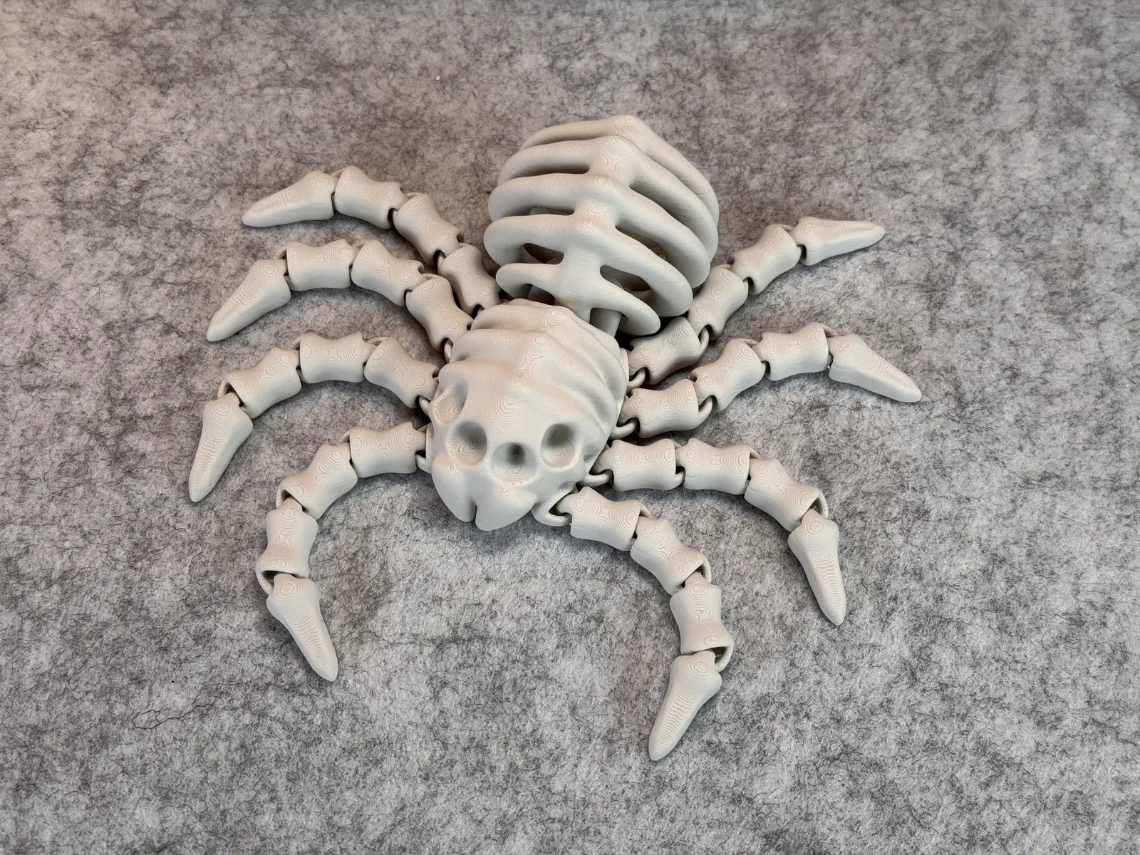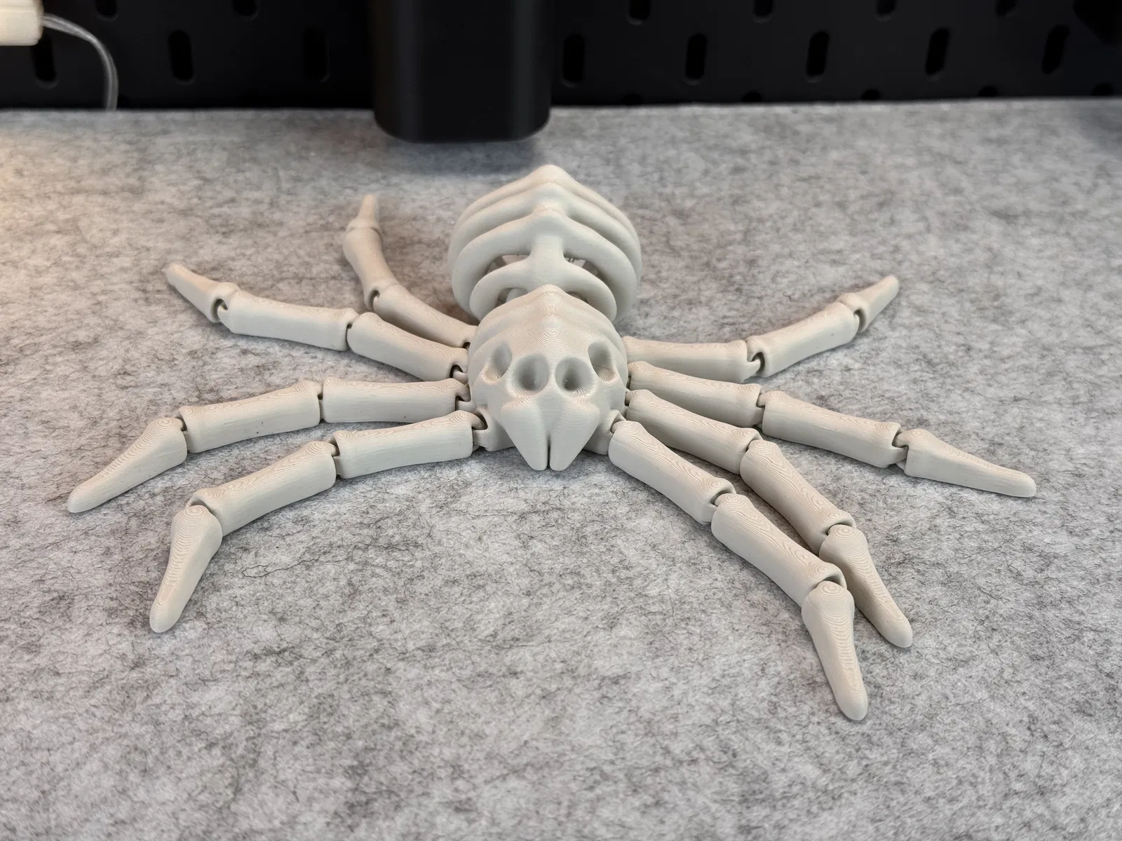 Nhện bộ xương co giãn (Phiên bản 2), có thể điều chỉnh khớp nối, có sẵn các kích cỡ S, M, L, XL. Bản in này yêu cầu chỉ dùng PLA, không cần support và có một số mẹo in để có kết quả tốt nhất. Cảnh báo an toàn về các bộ phận nhỏ và lực tác động.