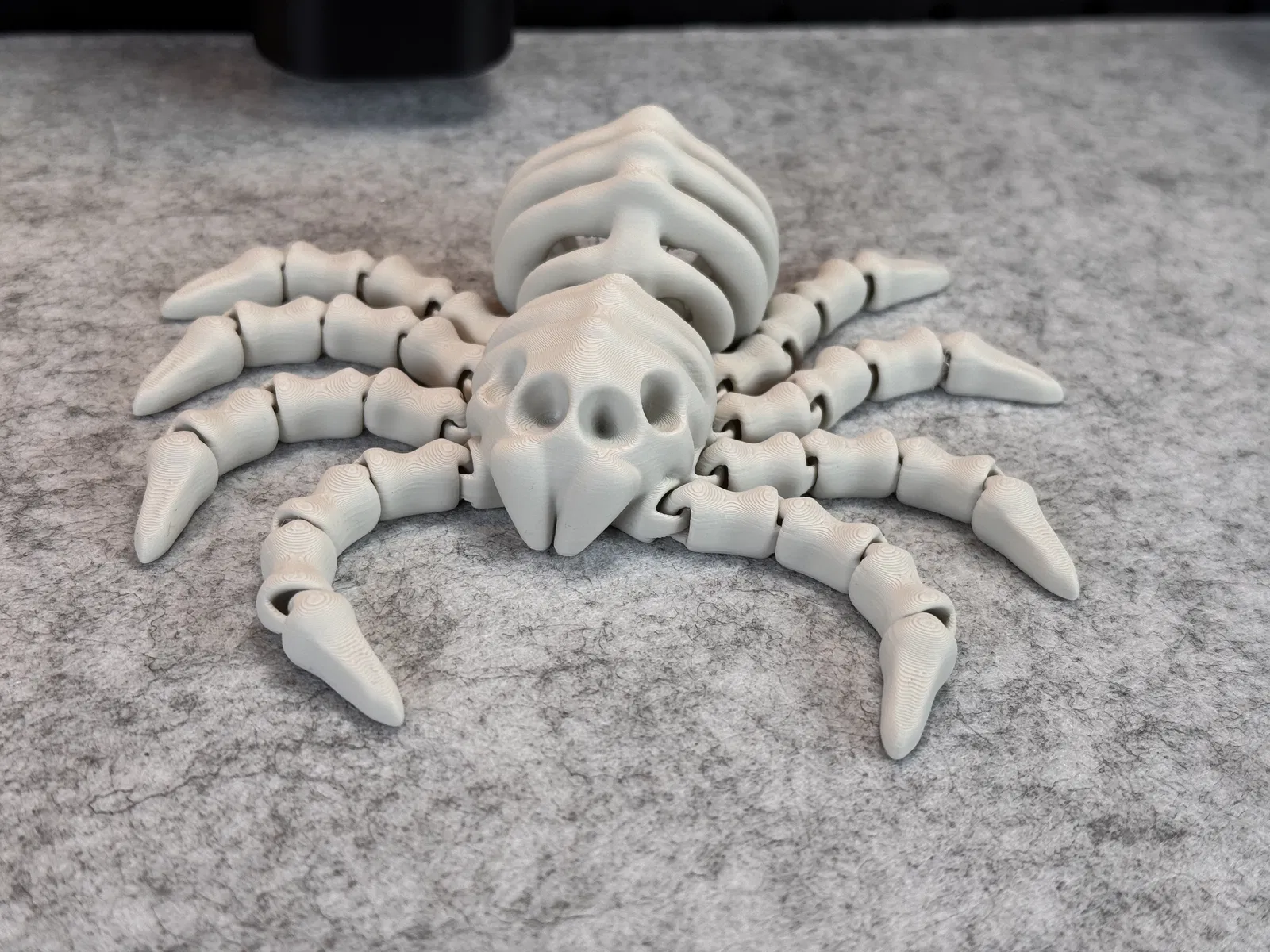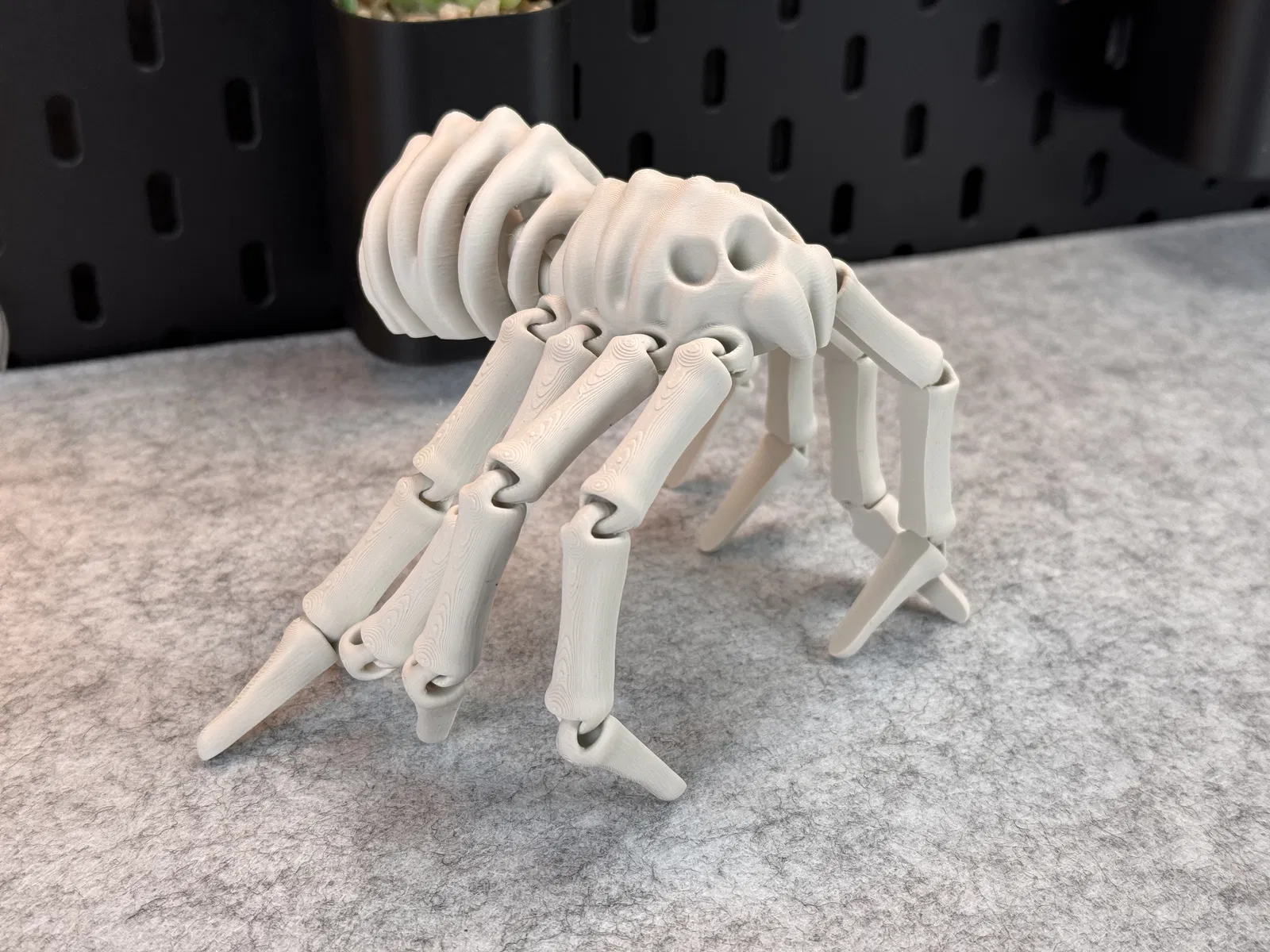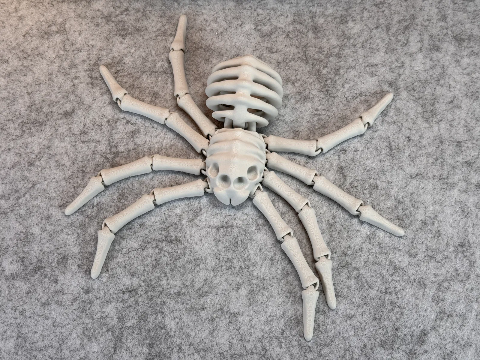 Nhện bộ xương co giãn (Phiên bản 2), có thể điều chỉnh khớp nối, có sẵn các kích cỡ S, M, L, XL. Bản in này yêu cầu chỉ dùng PLA, không cần support và có một số mẹo in để có kết quả tốt nhất. Cảnh báo an toàn về các bộ phận nhỏ và lực tác động.