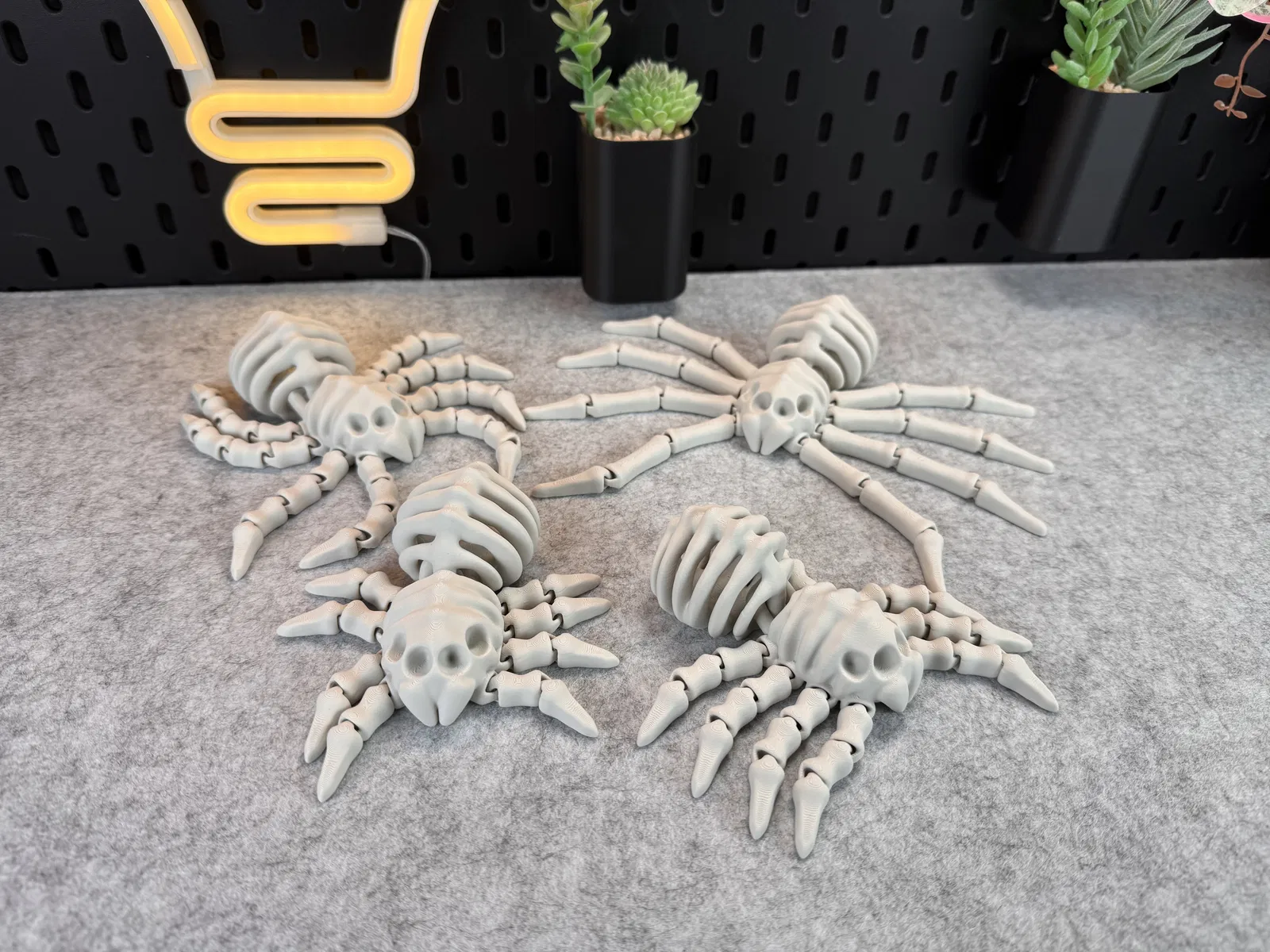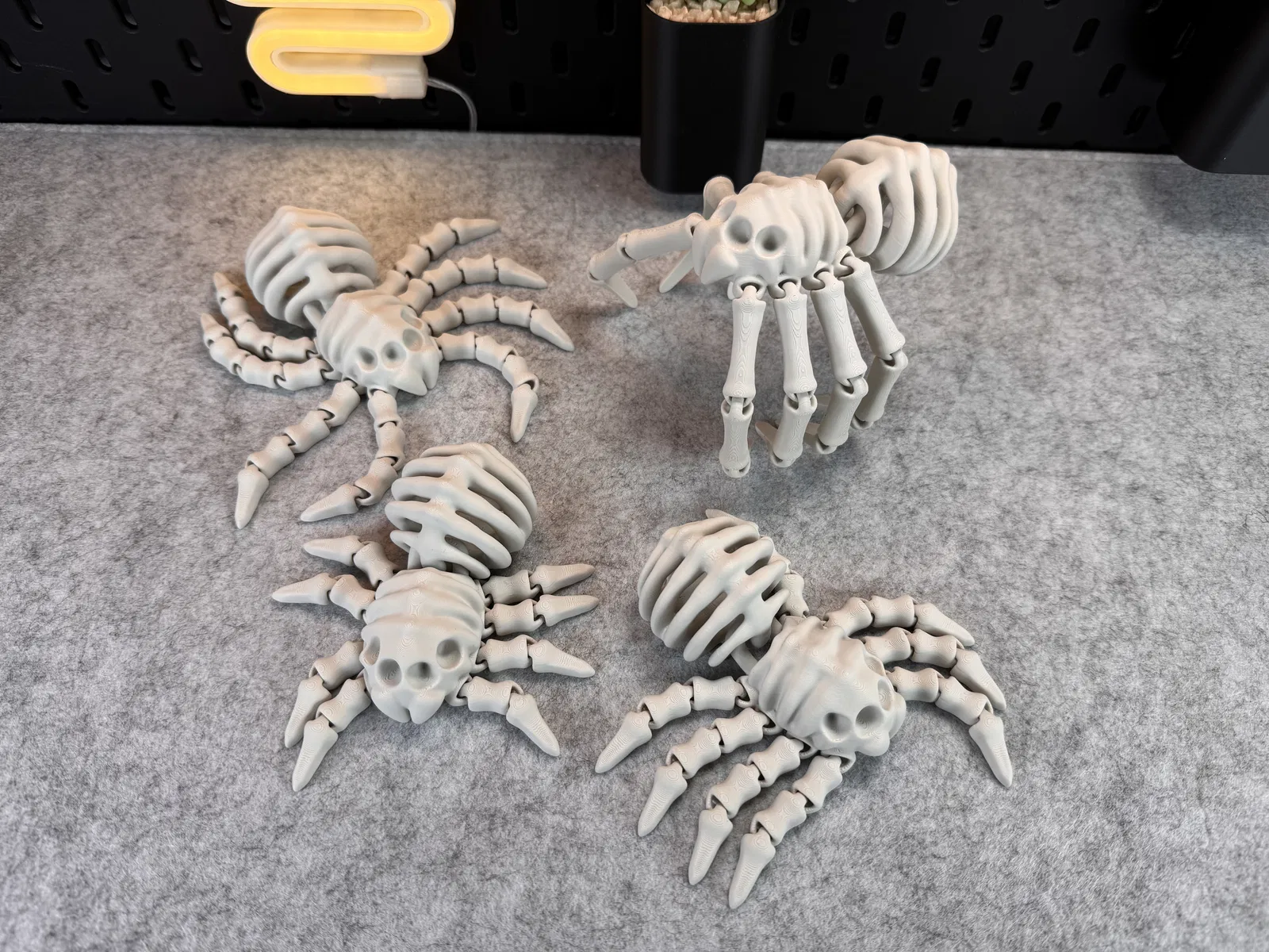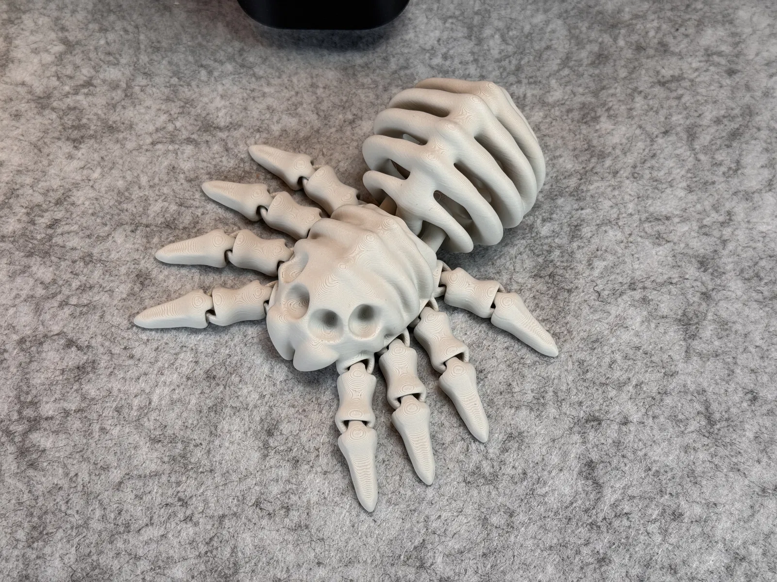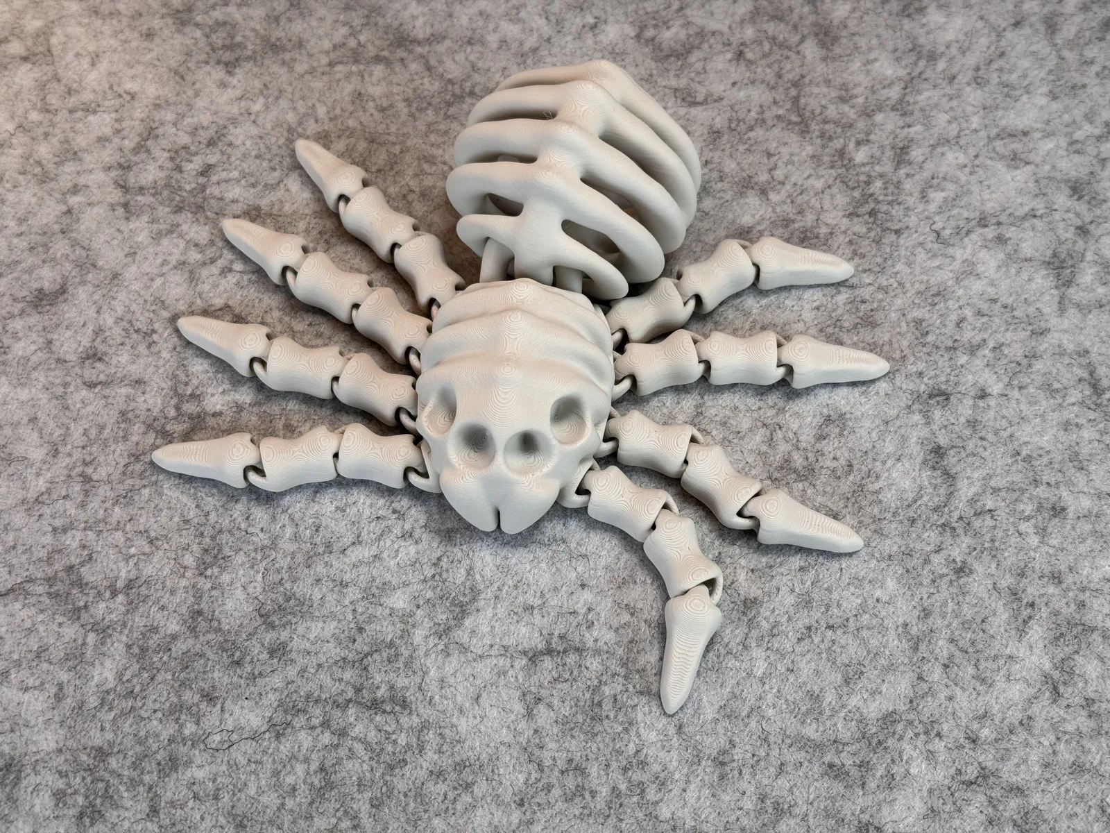 Nhện bộ xương co giãn (Phiên bản 2), có thể điều chỉnh khớp nối, có sẵn các kích cỡ S, M, L, XL. Bản in này yêu cầu chỉ dùng PLA, không cần support và có một số mẹo in để có kết quả tốt nhất. Cảnh báo an toàn về các bộ phận nhỏ và lực tác động.