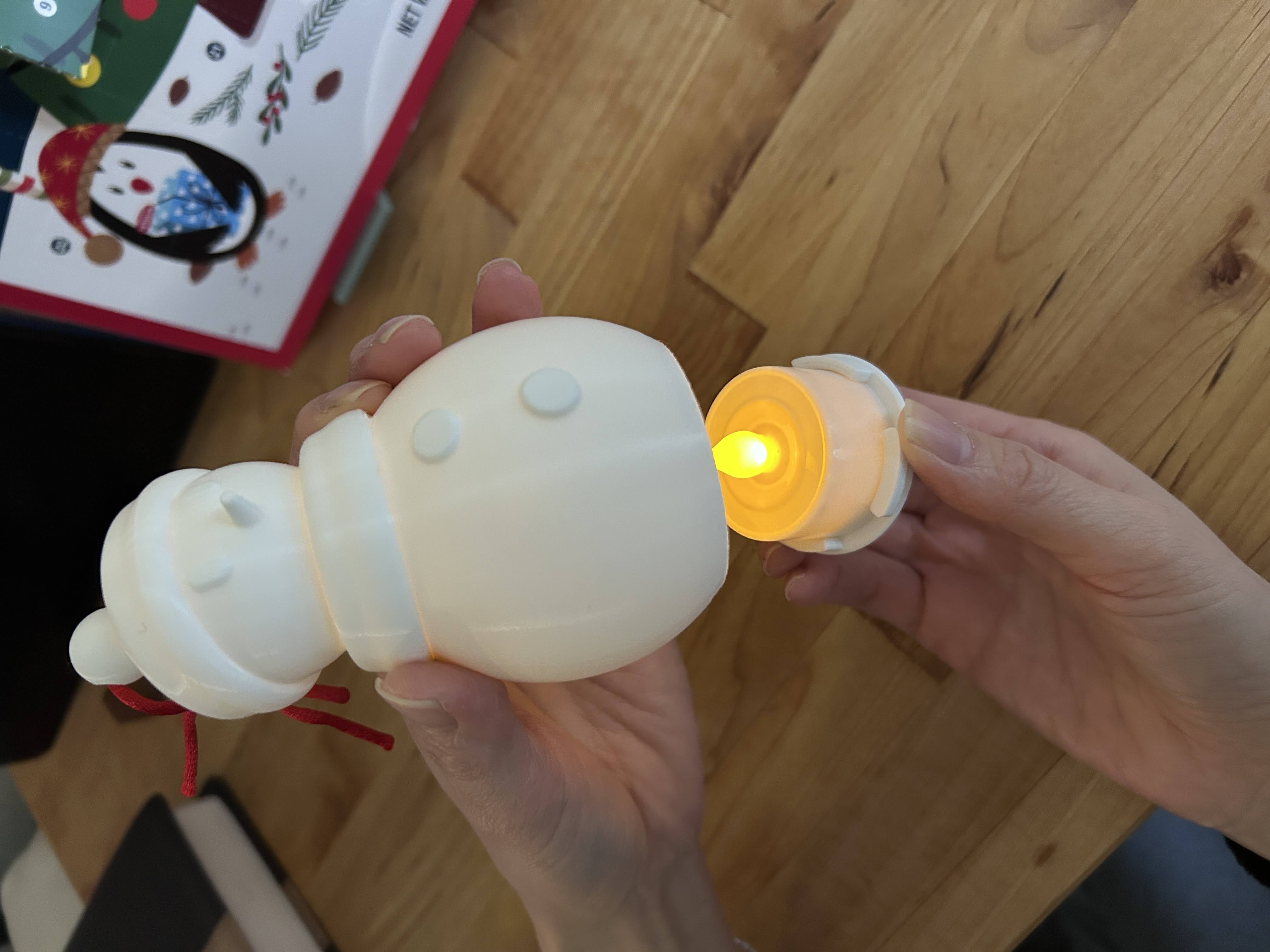 Ông già tuyết phát sáng in 3D, lung linh cùng đèn LED tealight, mang đến không gian ấm cúng mùa lễ hội. Dễ in, không cần hỗ trợ, món quà trang trí tuyệt vời.